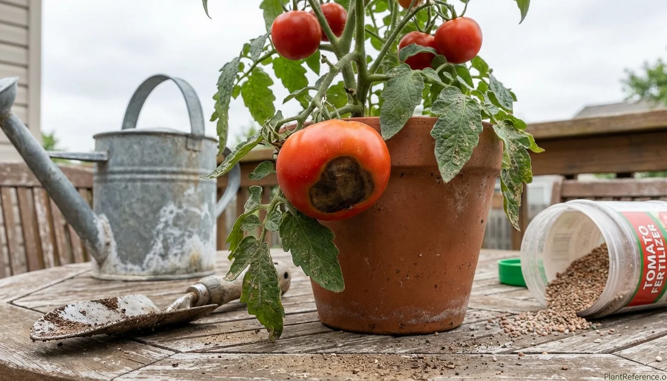 Dark sunken spots on your container tomato bottoms? That's blossom end rot from inconsistent watering and calcium issues. Learn the fast fixes that stop it now.