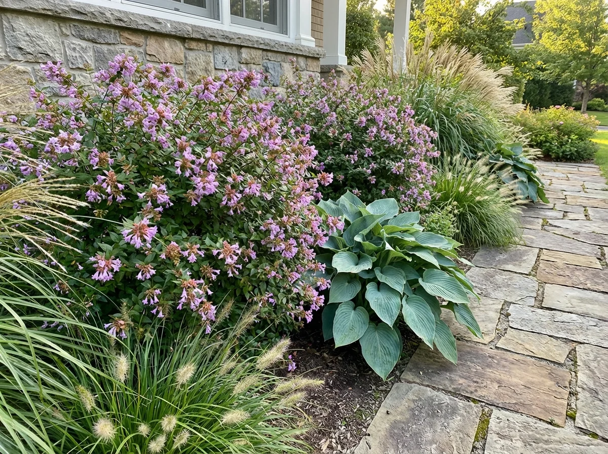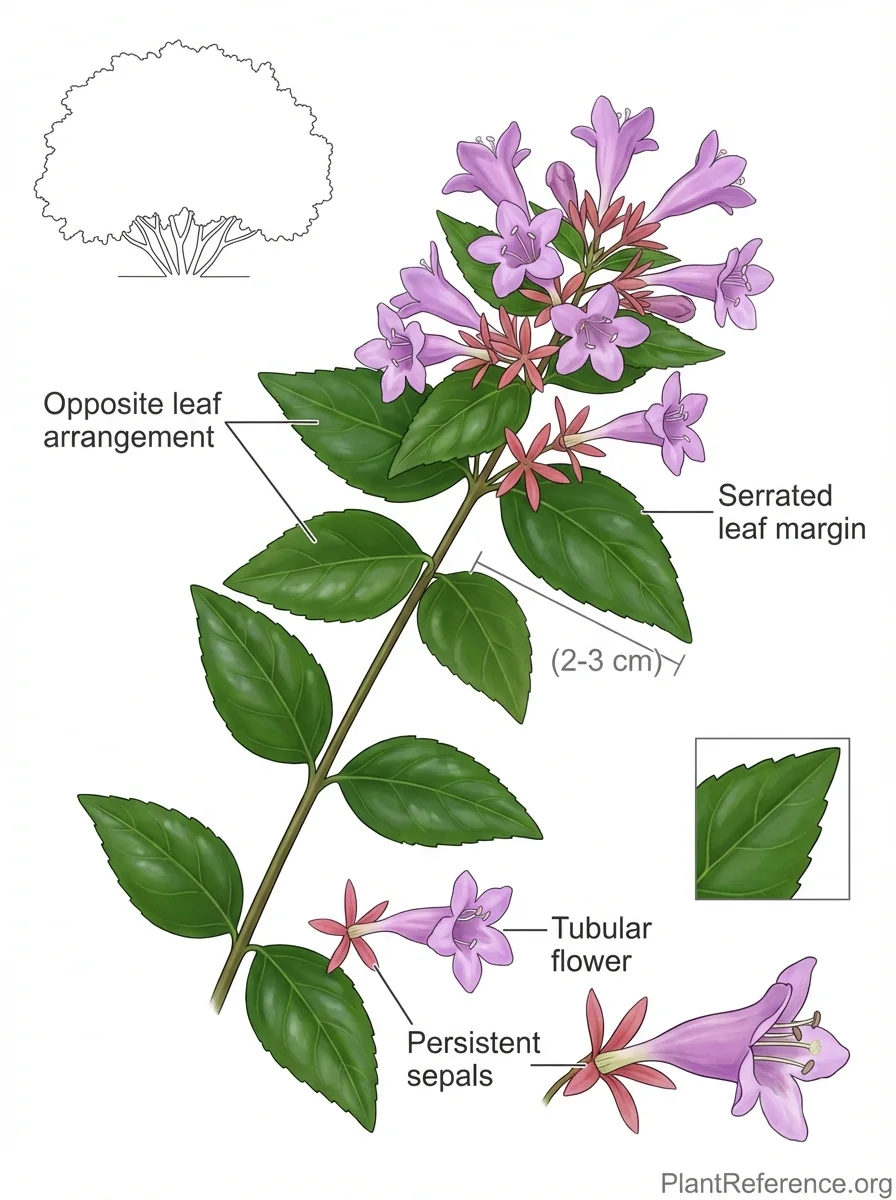 A semi-evergreen to deciduous shrub reaching 3–5 feet (0.9–1.5 m) tall with a similar or slightly wider spread. Branches arch in a fountain-like pattern, creating a mounded silhouette. Leaves opposite, ovate, 0.5–1.25 inches (1.3–3.2 cm) long, glossy, with finely serrated margins; new growth emerges bronze-tinted in spring, maturing to dark green. Foliage may develop purple-bronze tones in fall and persists through winter in zones 7–9, dropping in colder zones. Flowers tubular, five-lobed, approximately 0.75 inches (1.9 cm) long, lavender-pink, produced in clusters at stem tips from mid-July through October. Individual flowers are short-lived, but the pinkish-red persistent sepals remain after petals drop, extending ornamental interest into late fall. This cultivar is smaller and has a deeper pink flower than the species hybrid A. × grandiflora. Lower leaves may yellow and drop during extended drought. Spreads by suckering, which requires management in formal settings.