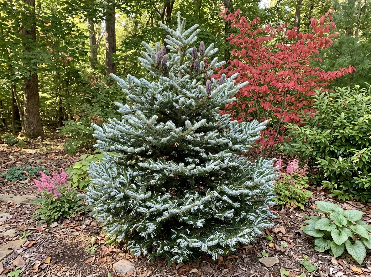 Not applicable — evergreen conifer. Purple-violet upright cones 2–3 inches (5–7 cm) produced from a young age. Cones sit upright and disintegrate on the tree. The silver-exposed recurved needles are the year-round feature.Detailed Descriptions