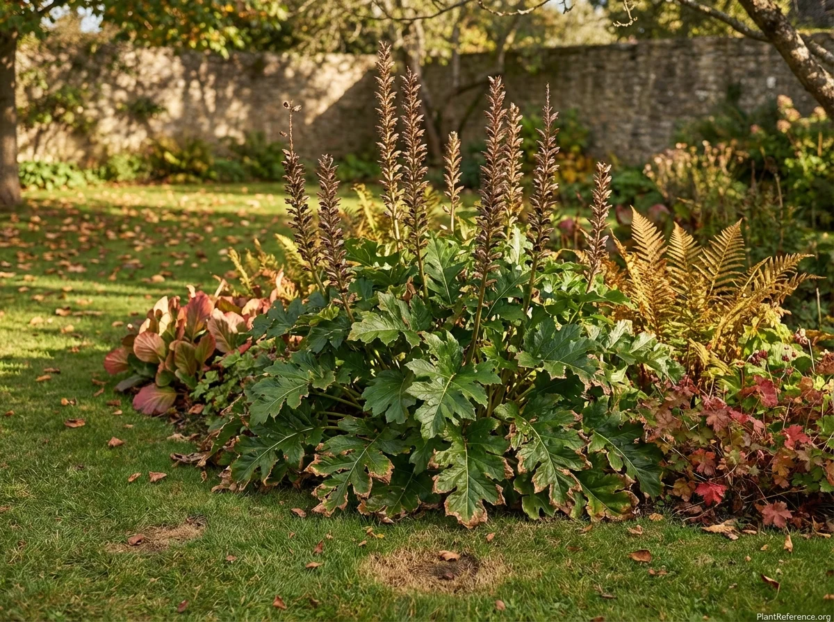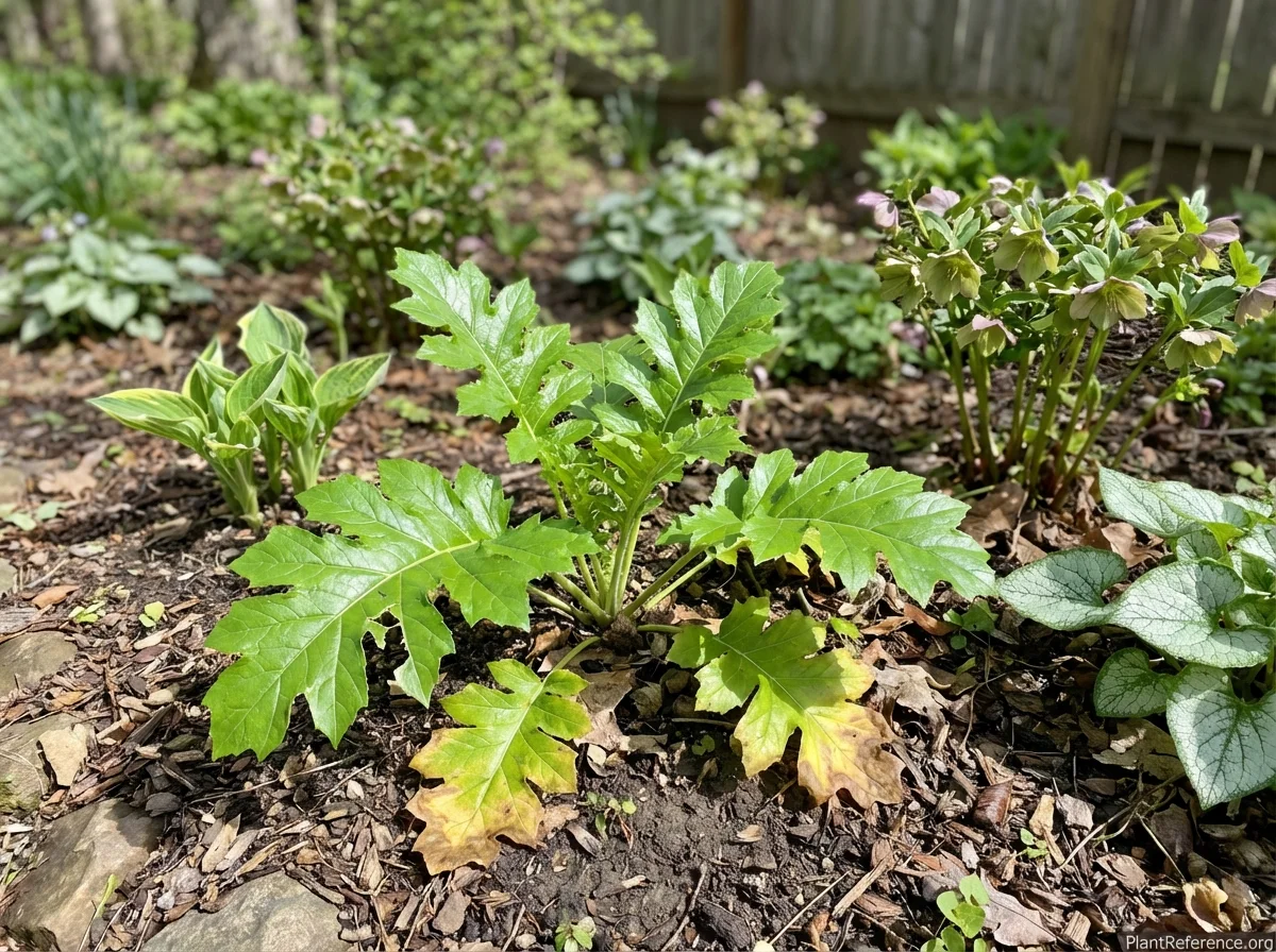 Commonly planted as a specimen in perennial borders or woodland garden edges at 3-4 foot (90-120 cm) spacing. The large leaf form provides strong textural contrast to fine-textured or small-leaved plants. Spreading rhizomatous habit makes it unsuitable near small or slow-growing plants it may overwhelm; more suitable at the back of borders or in isolated planting beds where spread can be managed.How to Identify
