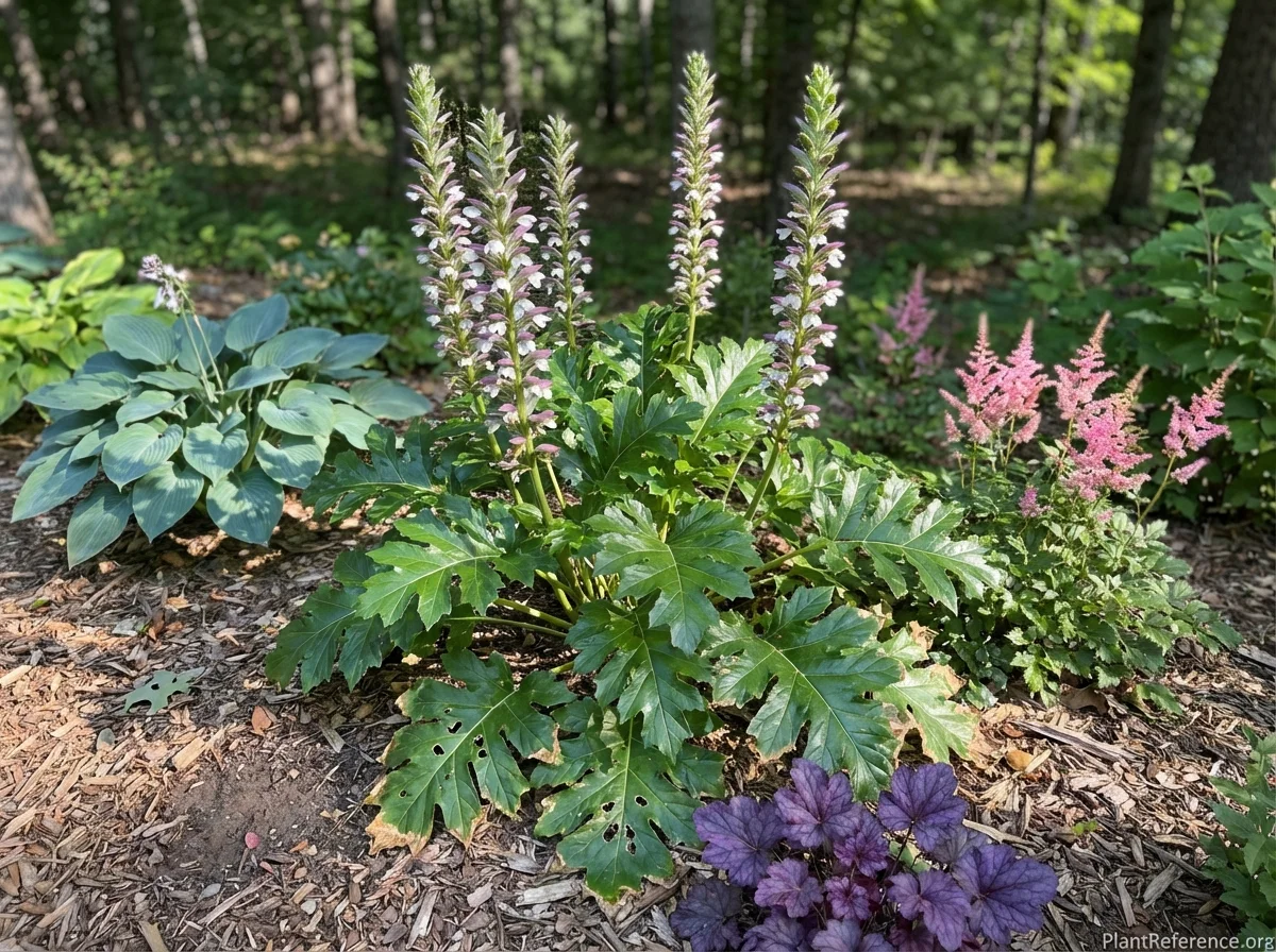 Acanthus mollis is a clump-forming herbaceous perennial in the Acanthaceae family, reaching 3-5 feet (90-150 cm) tall in bloom and 3-4 feet (90-120 cm) wide. Basal leaves are large, deeply pinnately lobed, and glossy dark green, measuring 18-24 inches (45-60 cm) long and 12-18 inches (30-45 cm) wide. Leaf lobes are rounded with shallow sinuses and spiny-tipped. Flower spikes emerge in late spring to early summer, rising 3-5 feet (90-150 cm), each bearing tubular two-lipped flowers with white lower lips and hooded purple-green upper bracts. Individual flowers are 1.5-2 inches (4-5 cm) long. Plant spreads by creeping rhizomes and fleshy roots; once established, removal is difficult because root fragments regenerate. In zones 7 and warmer, the plant is nearly evergreen; in zones 6 and colder, foliage dies back in winter. Clumps expand slowly during the first 1-2 years, then spread more rapidly once roots are established. Siting in afternoon shade in zones 8-9 reduces leaf scorch in summer.