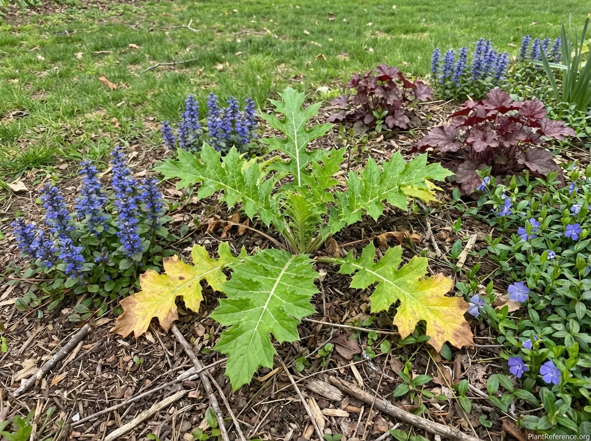 Planted in perennial borders, gravel gardens, Mediterranean-style plantings, and dry slopes at 2–3 foot (60–90 cm) spacing. The spiny foliage and bracts deter browsing by deer and rabbits in most conditions. The spreading habit requires management near paths, patios, and lawn edges. Not suited to small formal gardens where containment of rhizomes is difficult.How to Identify