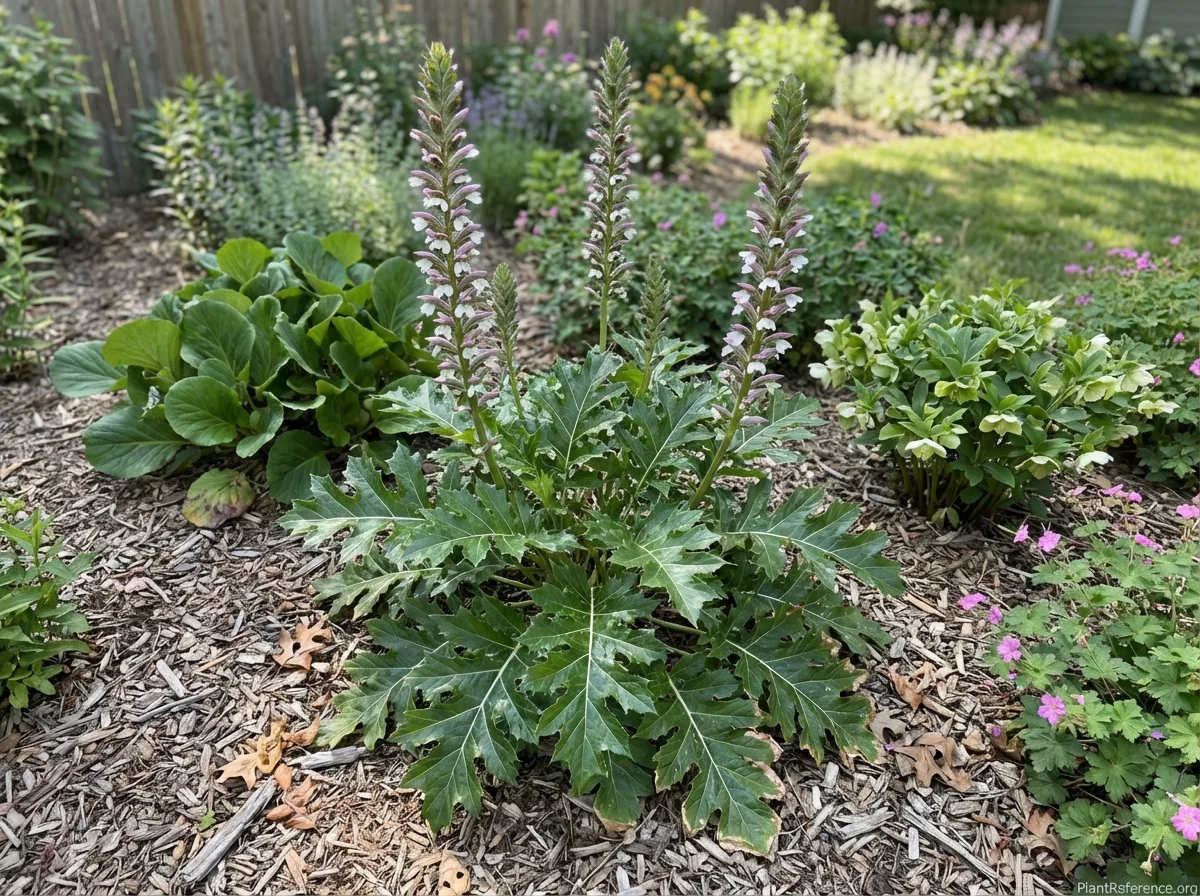 Plant in well-drained soil; A. spinosus tolerates dry, poor, or rocky soils better than A. mollis once established. Water weekly during the first growing season. Established plants tolerate dry spells of 2–3 weeks and perform in dry-summer Mediterranean-climate regions. The rhizomatous root system spreads in moist, fertile soils; root fragments left during removal regenerate new growth. Leaf and bract spines cause skin punctures on contact. Slugs and snails feed on new spring growth. In zone 5, mulch the root zone with 4–6 inches (10–15 cm) in fall to improve winter survival. Divide every 5 years or when flowering decreases.Pruning