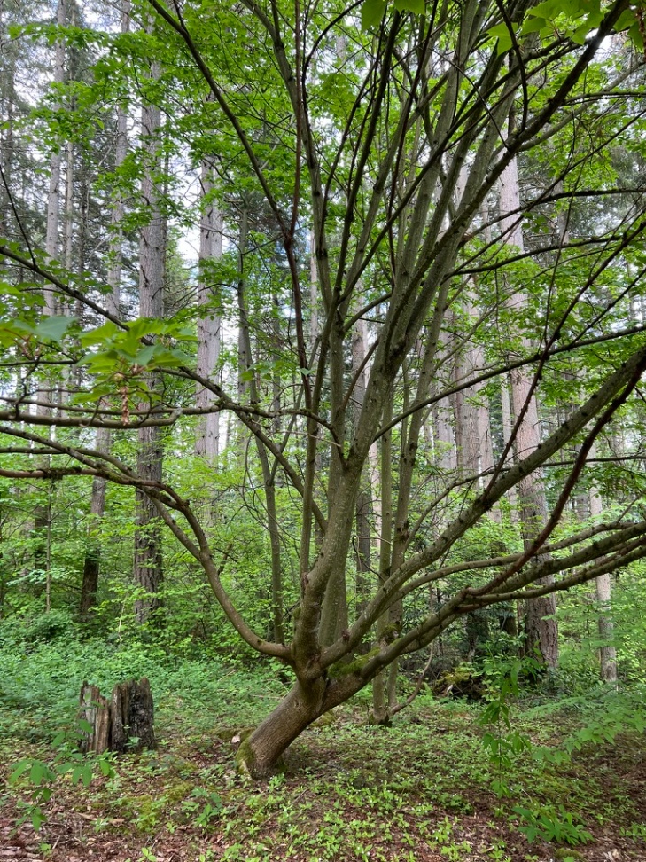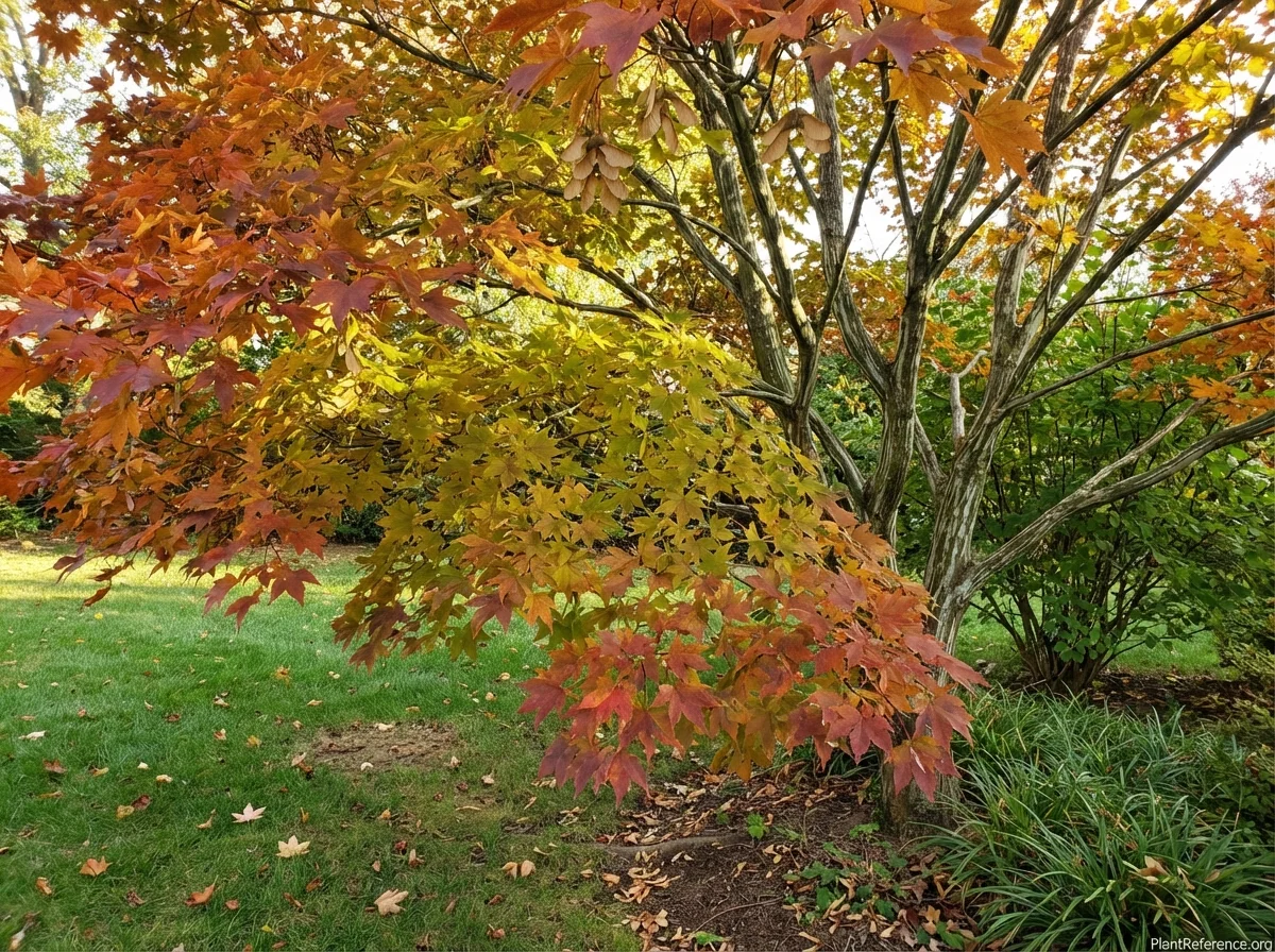 A medium-sized deciduous tree reaching 20–35 feet (6–11 m) tall and 15–25 feet (4.5–7.5 m) wide at maturity. The most distinctive feature is the bark: smooth and green on young stems, developing vertical white striations with age that persist year-round. Leaves are ovate to oblong, 3–5 inches (8–13 cm) long with three shallow lobes and serrated margins, emerging with bronze tints in early spring, maturing to glossy mid-green through summer. Fall color varies from yellow to orange-red and is moderate in intensity compared to many maples. Pendant clusters of small yellow-green flowers appear in spring before or with the leaves. Paired winged samaras ripen in late summer. Growth rate is moderate, adding 12–18 inches (30–45 cm) per year when young. In maritime climates the bark striping is more pronounced than in continental climates with hotter summers. Lower branches may be retained close to the ground without training.