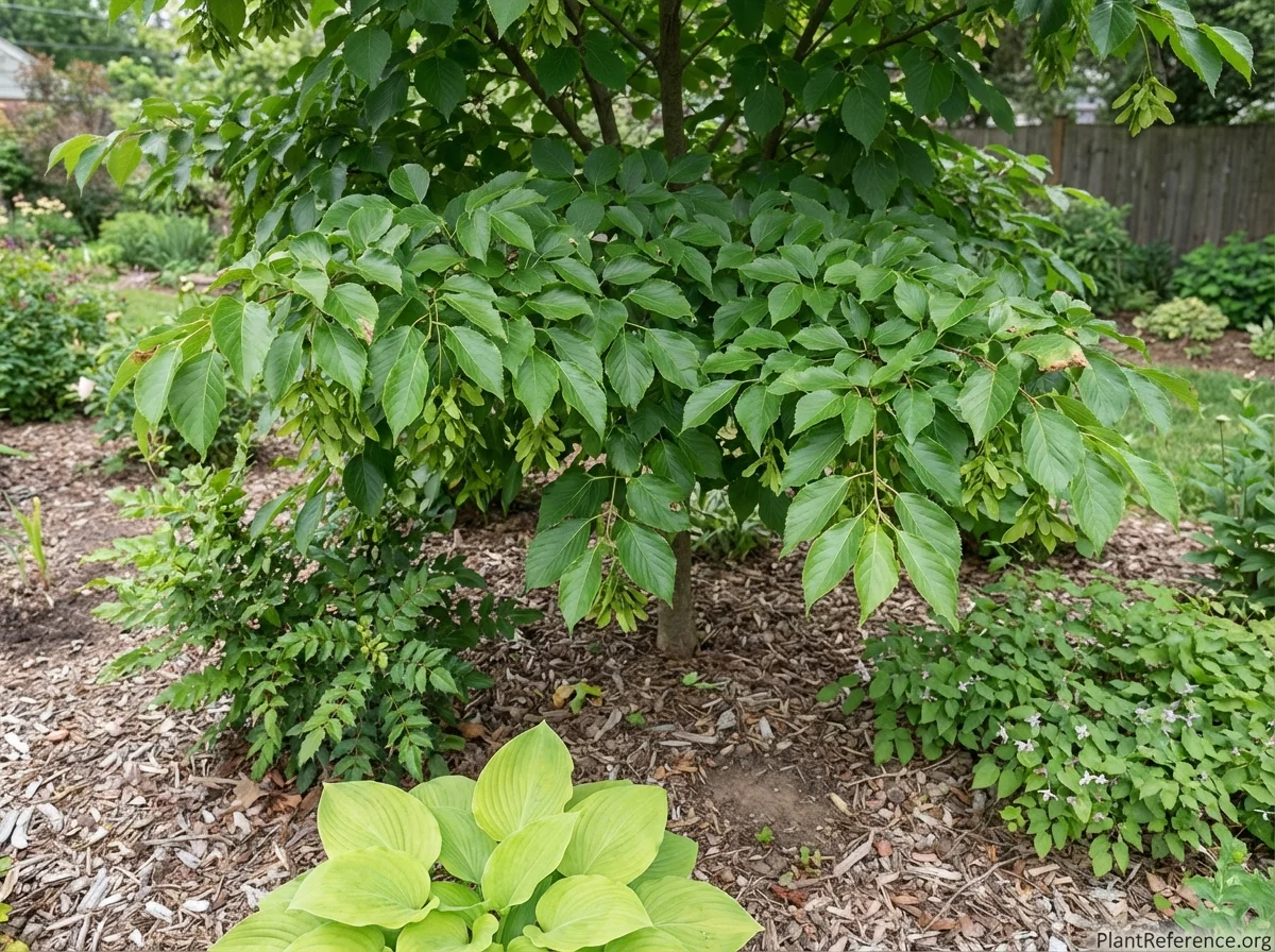 Water young trees deeply once per week during the first two growing seasons in the absence of rain; established trees tolerate moderate drought but show leaf scorch during extended dry periods exceeding 3–4 weeks in summer. Apply 2–3 inches (5–8 cm) of organic mulch over the root zone, keeping it clear of the trunk, to moderate soil temperature and retain moisture. No fertilization is typically needed in average garden soils; excess nitrogen encourages soft growth susceptible to frost damage. Verticillium wilt can affect this species; avoid planting in soil where susceptible plants have previously died from the disease. Aphids may colonize new growth in spring but rarely cause lasting damage. Trees planted in sites with afternoon shade in zones 7–8 retain better bark color and suffer less leaf scorch than those in full sun.Pruning