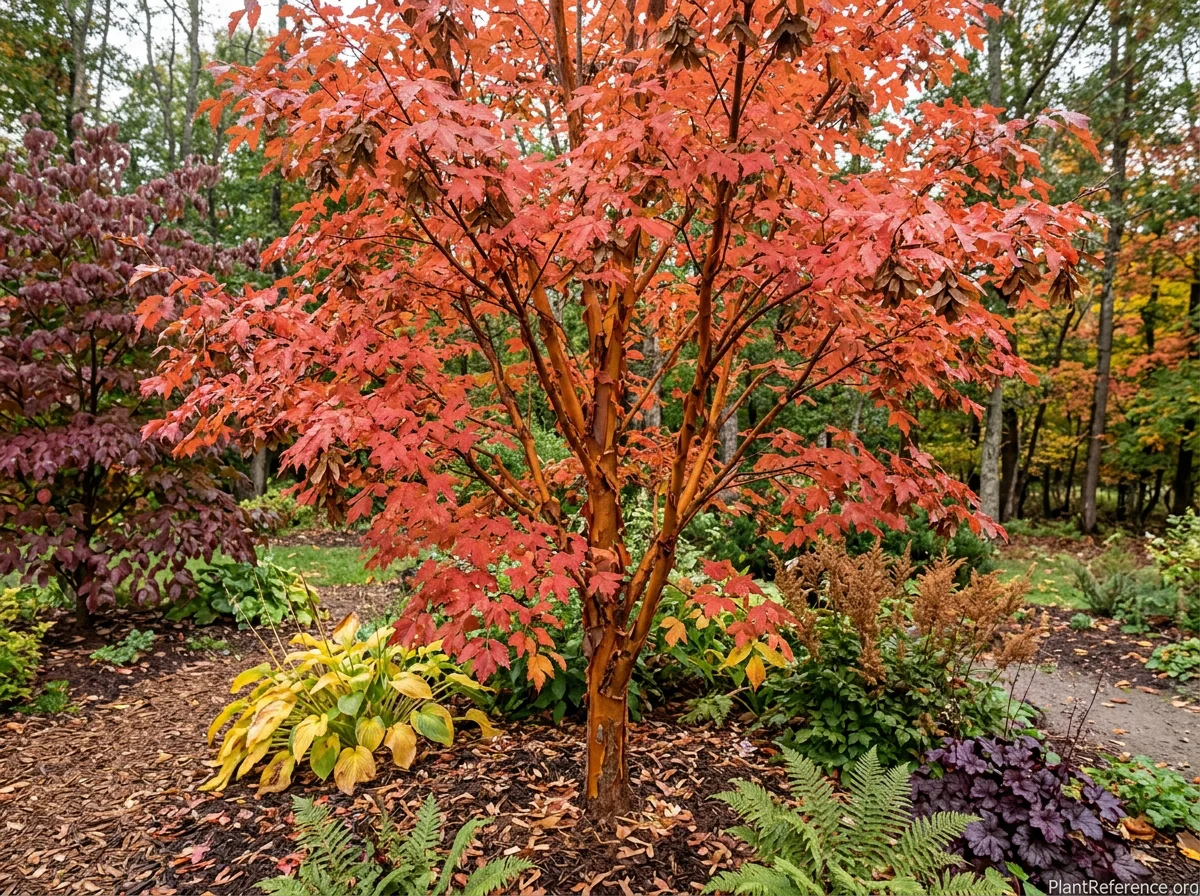 Acer griseum is paperbark maple, an upright deciduous tree growing 20-30 feet (6-9 m) tall and 15-25 feet (4.5-7.5 m) wide. Cinnamon to copper-orange bark that exfoliates in thin papery curling sheets — visible year-round. The bark exfoliation intensifies on wood 3+ years old and is the species' defining visual trait. Dark green trifoliate compound leaves with serrated margins, each leaflet 1.5-3 inches (4-7 cm) long. Orange to red-scarlet fall color. Inconspicuous yellow-green flowers 0.25 inch (6 mm) in small pendant clusters in early spring (April-May). In Sapindaceae. Native to central China — mountain forests at 4,000-6,500 feet (1,200-2,000 m). Collected by Ernest Henry Wilson in Hubei, China (1901). Slow-growing — 6-12 inches (15-30 cm) of height per year. Low seed viability (typically under 5%) makes propagation difficult and nursery stock relatively expensive compared to other small maples. This slow growth rate and limited availability are the primary practical limitations. Not drought-tolerant — requires consistent moisture; leaf scorch occurs in dry or exposed sites. Deer browse the foliage. Non-toxic. Zones 4-8. Full sun to partial shade. Growth rate is slow.