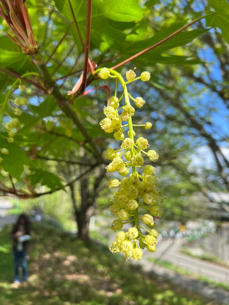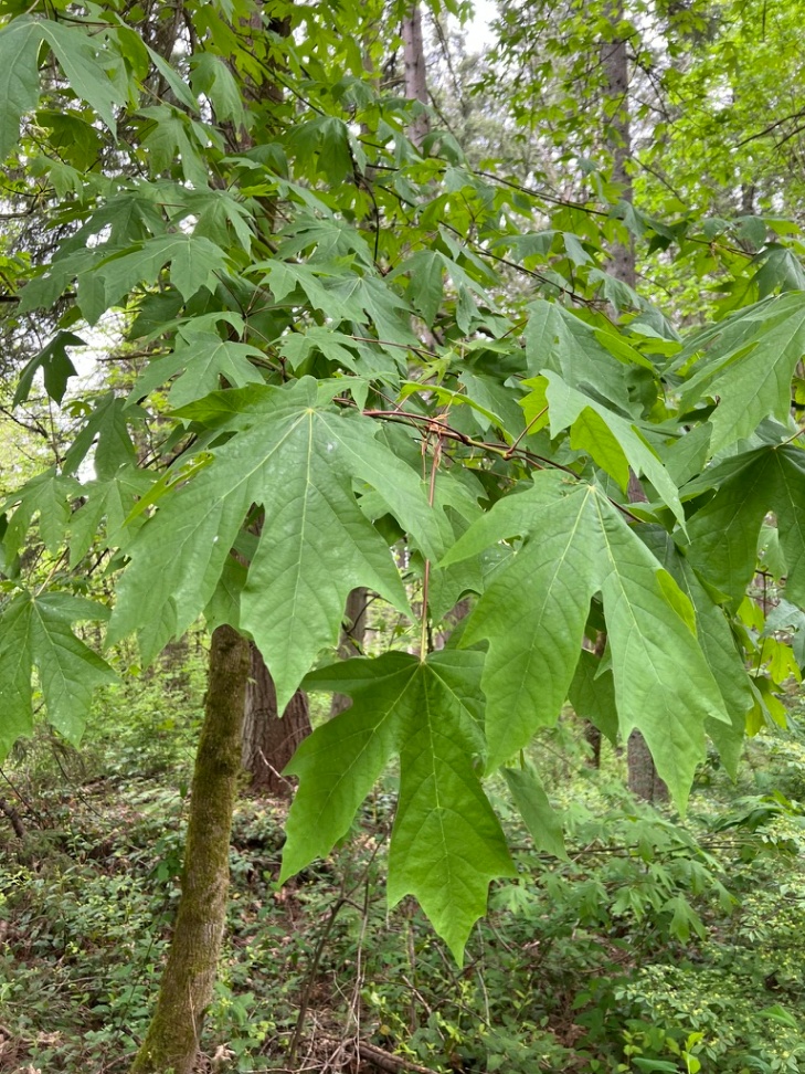 Acer macrophyllum is a large deciduous tree reaching 50–100 feet (15–30 m) tall and 30–50 feet (9–15 m) wide at maturity, with a broad, rounded crown. Leaves are palmate with 3–5 deeply cut lobes, 6–12 inches (15–30 cm) across — the largest leaves of any maple species — dark green above and pale green beneath, turning yellow to golden yellow in fall. Bark is gray-brown and furrowed on mature trees; younger branches are smooth and gray-green. In April, pendulous clusters of yellow-green flowers 4–6 inches (10–15 cm) long appear before or with the leaves. Winged samaras, 1.5–2 inches (4–5 cm) long, are produced in pairs and ripen in fall. In moist, shaded conditions, the bark and larger branches commonly support mosses, lichens, and epiphytic ferns, including licorice fern (Polypodium glycyrrhiza). Growth rate is fast in youth, 2–3 feet (60–90 cm) per year in favorable sites; slowing with age. Surface roots become prominent under paved areas and in compacted soils, potentially damaging infrastructure. The tree requires considerable space and is unsuitable for small lots.