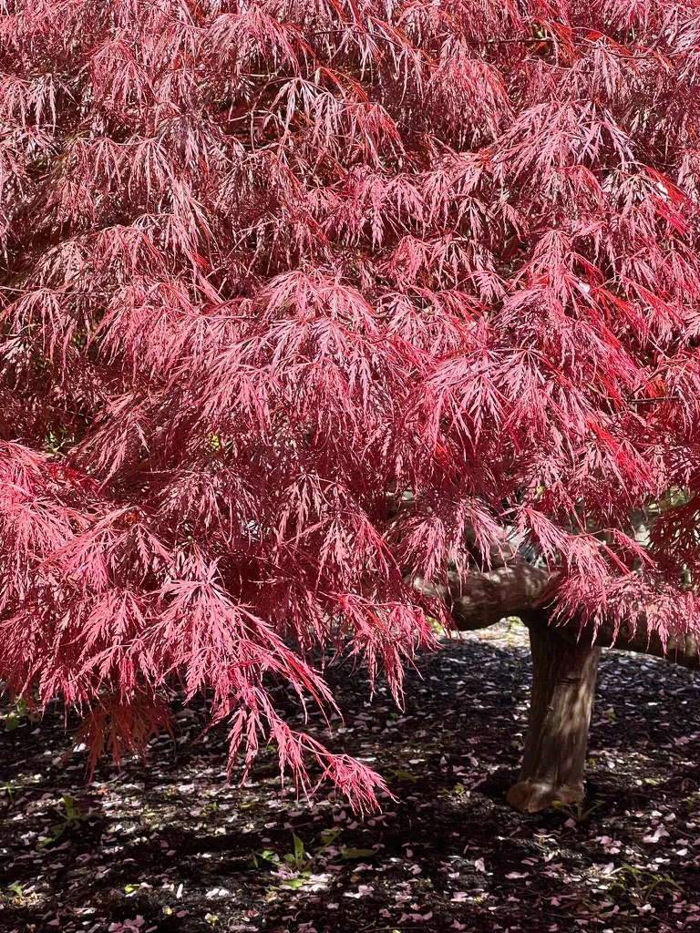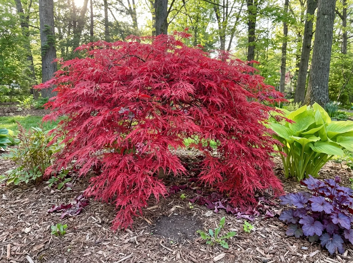 Water weekly during the first 2–3 growing seasons; fine leaf segments scorch faster than broader-lobed Japanese maples under moisture stress. Apply 2–3 inches (5–8 cm) of mulch from the drip line inward, keeping 4–6 inches (10–15 cm) clear of the graft union at the base. Site in afternoon shade in zones 7 and warmer to reduce leaf scorch; morning sun plus afternoon shade produces good red color and reduces damage. Remove any shoots that emerge below the graft union (indicated by larger, undissected leaves) immediately by cutting them at their point of origin. Verticillium wilt can cause sudden branch dieback; no cure exists — remove affected limbs and avoid root zone disturbance. Avoid high-nitrogen fertilizers, which promote soft growth vulnerable to frost damage.Pruning
