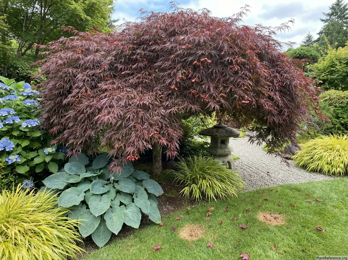 Planted as a specimen in Japanese-style gardens, mixed shrub borders, rock gardens, and near water features where the cascading red foliage provides season-long color contrast. Used in containers of at least 25 gallons (95 L) with protection from afternoon sun in zones 7 and warmer. Allow 6–10 feet (1.8–3 m) horizontal clearance for mature spread. Grafted plants should be inspected annually for rootstock shoot emergence.How to Identify