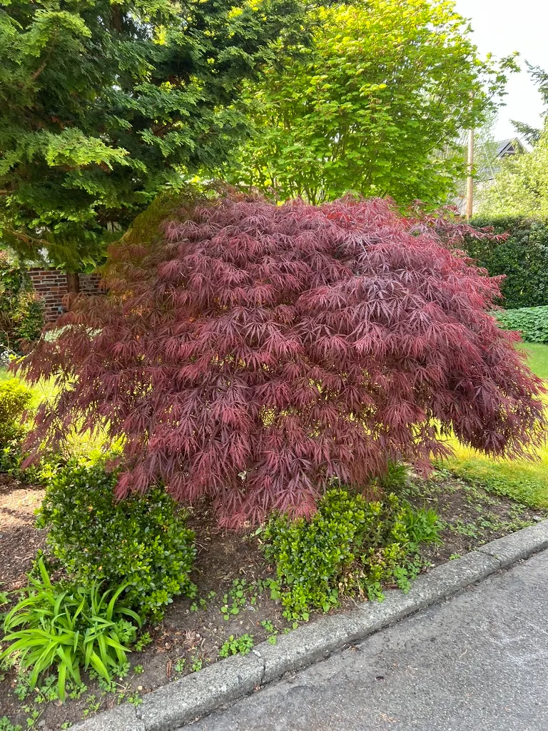Acer palmatum var. dissectum 'Dissectum Atropurpreum' is a weeping, mounding cultivar of laceleaf Japanese maple with red-purple dissected foliage. Plants typically reach 4–8 feet (1.2–2.4 m) tall and 6–10 feet (1.8–3 m) wide at maturity, forming a broad cascading mound — somewhat smaller than green-leaved dissectum forms. Leaves are palmate with 7–9 lobes, each lobe deeply cut into narrow, toothed segments, 2–4 inches (5–10 cm) across; the overall texture is fine and feathery. Foliage emerges dark red-purple in spring, holds burgundy tones through summer, and intensifies to bright crimson or red-orange in fall. Sun exposure affects summer color: full sun produces darker, richer red tones; part shade may cause tones to shift toward red-green by late summer. Small red-purple flowers appear in spring. Growth rate is slow — typically 3–6 inches (8–15 cm) per year for the first several years, accelerating slightly once established. The fine leaf segments are susceptible to margin scorch in hot, dry, or windy conditions. This cultivar is propagated by grafting onto seedling rootstock; occasional vigorous shoots arising below the graft union (from rootstock) should be removed promptly.