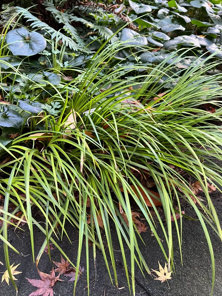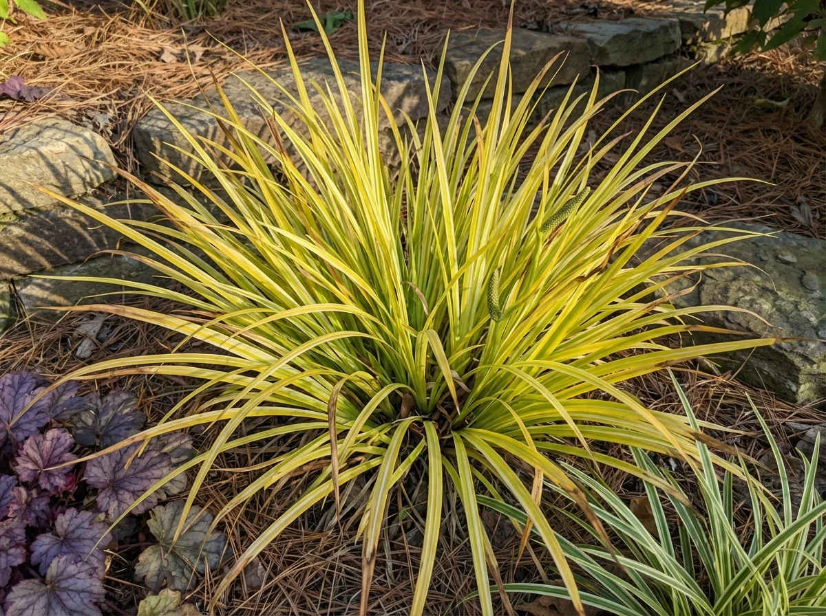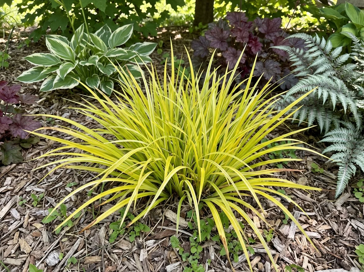 Acorus gramineus 'Ogon' is a distinctive, evergreen, grass-like perennial that brings exceptional textural interest and luminous color to Pacific Northwest gardens. This Japanese selection features striking golden-yellow foliage with subtle green striping that brightens shady corners and waterside plantings throughout the year. Unlike many variegated plants that may struggle in the region's limited winter light, 'Ogon' maintains its vibrant coloration even during the Pacific Northwest's gray winters, offering a welcome highlight in the garden when other plants have gone dormant. Its low-growing habit and tolerance of consistently moist soils make it particularly valuable for rain gardens, pond margins, and stream edges throughout western Washington and Oregon, where it harmonizes beautifully with native riparian plants while adding year-round structure and color.