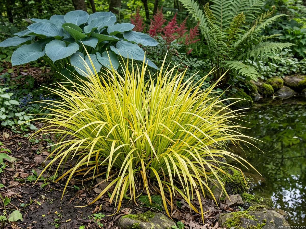 Plant in consistently moist to wet soil in partial shade, spacing 10–12 inches (25–30 cm) apart for a continuous mat within 2–3 years. Tolerates full shade but golden colour is strongest with 2–4 hours of morning sun. In full sun, maintain constantly saturated soil to prevent leaf tip burn. Amend planting sites with compost to increase water retention. Supplemental irrigation is required during Pacific Northwest summer dry periods — do not allow the rootzone to dry. Apply 1 inch (2.5 cm) of compost mulch annually in spring. Division every 3–4 years in early spring maintains vigour.Pruning