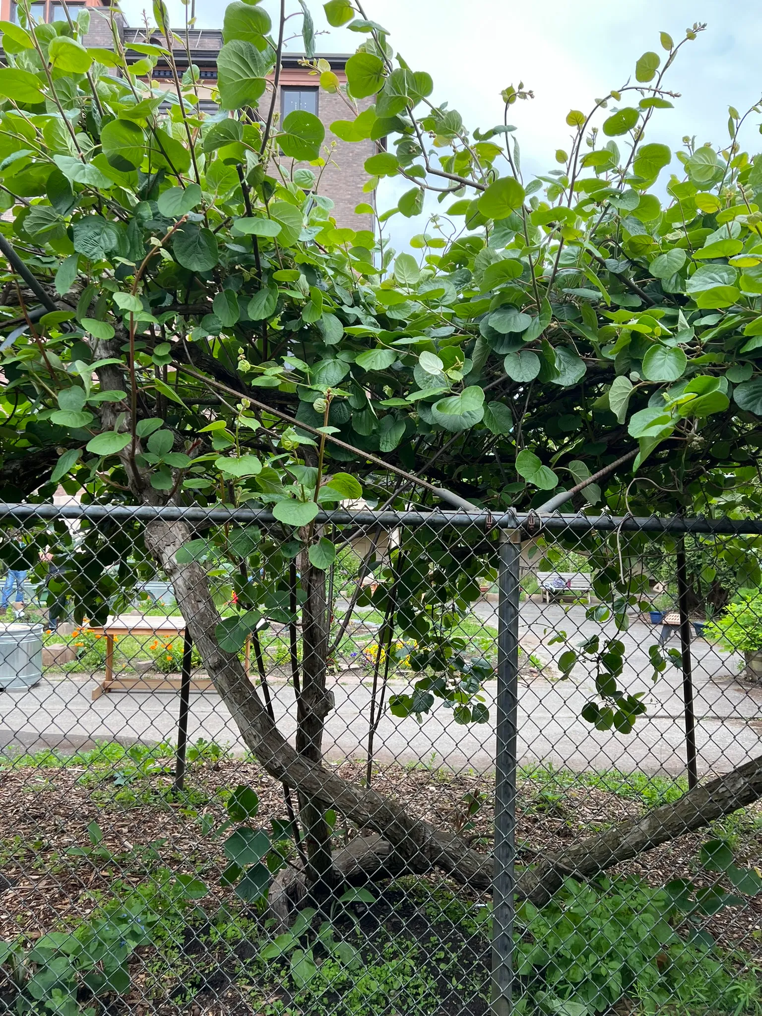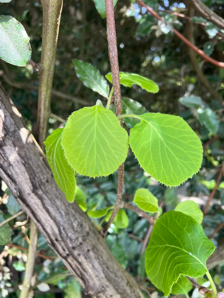 Actinidia deliciosa is a vigorous deciduous twining vine reaching 20–30 feet (6–9 m) or more in length when grown on a support structure. Leaves are broadly oval to heart-shaped, 3–5 inches (8–13 cm) long, dark green above with reddish-brown woolly hairs on the underside and on young stems and petioles. The vine has no tendrils, climbing entirely by twining its stems around supports. In May through June, white flowers 1–2 inches (2.5–5 cm) across with prominent yellow stamens appear in small clusters on the current season's growth. The plant is dioecious: male and female flowers are on separate plants, and at least one male plant is required within 50 feet (15 m) of female plants for fruit production. Fruit is the familiar fuzzy brown kiwifruit, 2–3 inches (5–8 cm) long, with bright green flesh and small black seeds. Fruit ripens October through November, typically 3–5 years after planting. Annual pruning is essential for maintaining productive fruiting wood. Growth is fast once established — 6–10 feet (1.8–3 m) per season — and the vine can overwhelm lightweight supports. Requires a sturdy pergola, trellis, or arbor rated for significant weight. In the Pacific Northwest west of the Cascades, the mild climate is well-suited to kiwi production.
