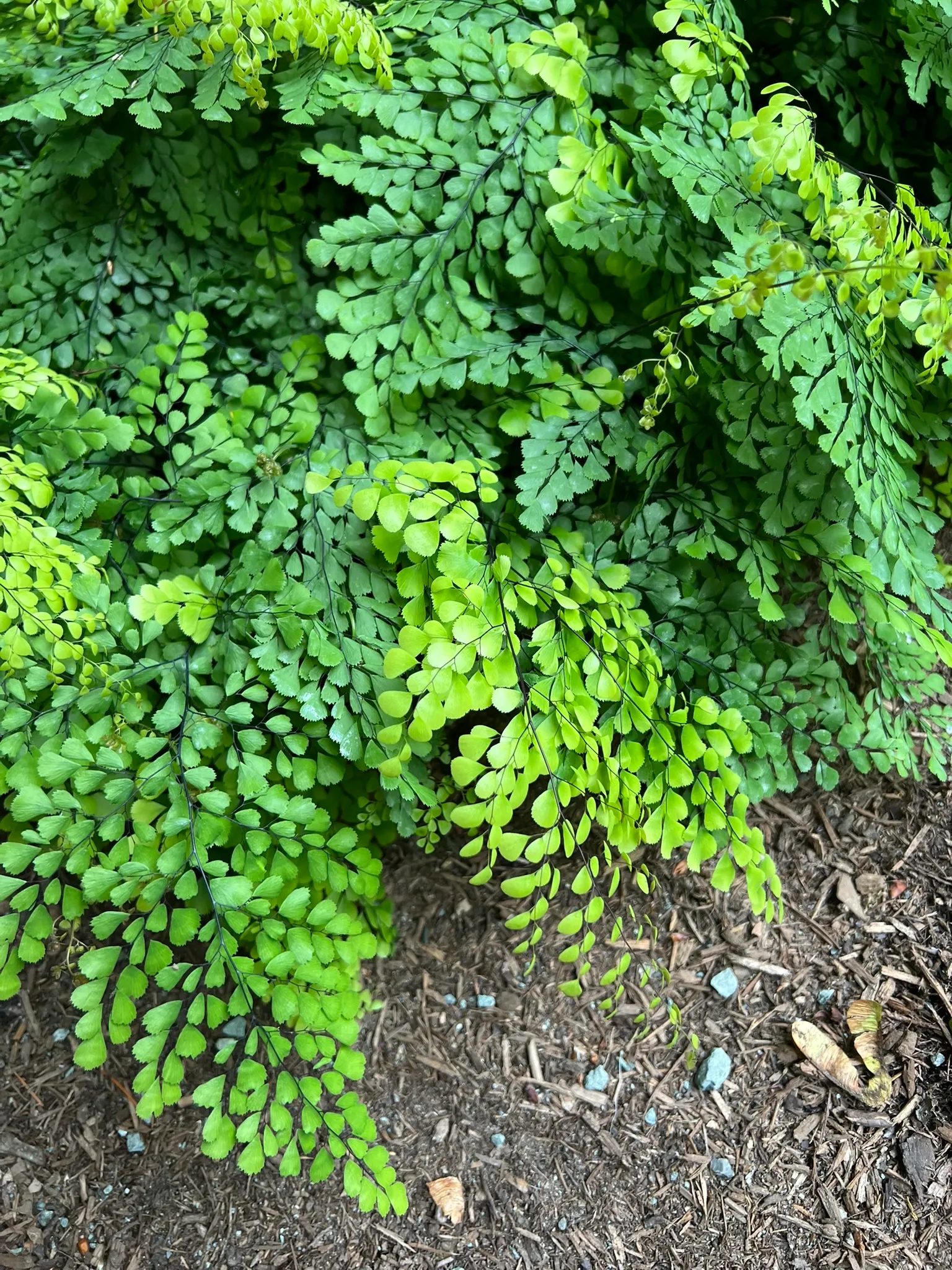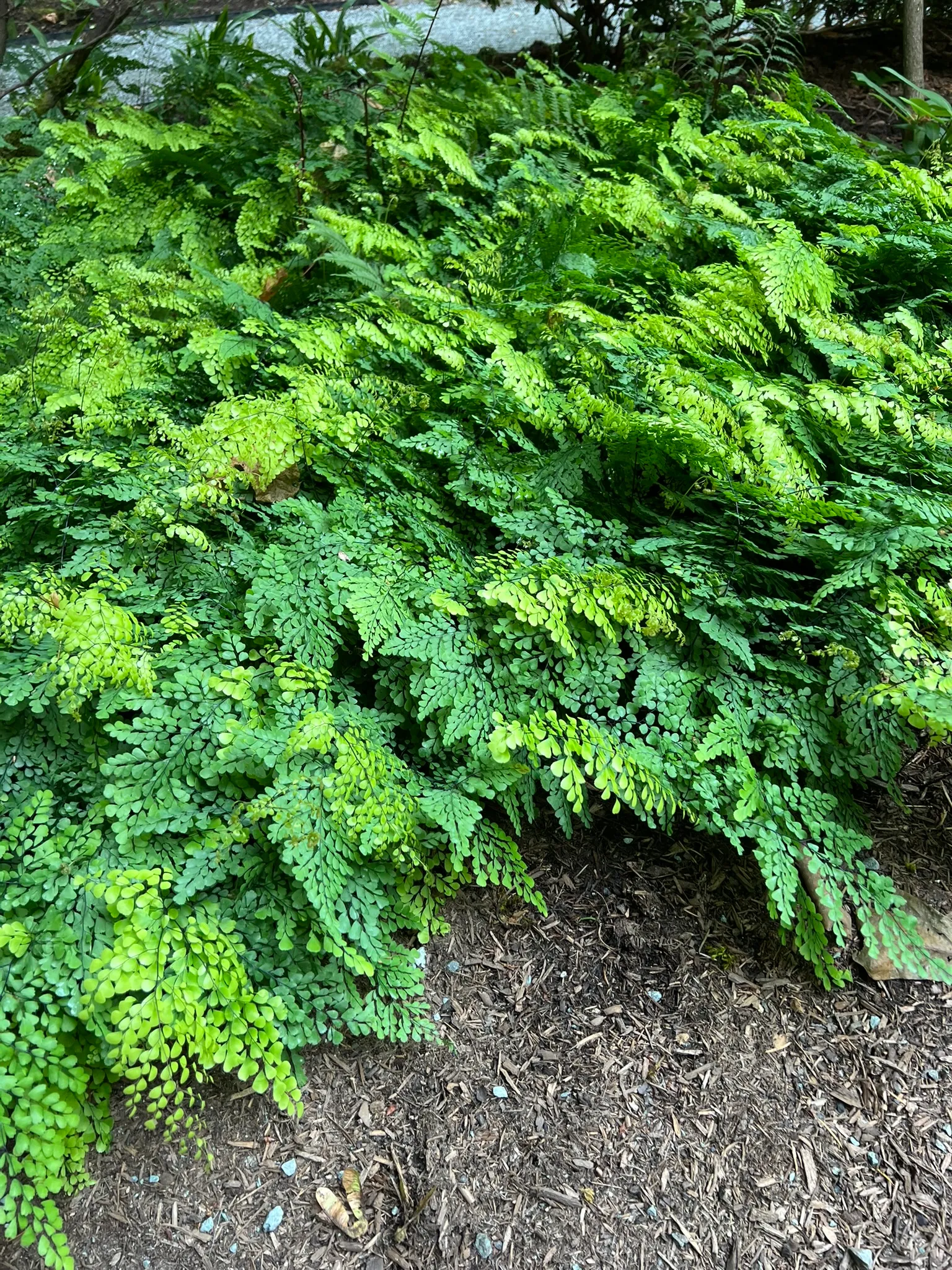 A semi-evergreen to evergreen fern forming a low, spreading mound 9-15 inches (23-38 cm) tall and 18-24 inches (45-60 cm) wide. Fronds are bipinnate to tripinnate, composed of numerous small, fan-shaped to rhombic pinnules 5-10 mm wide, each with a shallowly lobed outer margin. New fronds emerge copper-pink to bronze in spring, transitioning to mid-green through summer. In mild winters (zones 7-9), fronds remain evergreen; in colder zones (5-6), they die back to the ground but re-emerge in spring. Stipes are wiry, black-purple, and 4-8 inches (10-20 cm) long. Fronds lie nearly horizontal, creating a layered, lacy texture. Spread is rhizomatous and slow to moderate; plants expand roughly 3-6 inches (8-15 cm) outward per year. Sori are borne on the reflexed margins of pinnule tips. No flowers are produced. Lower fronds yellow and brown at the tips when the soil dries out between waterings. Plants established in moist, humus-rich soil maintain foliage quality better than those in dry sites.