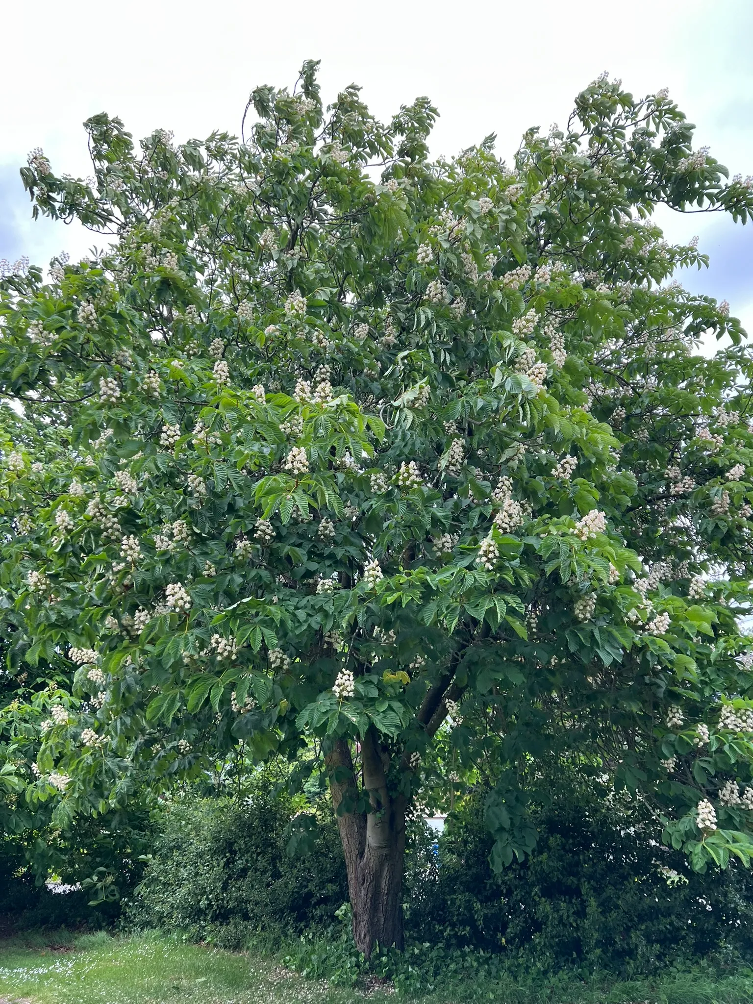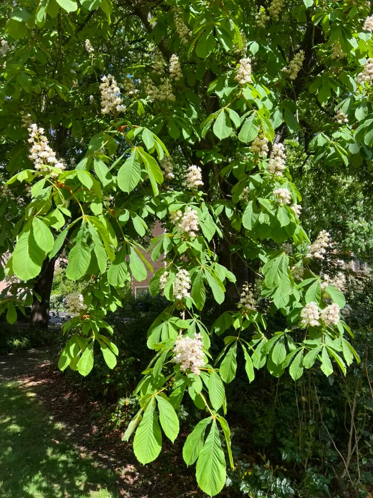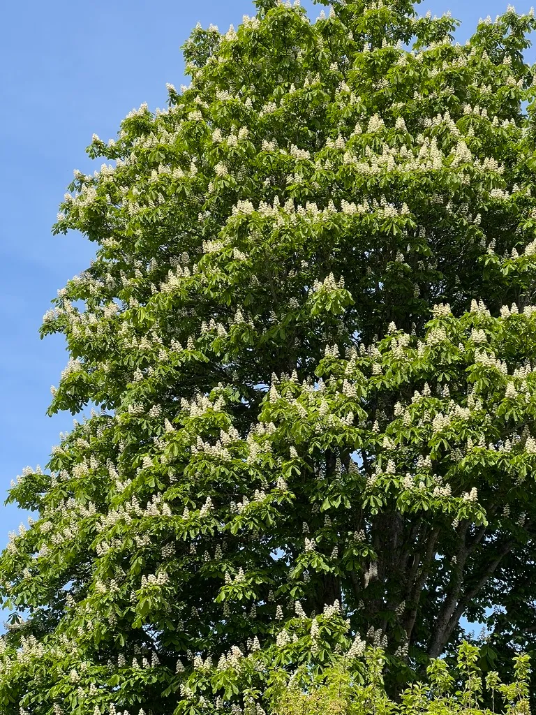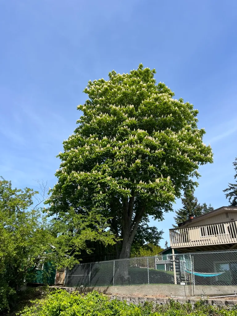Aesculus hippocastanum is a large deciduous tree reaching 50–75 feet (15–23 m) tall and 40–60 feet (12–18 m) wide, with a broad, rounded crown. Leaves are palmately compound with 5–7 leaflets, each 4–10 inches (10–25 cm) long, dark green above with a coarse, wrinkled texture. In May through June, upright panicles of white flowers 8–12 inches (20–30 cm) tall rise above the foliage; individual flowers are 0.75 inch (2 cm) across with yellow blotches that turn red after pollination. Fruit are round, spiny green capsules 1.5–2.5 inches (4–6 cm) across, ripening September through October and releasing 1–3 glossy brown seeds (conkers). Bark is dark gray-brown, developing plated scales with age. Notably large, sticky resinous buds are a reliable winter identification feature. Growth rate is moderate, 1–2 feet (30–60 cm) per year. All parts of the plant are toxic to humans and animals if ingested; conkers contain aescin and should be kept away from children and pets. In humid Pacific Northwest conditions, the fungal leaf blotch disease Guignardia aesculi reliably disfigures foliage by July through August — leaves develop brown scorched patches and the tree appears in poor health by late summer. This is cosmetic rather than fatal, but it is a consistent performance limitation in wet coastal climates. The hybrid Aesculus × carnea 'Briotii' shows significantly better resistance and may be preferable for PNW plantings.
