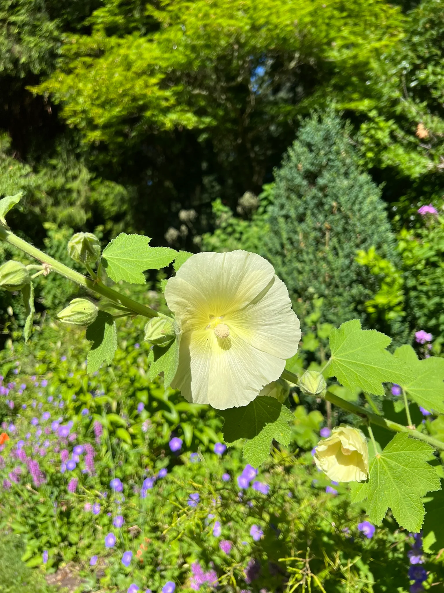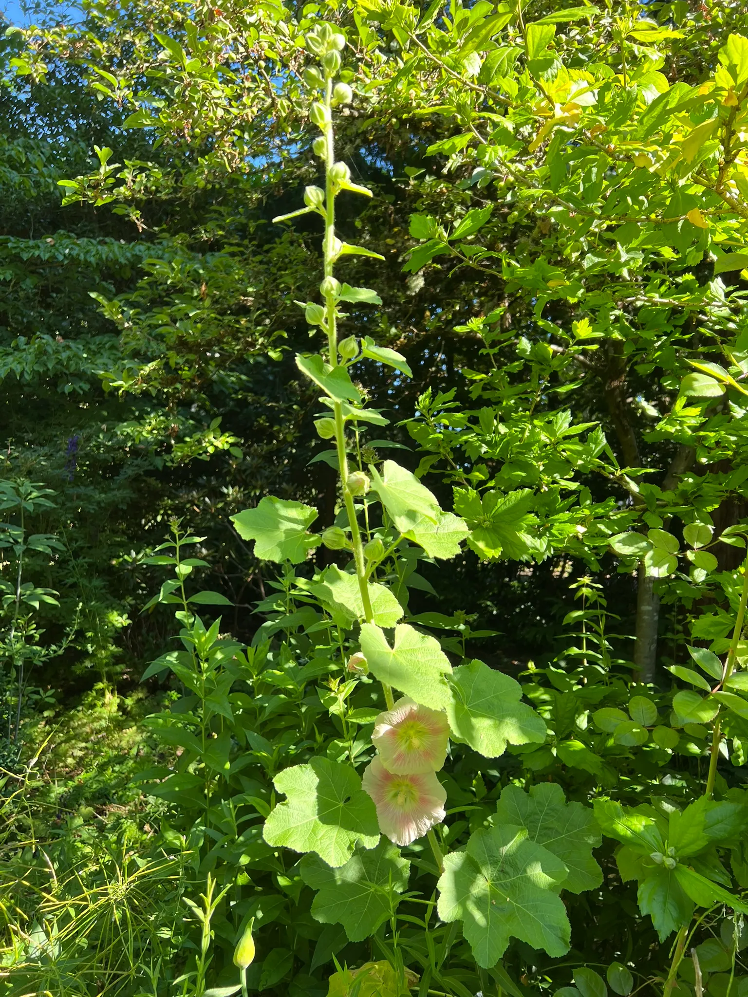 A biennial or short-lived perennial reaching 5–9 feet (150–275 cm) tall with erect, unbranched stems. Basal leaves large, rounded to heart-shaped, 4–8 inches (10–20 cm) across with 5–7 shallow lobes and a rough, hairy texture. Stem leaves become progressively smaller upward. Flowers are funnel-shaped, 3–5 inches (8–13 cm) across, borne in leaf axils along the upper half of the stem, opening sequentially from bottom to top over 4–6 weeks. Flower color ranges include white, pale yellow, pink, red, burgundy, and near-black; single and double forms exist. As a biennial, plants produce only a rosette of foliage in their first year, then flower, set seed, and die in the second year. Self-seeding is common where conditions permit, producing volunteer seedlings annually. Hollyhock rust (Phragmidium malvacearum) causes orange pustules on leaf undersides and is prevalent in humid conditions; it is cosmetic in mild cases but can defoliate plants in severe outbreaks. Stems require staking in exposed or windy sites.