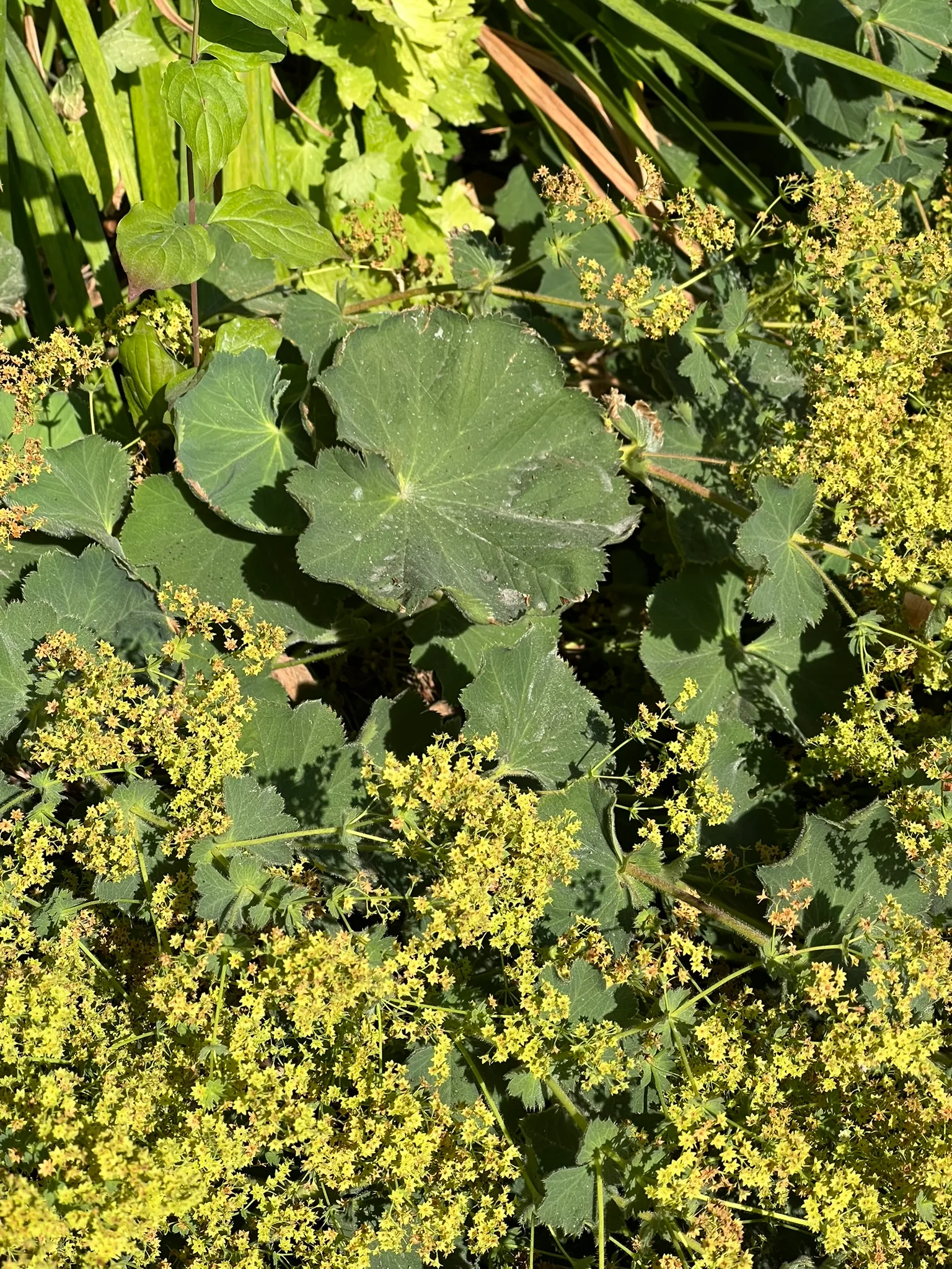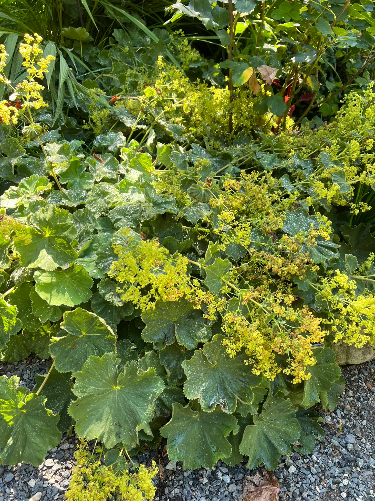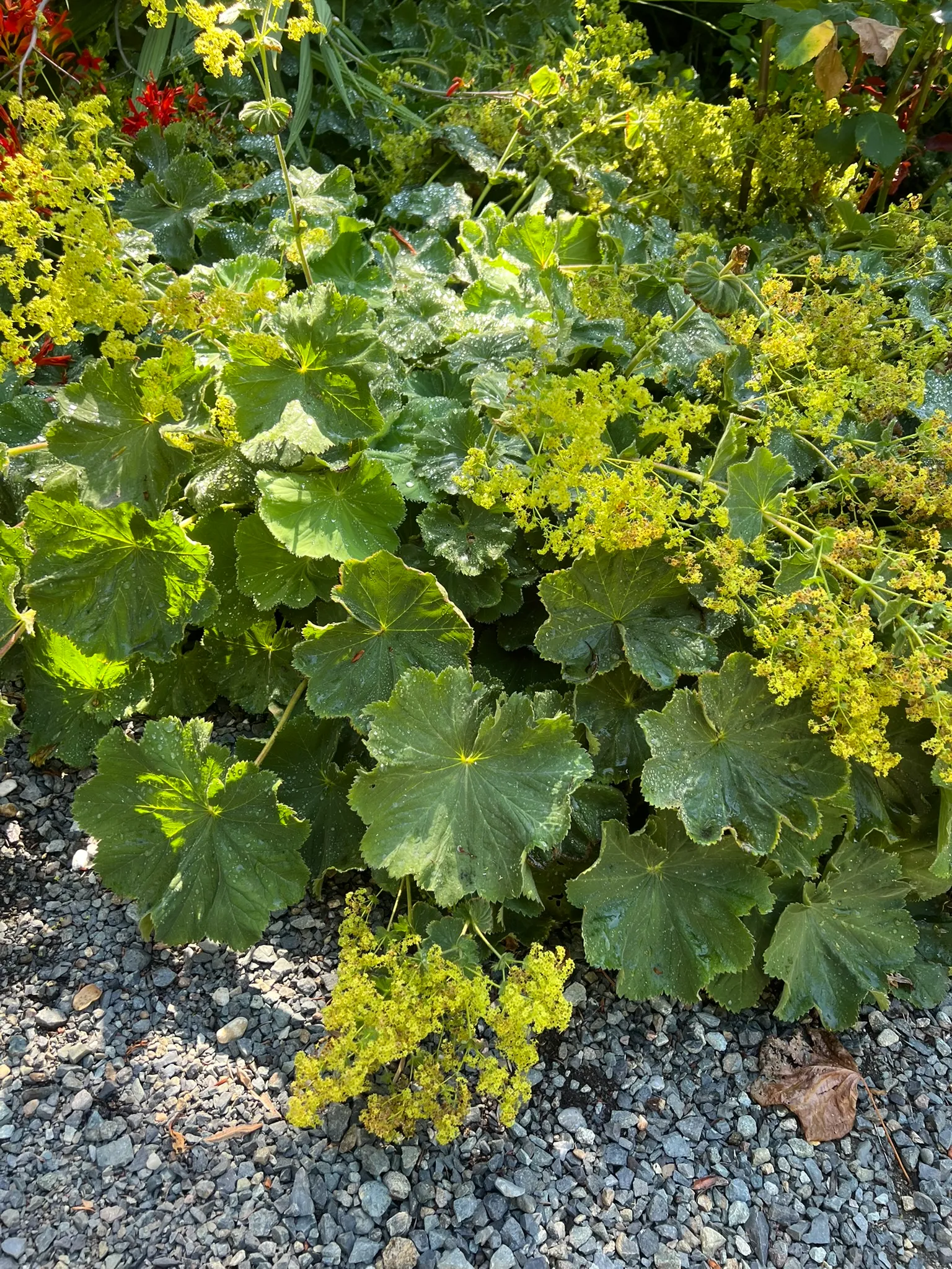 A clump-forming perennial reaching 12–18 inches (30–45 cm) tall with a similar or slightly wider spread of 18–24 inches (45–60 cm). Leaves are rounded, 2–5 inches (5–13 cm) across, with 9–11 shallow, toothed lobes and a soft, pleated texture covered in fine hairs that cause water droplets to bead and collect on the surface. Foliage is pale to mid-green, emerging in spring and remaining through summer. In late spring to early summer, branching stems bear loose clusters of tiny chartreuse-yellow flowers each approximately 3 mm across, forming airy sprays above the foliage. Flowers lack petals; the yellow-green color comes from the sepals. Plants spread modestly by short rhizomes and self-seed freely; seedlings can become weedy in moist, fertile soils. Foliage may scorch in hot, dry summers and often looks ragged by late summer in zones 7–9, warranting cutting back to regenerate fresh leaves. Hardy in zones 3–8.