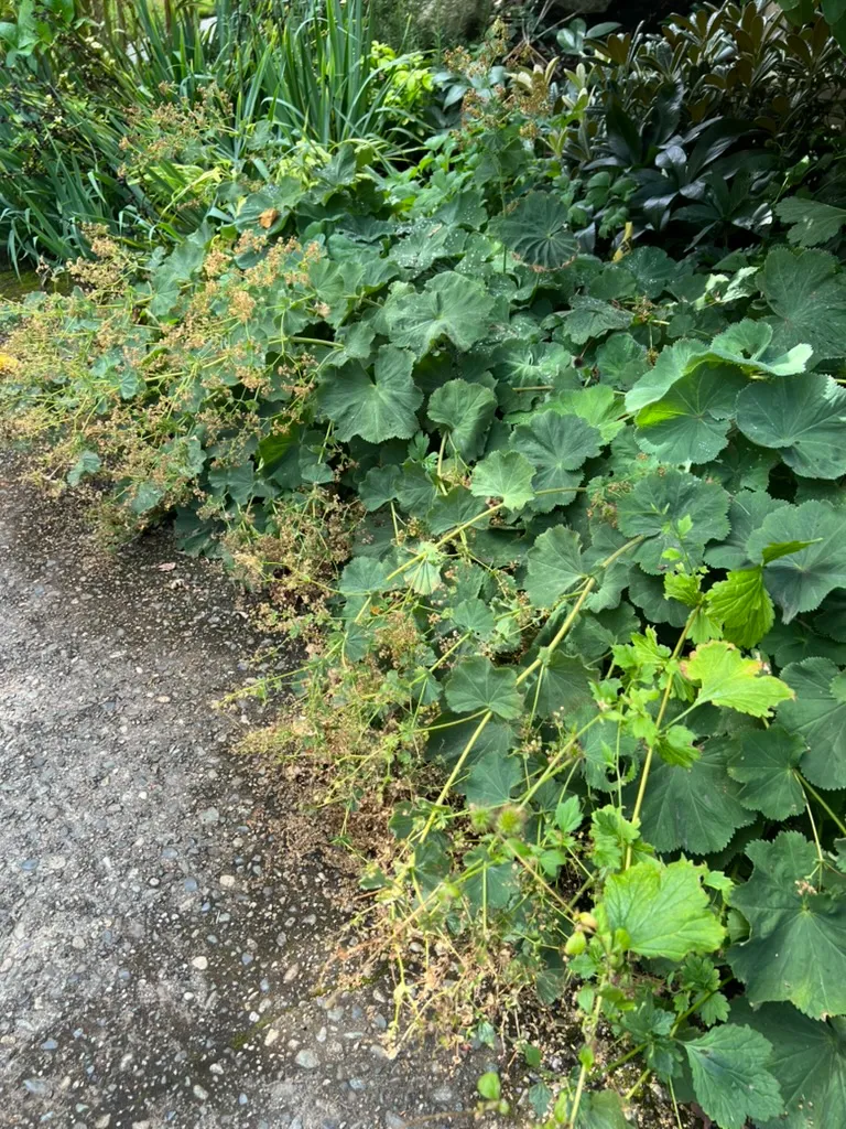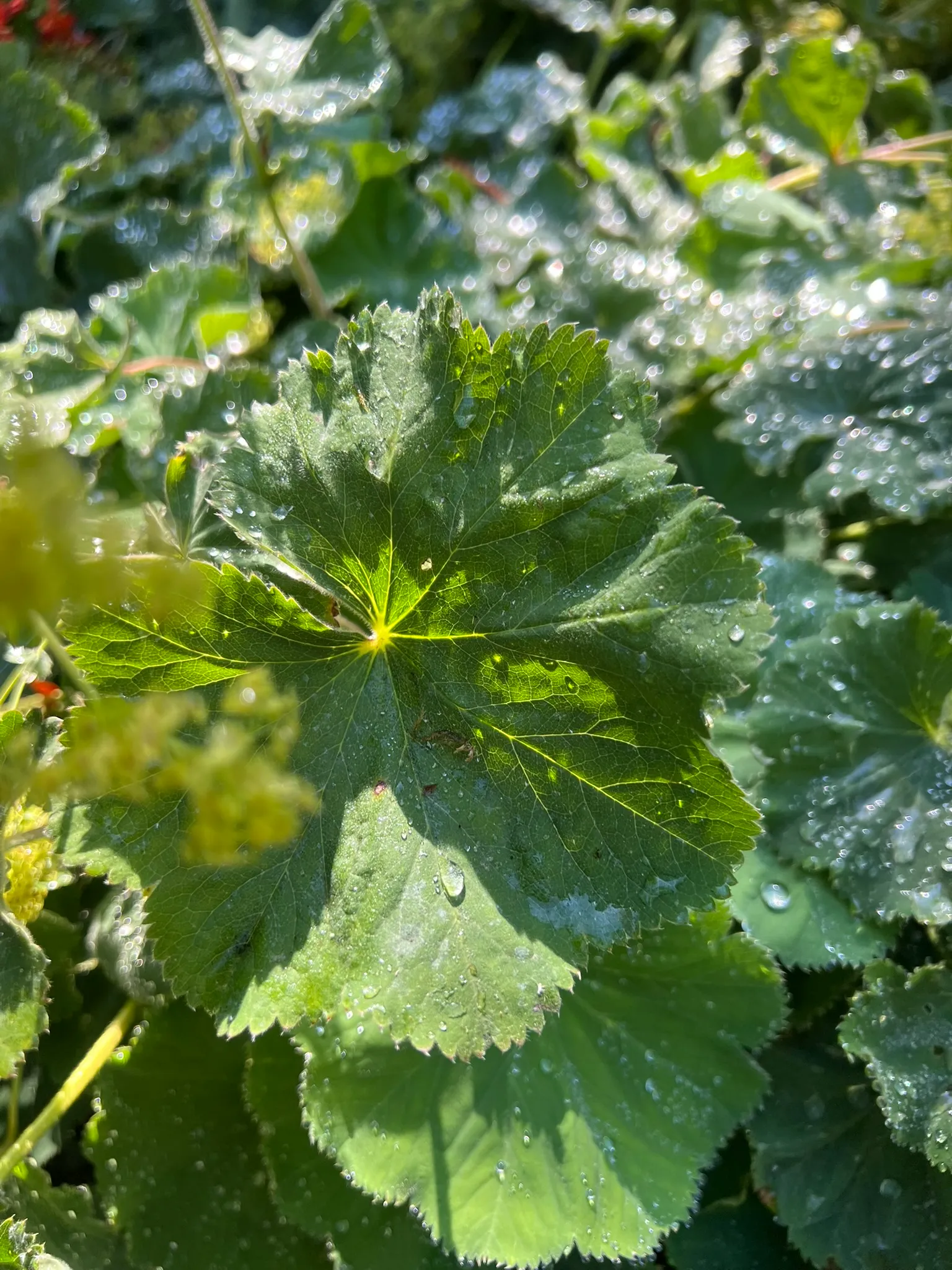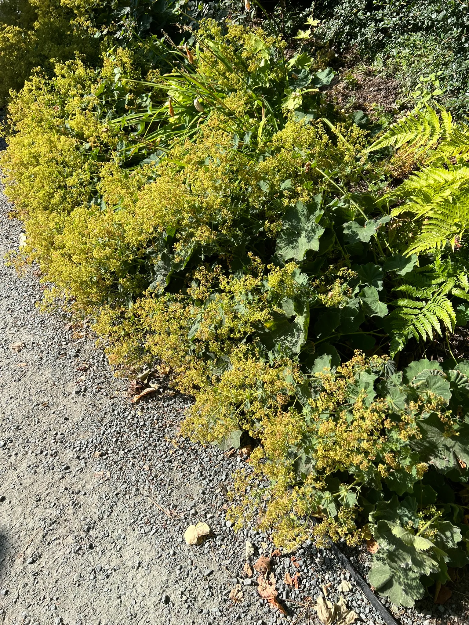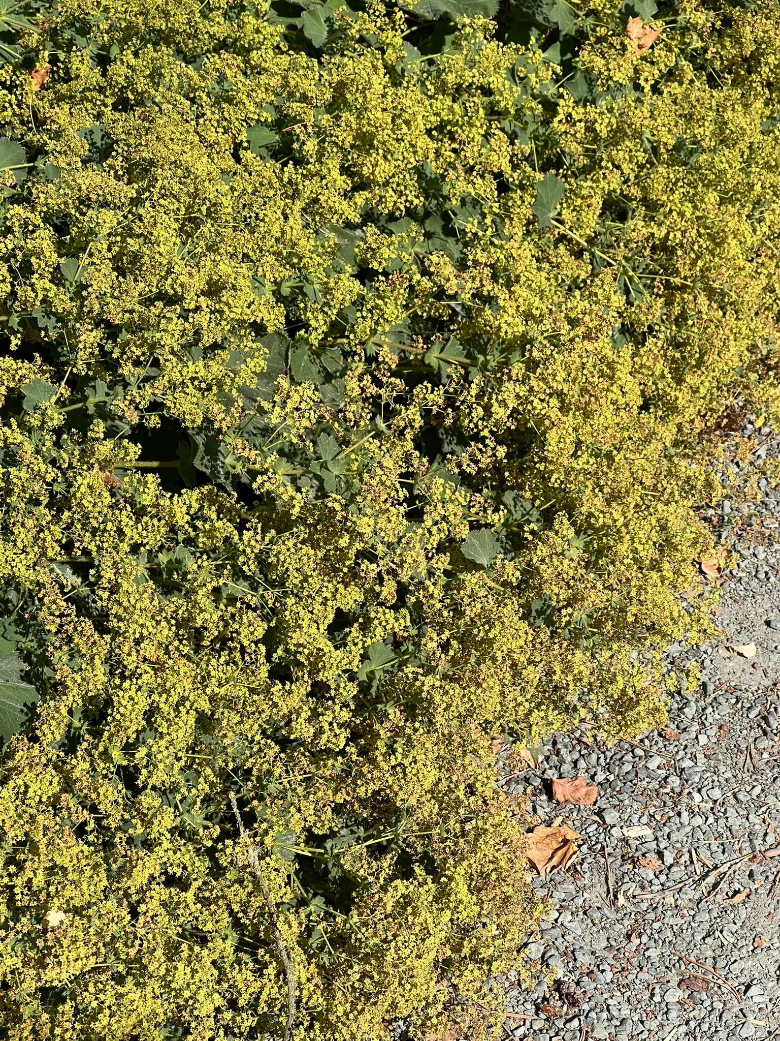 A clump-forming perennial reaching 12–18 inches (30–45 cm) tall with a similar or slightly wider spread of 18–24 inches (45–60 cm). Leaves are rounded, 2–5 inches (5–13 cm) across, with 9–11 shallow, toothed lobes and a soft, pleated texture covered in fine hairs that cause water droplets to bead and collect on the surface. Foliage is pale to mid-green, emerging in spring and remaining through summer. In late spring to early summer, branching stems bear loose clusters of tiny chartreuse-yellow flowers each approximately 3 mm across, forming airy sprays above the foliage. Flowers lack petals; the yellow-green color comes from the sepals. Plants spread modestly by short rhizomes and self-seed freely; seedlings can become weedy in moist, fertile soils. Foliage may scorch in hot, dry summers and often looks ragged by late summer in zones 7–9, warranting cutting back to regenerate fresh leaves. Hardy in zones 3–8.