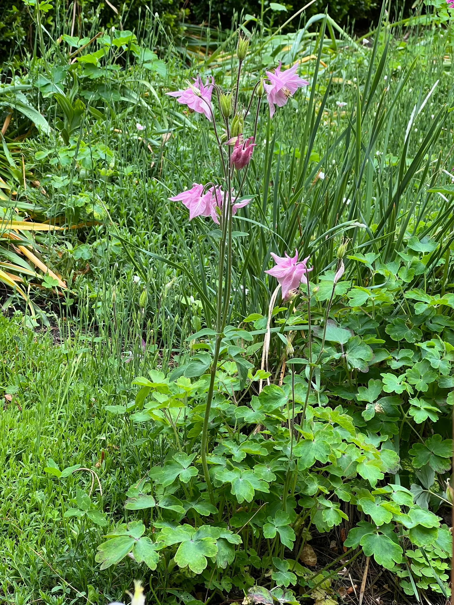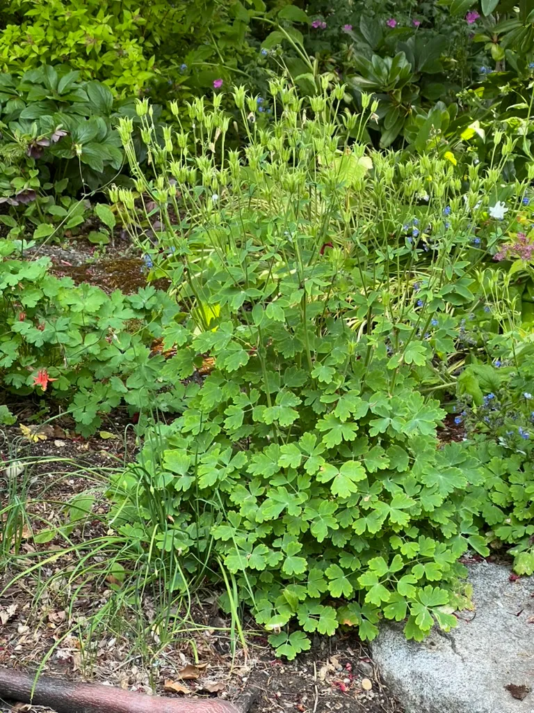 An herbaceous perennial forming an upright clump 18-36 inches (45-90 cm) tall and 12-18 inches (30-45 cm) wide at flowering. Basal leaves are ternately compound, each leaflet 1-2 inches (2.5-5 cm) across, rounded with three to five lobed margins, blue-green in color. Stem leaves are smaller, becoming sessile near the top. Flowers are nodding, 1.5-2 inches (4-5 cm) across, composed of five sepals and five petals; each petal extends backward into a hollow, strongly curved nectar spur 0.5-0.8 inches (12-20 mm) long. Typical flower colors are blue to violet, but white, pink, and red forms exist; garden populations include extensive variation from natural and deliberate hybridization. Flowers appear May to June. Seed capsules are erect, 0.75-1 inch (2-2.5 cm) long, splitting at maturity to release black seeds. Plants are typically short-lived (3-4 years) and self-seed freely. Foliage may develop powdery mildew or leaf miners by midsummer; plants often look worn after flowering. All parts are toxic if ingested.
