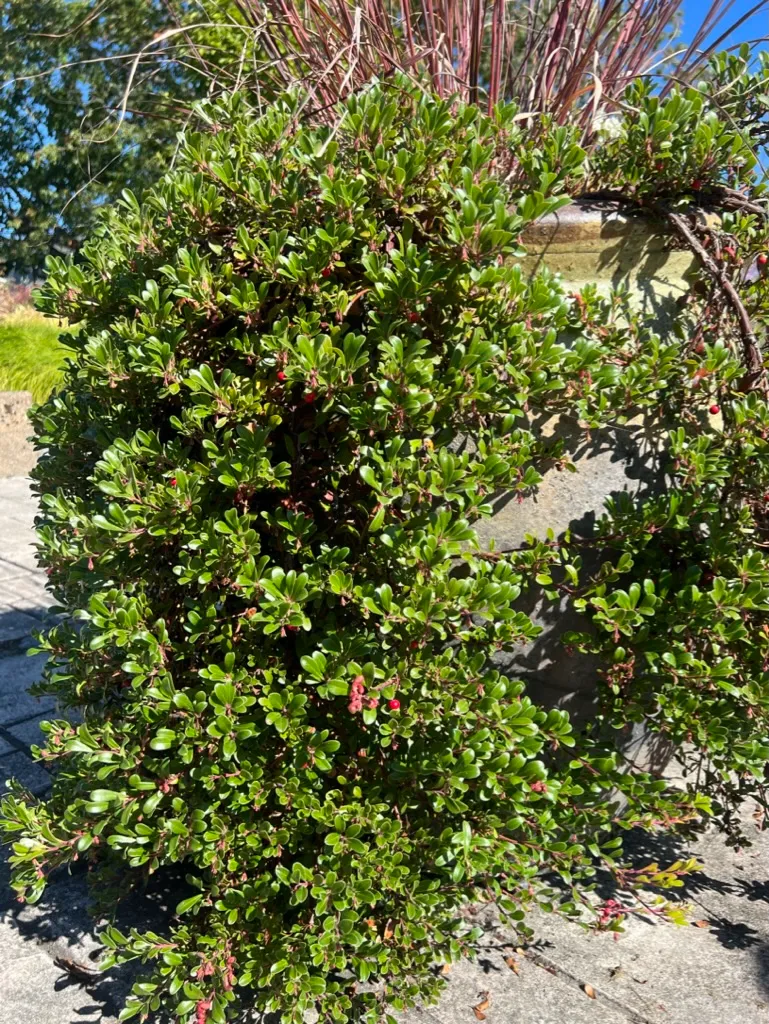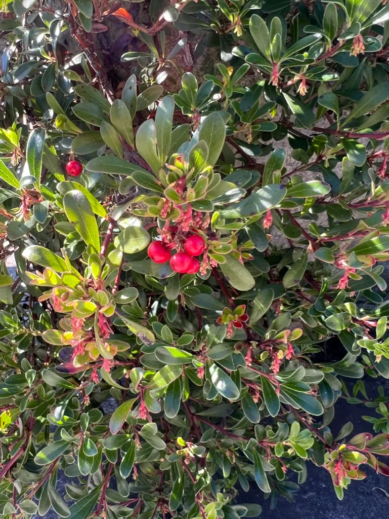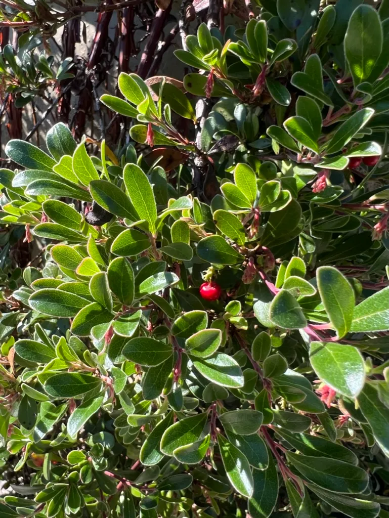 A prostrate, mat-forming, evergreen shrub in the family Ericaceae, native to a wide range of open to lightly forested habitats across the Pacific Northwest including coastal bluffs, rocky outcrops, dry open forests, and sandy slopes from Alaska south through British Columbia, Washington, and Oregon — one of the most widely distributed native groundcover shrubs of the Pacific Northwest and circumpolar regions. The specific epithet uva-ursi means 'bear's grape' — 'uva' (grape) in Latin and 'ursi' (bear) in Latin, reflecting the same meaning as the common name 'kinnikinnick' from Algonquian, also meaning 'that which is smoked.' Plants grow 4–8 inches (10–20 cm) tall, spreading by trailing stems that root at nodes to form dense mats 3–6 feet (0.9–1.8 m) or more across. The alternate, evergreen leaves are small, spoon-shaped to obovate, 0.5–1 inch (12–25 mm) long, with a leathery texture, glossy dark green upper surface, and smooth (not toothed) margins. Reddish-brown stems with shredding bark root at nodes where they contact soil. In April–June, clusters of small, urn-shaped, white to pale pink flowers 0.2 inch (5 mm) long hang at branch tips — characteristic of the heath family. Bright red, waxy, round berries 0.3–0.4 inch (8–10 mm) develop by August and persist through winter, providing food for bears, grouse, and other wildlife. Highly drought-tolerant once established. Non-toxic; berries were an important food source for many Indigenous peoples.