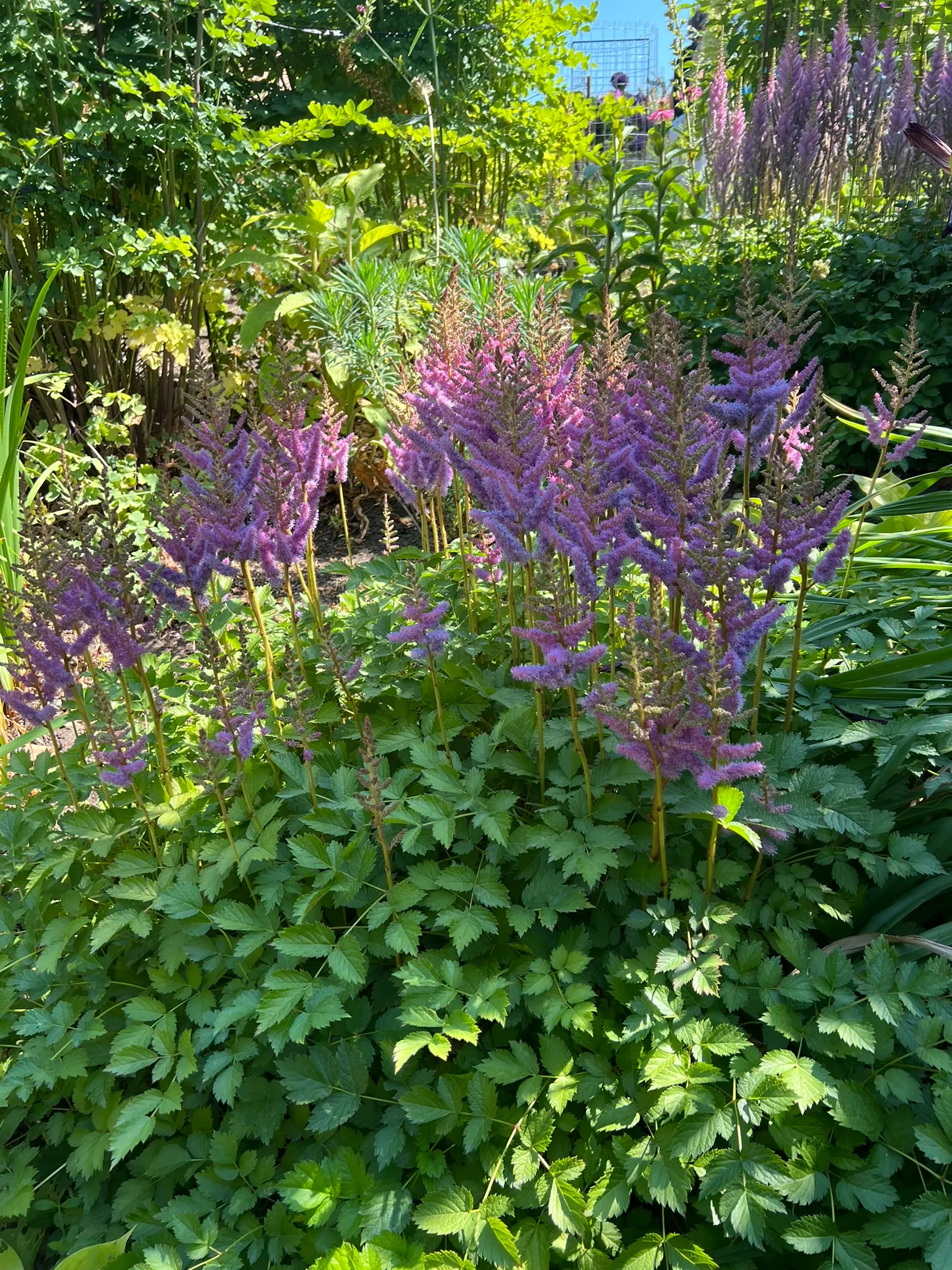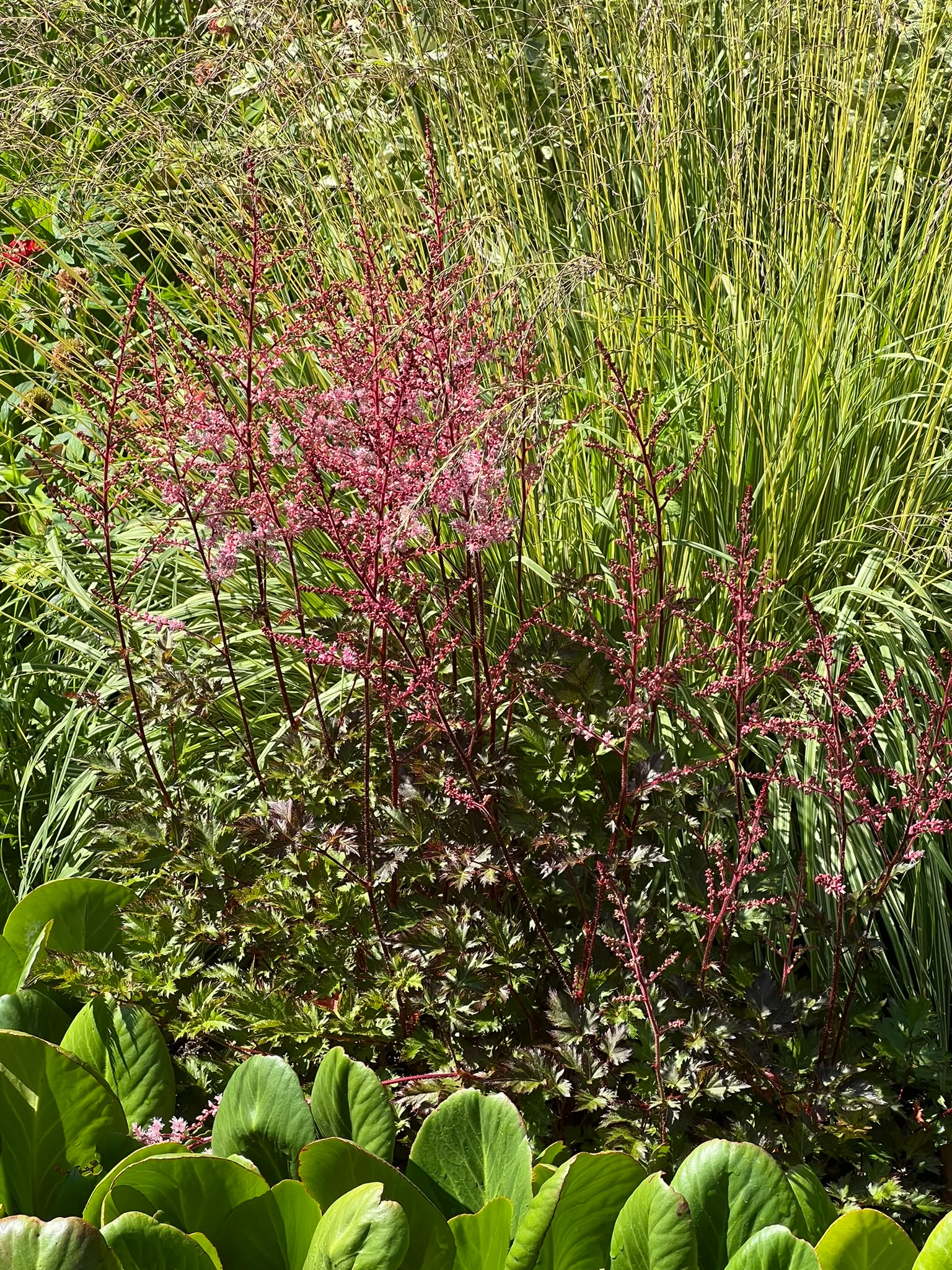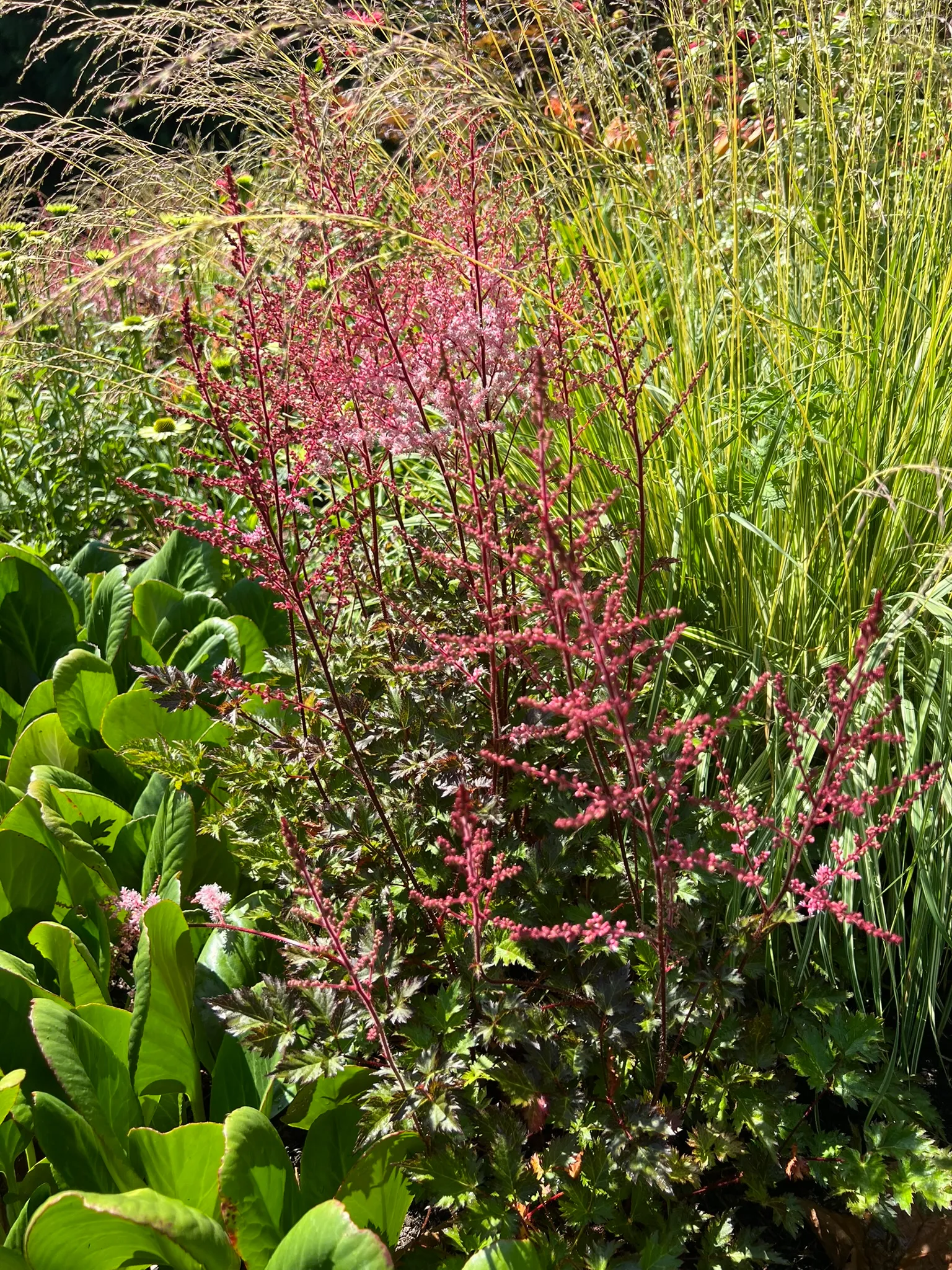 A genus of clump-forming perennials ranging from 6 inches to 5 feet (15–150 cm) tall depending on species and cultivar group, with most garden varieties falling between 18–36 inches (45–90 cm). Leaves are compound, 2–3 times pinnate, with ovate to lance-shaped leaflets 1–3 inches (2.5–8 cm) long, often emerging with bronze or reddish tints in spring before maturing to dark green. Some cultivars maintain bronze or dark foliage throughout the season. Flowers are tiny, borne in dense, feathery panicles (plumes) 6–18 inches (15–45 cm) long, in white, cream, pink, red, or purple depending on species and cultivar. Plumes are erect to arching. Bloom time varies by cultivar group from late spring through midsummer. Dried plumes persist and turn brown, remaining ornamental through fall and winter. Plants spread slowly by rhizomes. Foliage wilts and browns rapidly under drought; soil that dries out completely causes irreversible foliage damage. Established clumps decline in vigor after 3–4 years without division.