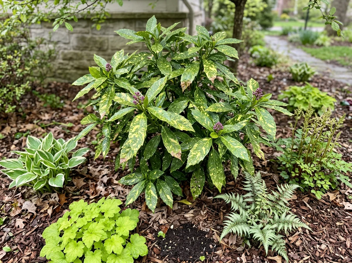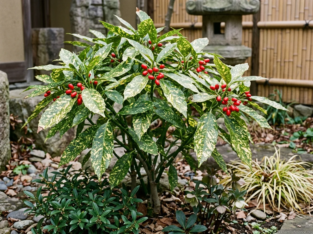 Aucuba japonica is the Japanese aucuba (Japanese laurel), an evergreen shrub growing 72–120 inches (180–300 cm) tall and 48–96 inches (120–240 cm) wide. Dark green glossy leathery oval leaves 4–8 inches (10–20 cm). The cultivar 'Variegata' (gold dust aucuba) has gold-speckled leaves — the gold dust pattern is the most widely grown form. 'Crotonifolia' has larger bold gold blotches. Dioecious: separate male and female plants. Female plants produce bright red oval berries 0.5 inch (12 mm) in fall, persisting through winter — a male pollinator within insect-flight distance is required for berry production. Inconspicuous dark purple 4-petaled flowers in erect panicles in early spring. In the silk tassel family (Garryaceae). Tolerates deep shade — one of the few broadleaf evergreen shrubs that maintains glossy foliage in full shade. Full sun causes leaf scorch: black blotching and bleaching on the leaves, especially in hot climates. Also tolerates dry shade, urban pollution, and salt spray. All parts contain aucubin (an iridoid glycoside) — mildly toxic to humans and animals (gastrointestinal irritation). Native to Japan, Korea, and China. Deer-resistant. Zones 7–10. Growth rate is slow to moderate.