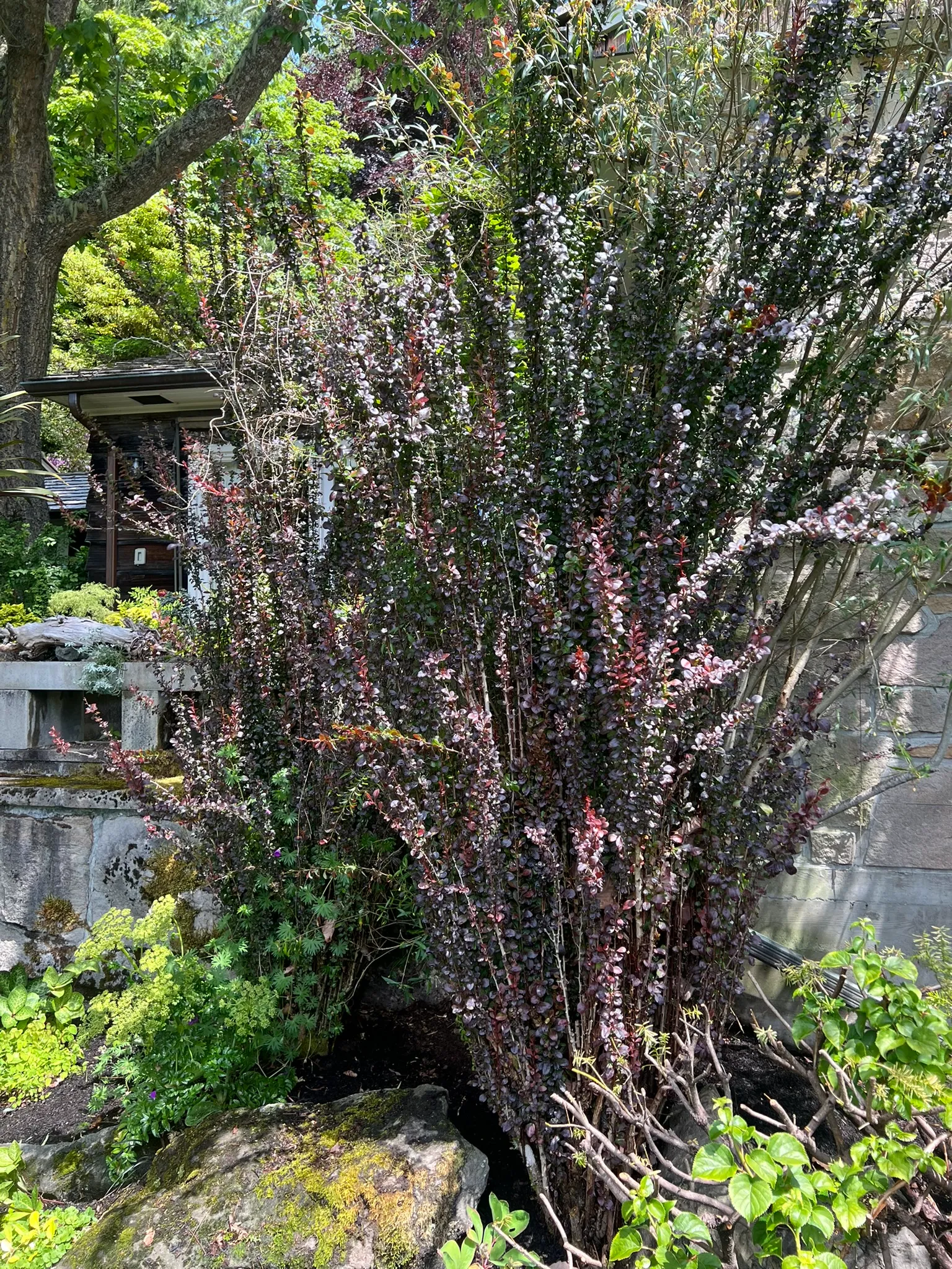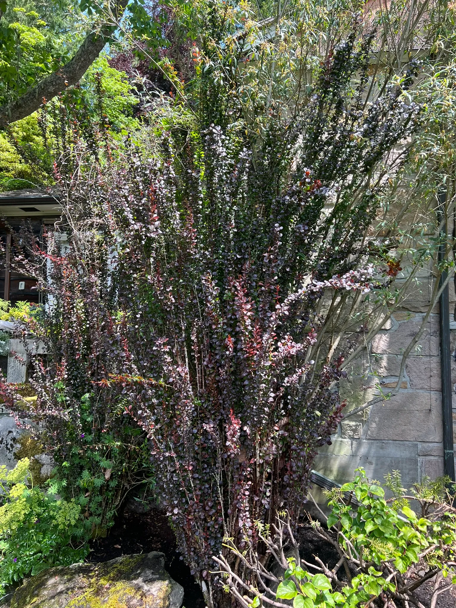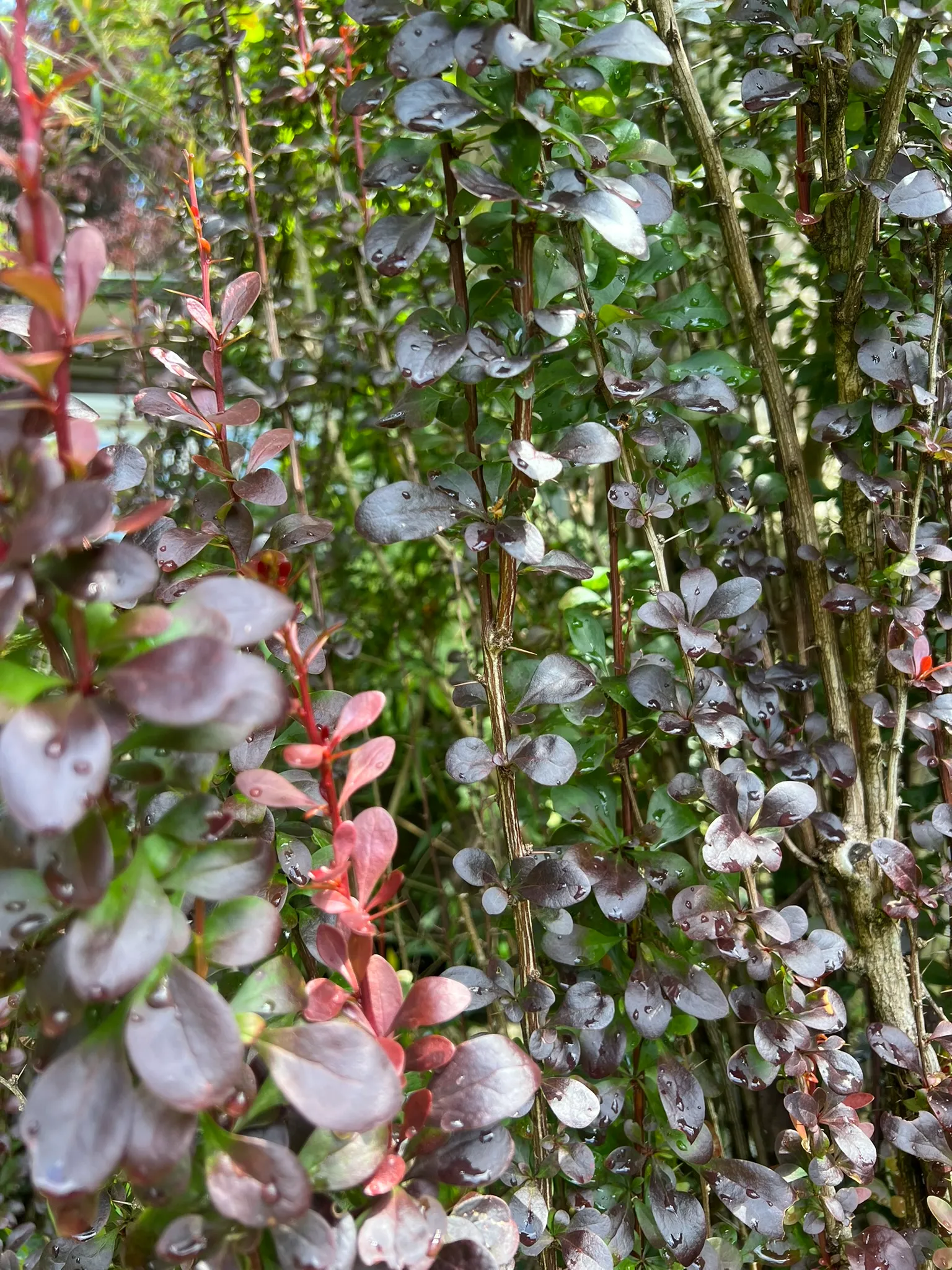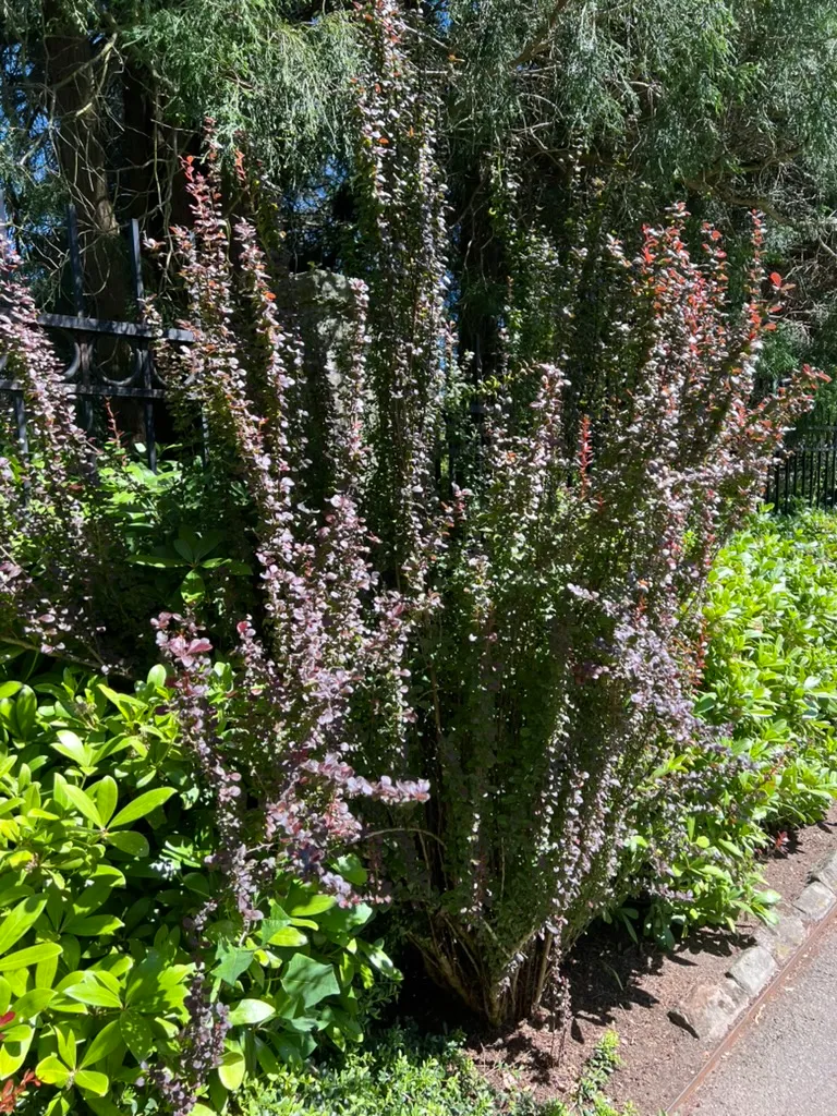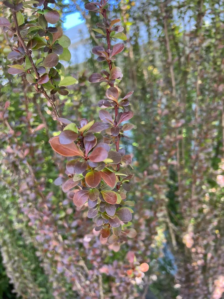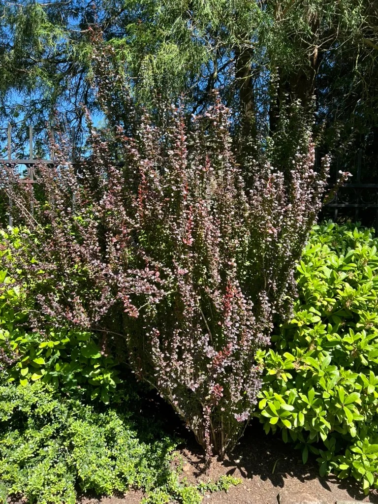 Berberis thunbergii f. atropurpurea 'Helmond Pillar' is a narrowly upright, fastigiate cultivar of purple-leaved Japanese barberry reaching 4–5 feet (120–150 cm) tall and 1.5–2 feet (45–60 cm) wide — providing strong vertical accent with very little horizontal footprint. Small spatulate leaves 0.5–1 inch (1.2–2.5 cm) long are deep burgundy-red in full sun; the vertical branching pattern displays the foliage densely along the upright stems. Unlike the spreading habit of most barberry cultivars, 'Helmond Pillar' maintains its narrow columnar form without annual shearing. In April through May, small yellow flowers hang inconspicuously beneath the stems. Red oblong berries ripen in fall and persist through winter; the narrow upright habit makes the berry display visually distinctive against the bare stems. Sharp single thorns at each node throughout. Berberis thunbergii is listed as invasive in numerous eastern and midwestern US states where bird-dispersed seeds naturalize in forests; it is not currently regulated in Washington or Oregon. All cultivars of the species, including 'Helmond Pillar', produce viable seeds.