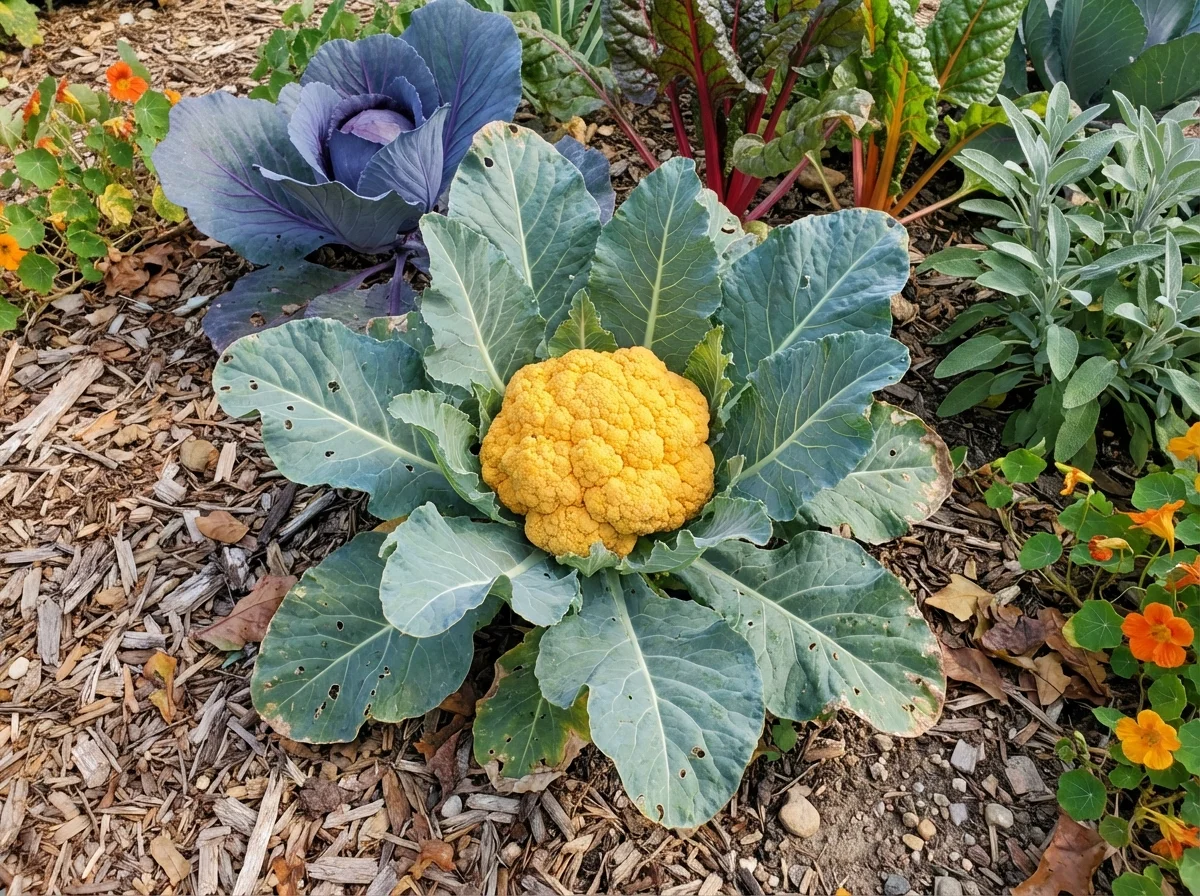 Brassica oleracea 'Cheddar' is a distinctive cauliflower cultivar prized for its vibrant orange-yellow heads that develop their characteristic color naturally without blanching. This cool-season vegetable forms compact, dense curds with a striking cheddar cheese-like hue that intensifies as the head matures. The plant develops a sturdy central stem surrounded by large, blue-green leaves that help protect the developing head.