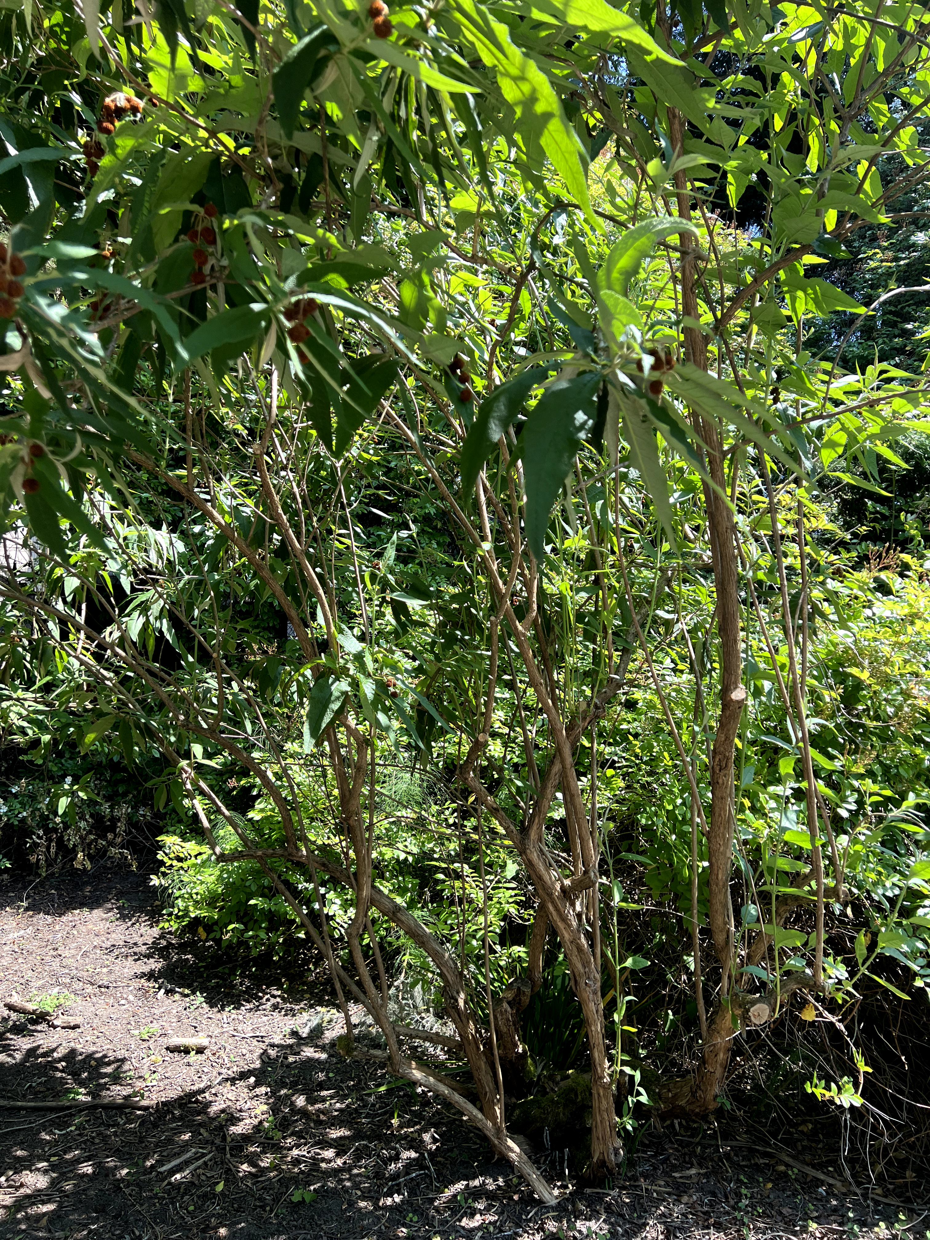 Buddleja globosa is a vigorous semi-evergreen to evergreen shrub native to the Andes of Chile and Argentina, reaching 10–15 feet (3–4.5 m) tall and 10–12 feet (3–3.6 m) wide in PNW gardens — significantly larger than Buddleja davidii. Its most distinctive feature is the flowers: rather than the long conical panicles of other butterfly bushes, Buddleja globosa bears perfectly spherical ball-shaped flower clusters 0.75–1 inch (2–2.5 cm) in diameter in vivid orange-yellow, produced in loose branched arrangements at branch tips in late May through June. Each flower cluster is composed of dozens of tiny tubular florets and carries an intensely sweet honey fragrance. Leaves are lance-shaped to oblong, 4–8 inches (10–20 cm) long, dark green above with a strongly wrinkled, corrugated texture and felted pale undersides — the deeply rugose leaf surface is a reliable year-round identification feature. In mild PNW winters, foliage is retained through the season; severe cold (below 0°F / -18°C) causes die-back. Unlike Buddleja davidii, Buddleja globosa rarely self-seeds in PNW conditions and is not currently listed as invasive in Washington or Oregon. It blooms on old wood, which has significant pruning implications — plants cut back hard lose that season's flowers.