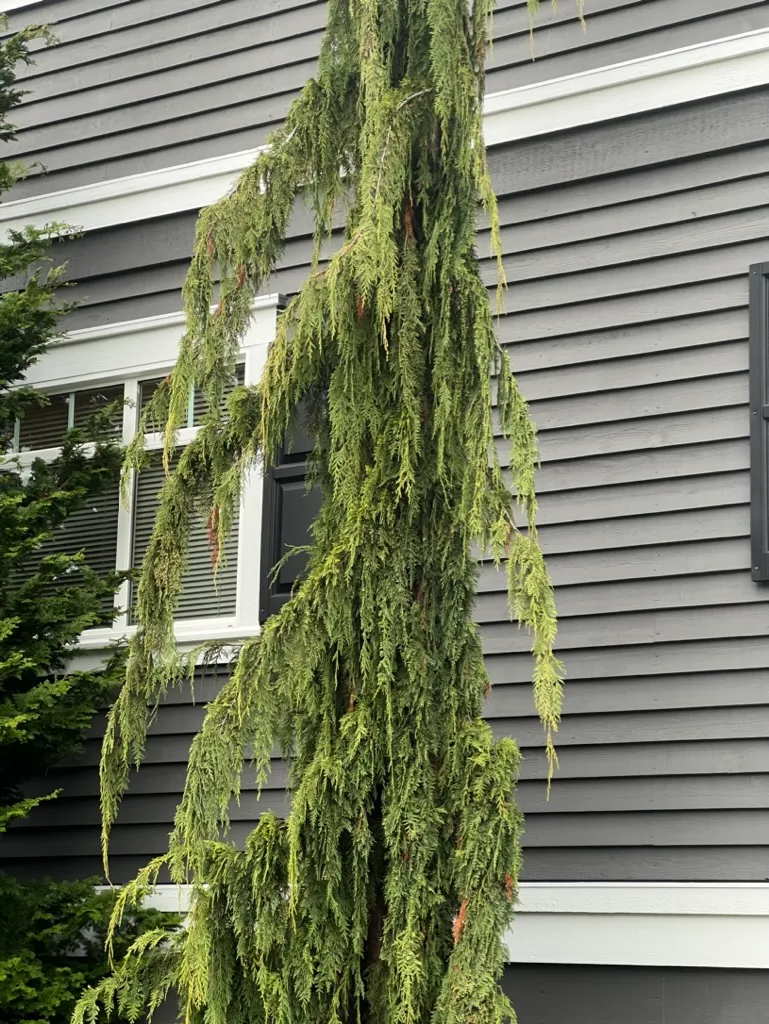 Callitropsis nootkatensis 'Pendula' is planted as a vertical accent specimen in Pacific Northwest gardens where a dramatic, narrow, weeping silhouette is desired. The extremely narrow width (4–8 ft) relative to height (25–45 ft) allows use in tighter spaces than most large conifers. Effective for framing entryways, punctuating corners, or providing vertical exclamation points in formal or naturalistic designs. The year-round blue-green curtaining foliage and graceful nodding leader provide distinctive presence in all seasons.How to Identify