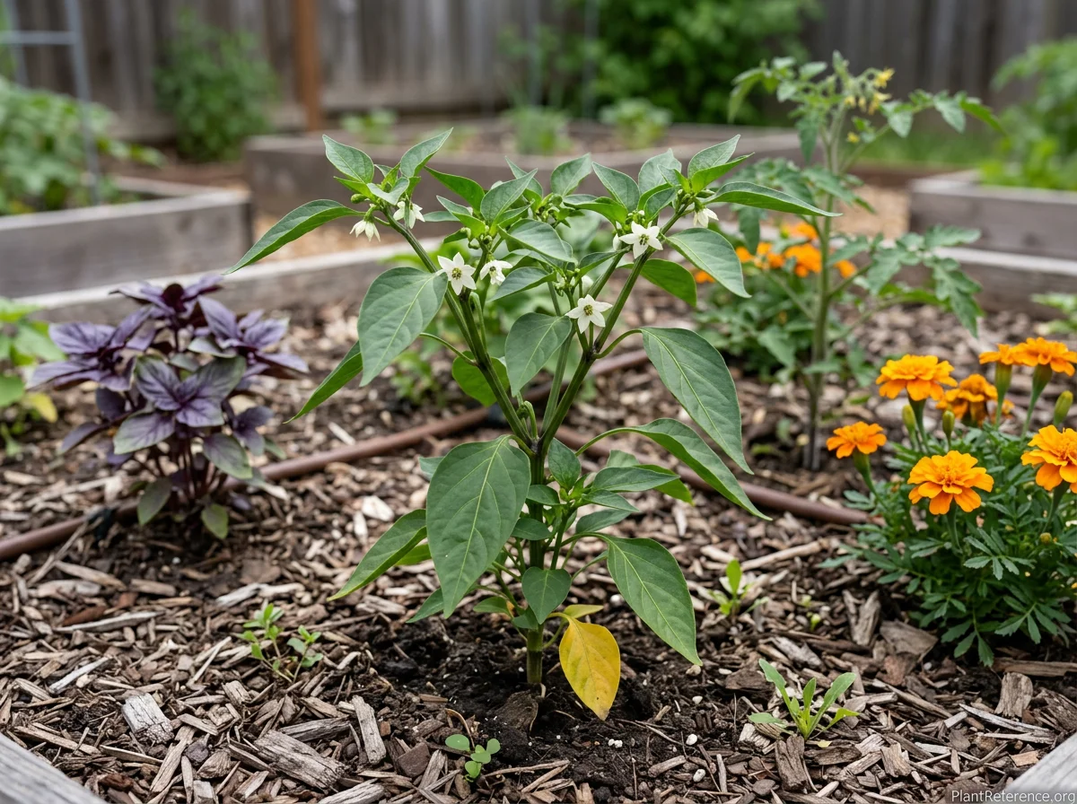 Capsicum annuum 'Jalapeño' requires consistent moisture throughout the growing season, with soil kept evenly moist but not waterlogged. Water deeply 1-2 times per week, providing about 1 inch of water weekly. Fertilize every 2-3 weeks with a balanced fertilizer during active growth, switching to a lower nitrogen, higher phosphorus formula once flowering begins to encourage fruit production. Maintain soil temperature above 60°F for optimal growth, and provide support stakes if plants become heavy with fruit.Pruning