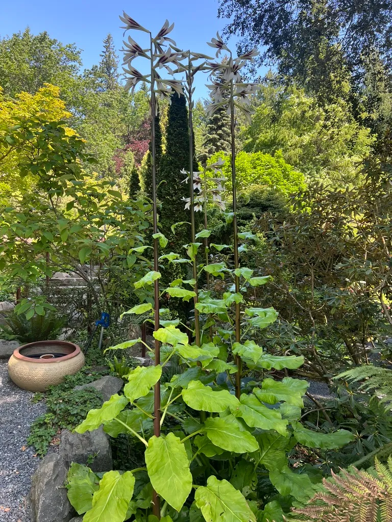 A monocarpic bulbous perennial reaching 6-12 feet (1.8-3.7 m) tall in flower, with individual plants taking 3-7 years from bulb to first flowering. Bulbs are large, tunicate, green-scaled, planted at or just below the soil surface with the tip exposed. Basal leaves in non-flowering years are broadly ovate to heart-shaped, 12-18 inches (30-45 cm) long and 8-14 inches (20-35 cm) wide, with prominent veins, glossy dark green, forming a rosette. In the flowering year, a stout hollow stem emerges with progressively smaller stem leaves. The terminal raceme bears 15-20 fragrant, trumpet-shaped flowers, each 6-8 inches (15-20 cm) long, white with purple-red streaking in the throat, held horizontally or slightly nodding, opening in succession over 3-5 weeks. After flowering, the main bulb dies, but 2-5 offset bulbils at the base persist and grow on; these offsets typically require 3-4 more years before they flower. Seed capsules are large, brown, and ornamental, persisting through autumn.