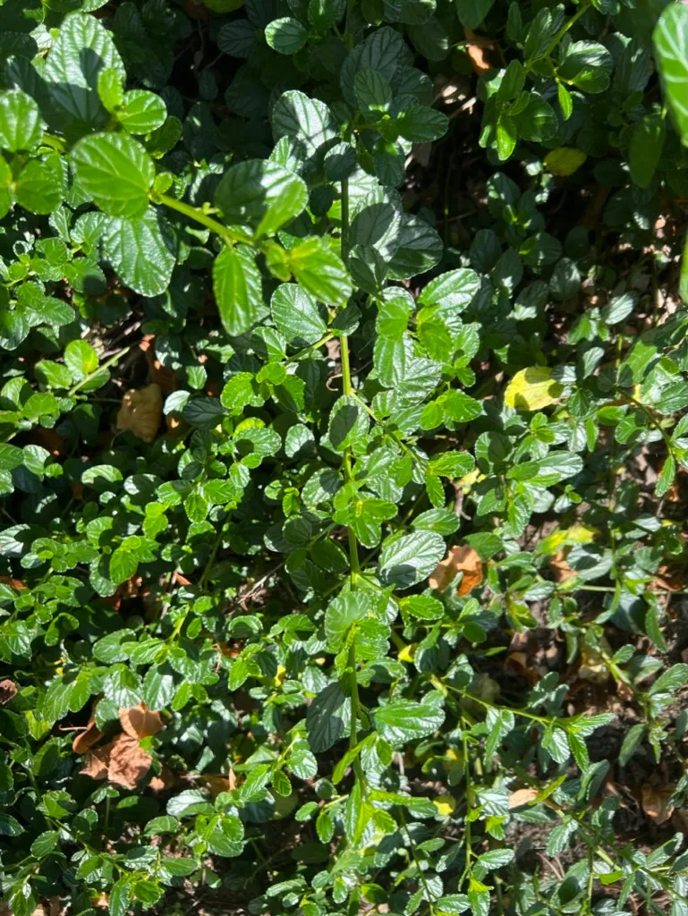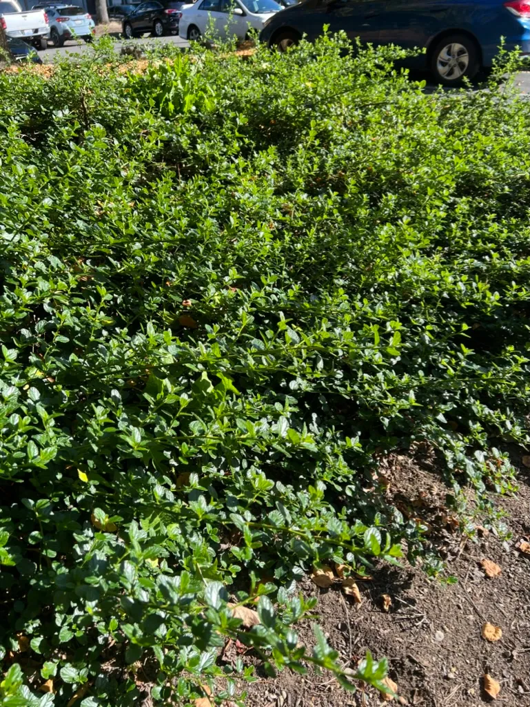 A prostrate to low-mounding evergreen shrub reaching 6–18 inches (15–45 cm) tall and spreading 4–8 feet (1.2–2.4 m) wide. Leaves are small, 0.5–1 inch (1.2–2.5 cm) long, broadly oval to nearly round, leathery, with distinctly holly-like toothed margins and a glossy dark green upper surface. Stems root where they contact soil over time, increasing spread. Flowers appear in dense clusters 0.5–1 inch (1.2–2.5 cm) across, blue to violet-blue, covering the plant in March and April. Individual blooms are small, 5-petaled; clusters held just above the foliage. Plants are short-lived by shrub standards, typically declining after 10–15 years. Stems become woody and irregular with age; the plant does not regenerate reliably from old wood if cut hard. Established plants are highly drought tolerant but do not recover from standing water or clay soils with poor drainage.
