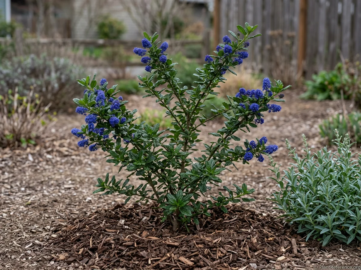 Planted as a specimen or informal screen at 6–8 foot (1.8–2.4 m) spacing on dry slopes, hillsides, and sunny borders. Effective against walls and fences where the root zone stays dry in summer. Not suitable for irrigated mixed borders or clay soils. The cobalt-blue spring flowers provide strong seasonal color and are a significant source of early-season nectar for native bees.How to Identify