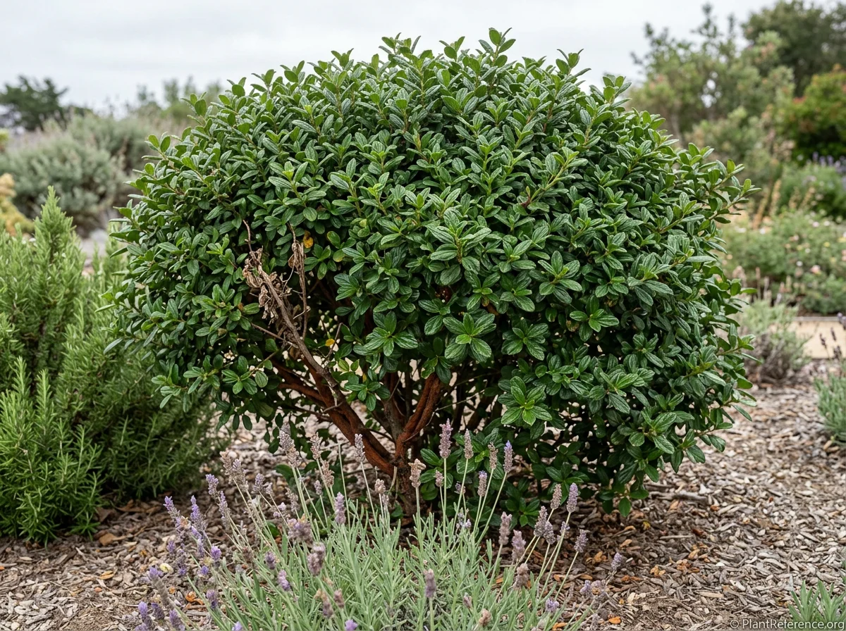A rounded to broadly upright evergreen shrub reaching 5–7 feet (1.5–2.1 m) tall and 6–8 feet (1.8–2.4 m) wide at maturity. Leaves are small, 0.5–1 inch (1.2–2.5 cm) long, broadly ovate with three prominent veins from the base, a glossy dark green upper surface, and finely toothed margins. The quilted or impressed venation is a reliable identification feature. Dense cylindrical to rounded flower clusters 0.75–1.5 inches (2–4 cm) long appear in April through May; flowers are deep cobalt-blue, among the most intensely colored of the commonly grown Ceanothus cultivars. Older stems develop reddish-brown bark. Like most hybrid Ceanothus cultivars, 'Victoria' is moderately short-lived, typically performing well for 10–20 years before declining. Established plants are highly drought tolerant and resent summer irrigation; excess moisture is the primary cause of failure. Not reliably regenerated by hard pruning.
