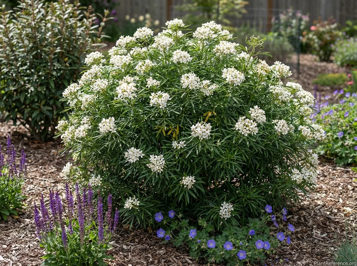 Planted as a specimen or in groups of 3–5 at 4–5 foot (1.2–1.5 m) spacing in mixed shrub borders. Suitable as an informal hedge at 3–4 foot (0.9–1.2 m) spacing. Grows in large containers of 15 gallons (57 L) or more where winters are mild. The fine-textured foliage contrasts with coarser-leaved companions such as Viburnum davidii or Mahonia.How to Identify