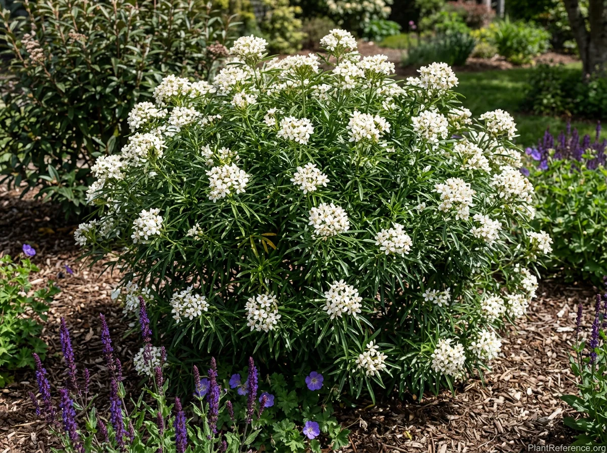 Water regularly during the first growing season; established plants tolerate moderate drought but perform best with occasional summer irrigation every 2–3 weeks in dry climates. Waterlogged soil causes root rot — ensure good drainage. Foliage may scorch in prolonged periods below 20°F (−7°C); damaged growth should be removed in spring once new growth confirms plant survival. No routine fertilization needed in average soils; in poor soils a light application of balanced fertilizer in early spring is sufficient. Spider mites may appear in hot, dry conditions; overhead watering reduces infestations. Aphids occasionally affect new growth in spring.Pruning