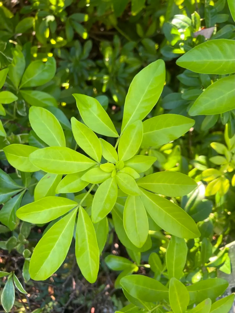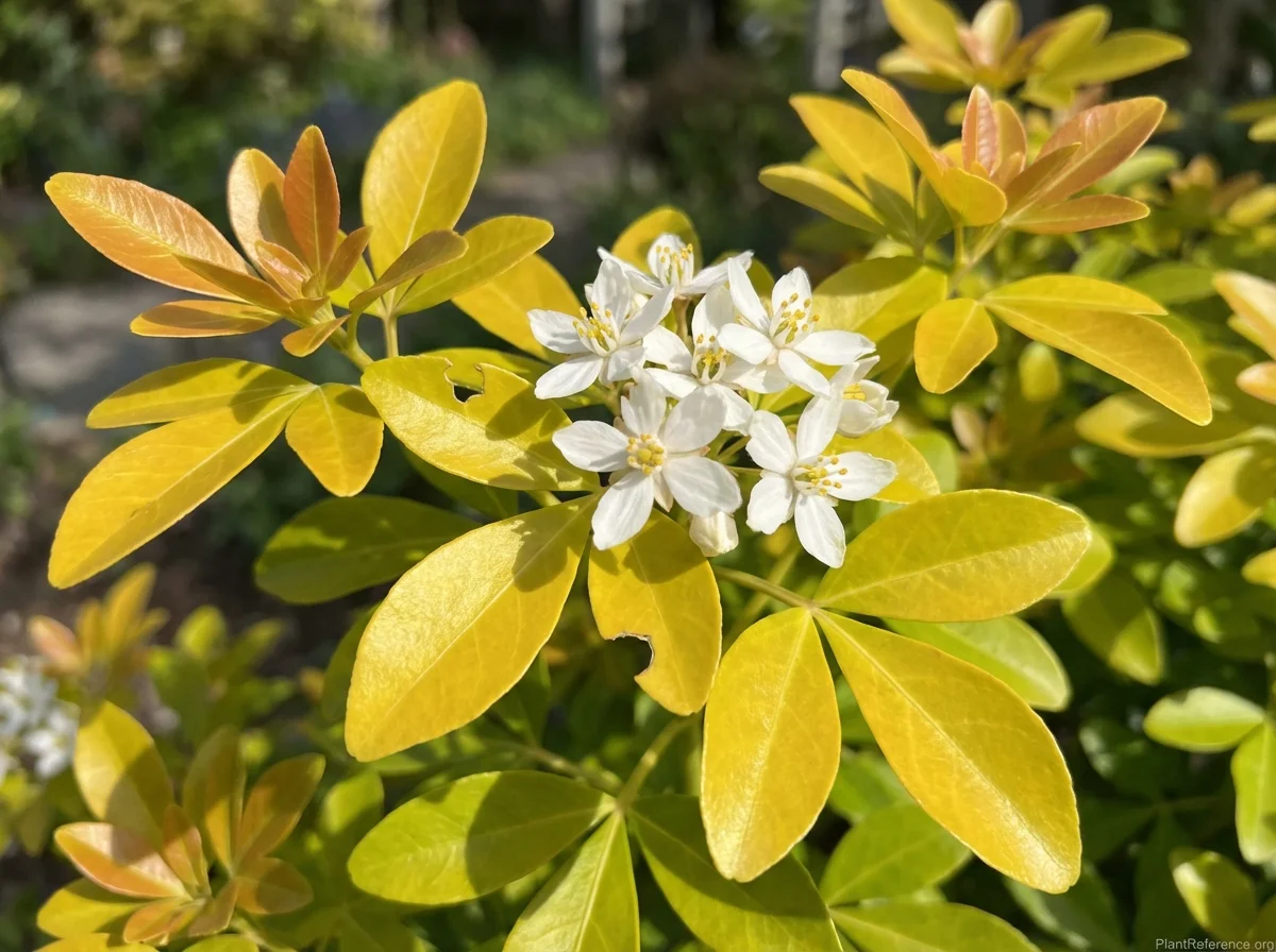 A rounded evergreen shrub reaching 4–6 feet (1.2–1.8 m) tall and wide. This cultivar of Choisya ternata is distinguished from the species by its golden-yellow to chartreuse foliage rather than the species dark green leaves. Each leaf consists of three elliptical leaflets 2–3 inches (5–8 cm) long in a trifoliate arrangement, with smooth entire margins and a glossy leathery texture. This distinguishes it from Choisya Aztec Pearl, which has 3–5 much narrower linear leaflets. New growth emerges with the most intense golden-yellow coloration, sometimes showing bronze tints in cool weather, maturing to chartreuse-green as leaves age. Foliage color is brightest in full sun (6+ hours daily) and shifts toward chartreuse-green in partial shade. White flowers 0.75–1 inch (2–2.5 cm) across with five petals and yellow stamens appear in clusters at branch tips in April–May and sporadically in September–October. All parts of the plant emit a citrus scent when crushed. The plant forms a dense rounded mound without requiring pruning to maintain shape.