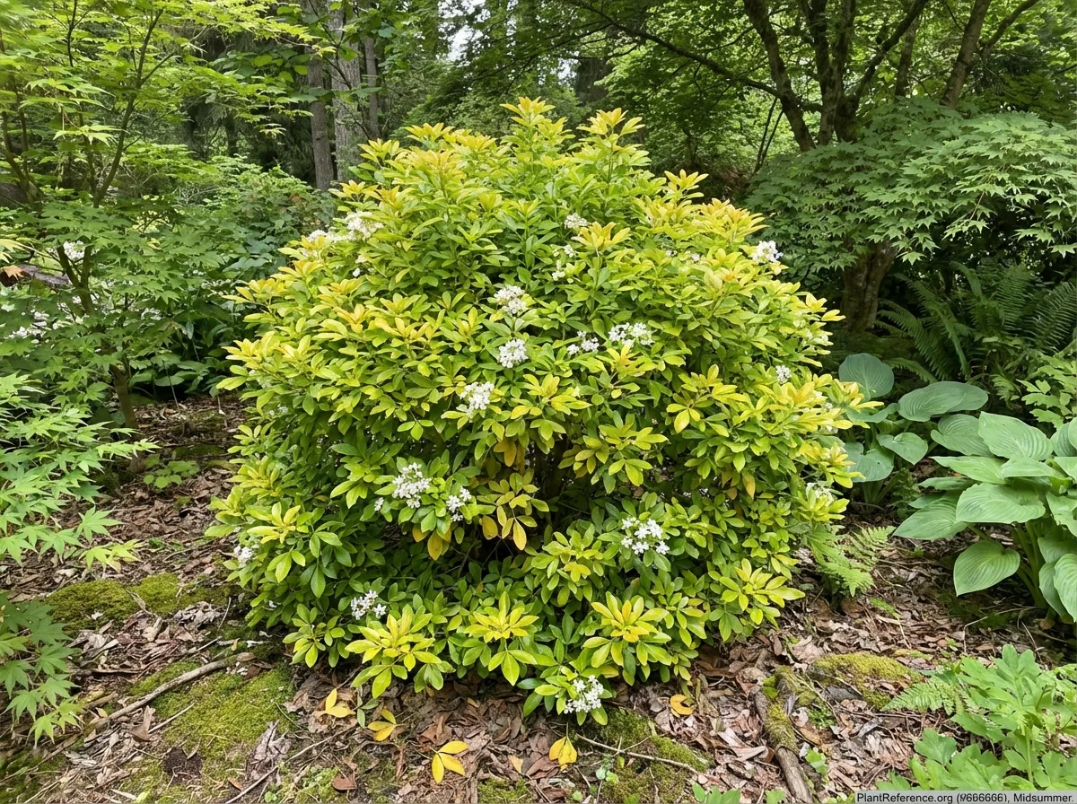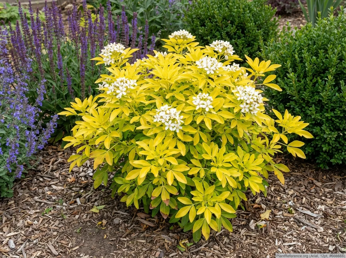 Planted as a specimen or foliage accent in mixed shrub borders where the golden coloring provides year-round contrast against dark green plants. Effective massed at 4–5 foot (1.2–1.5 m) spacing or used as an informal hedge. The foliage color contrasts with purple-leaved shrubs such as Cotinus coggygria, dark-green Buxus, or blue-grey conifers. Suitable for large containers of 10 gallons (38 L) or more in mild climates. In foundation plantings, position 3–4 feet (0.9–1.2 m) from walls to allow for mature spread.How to Identify