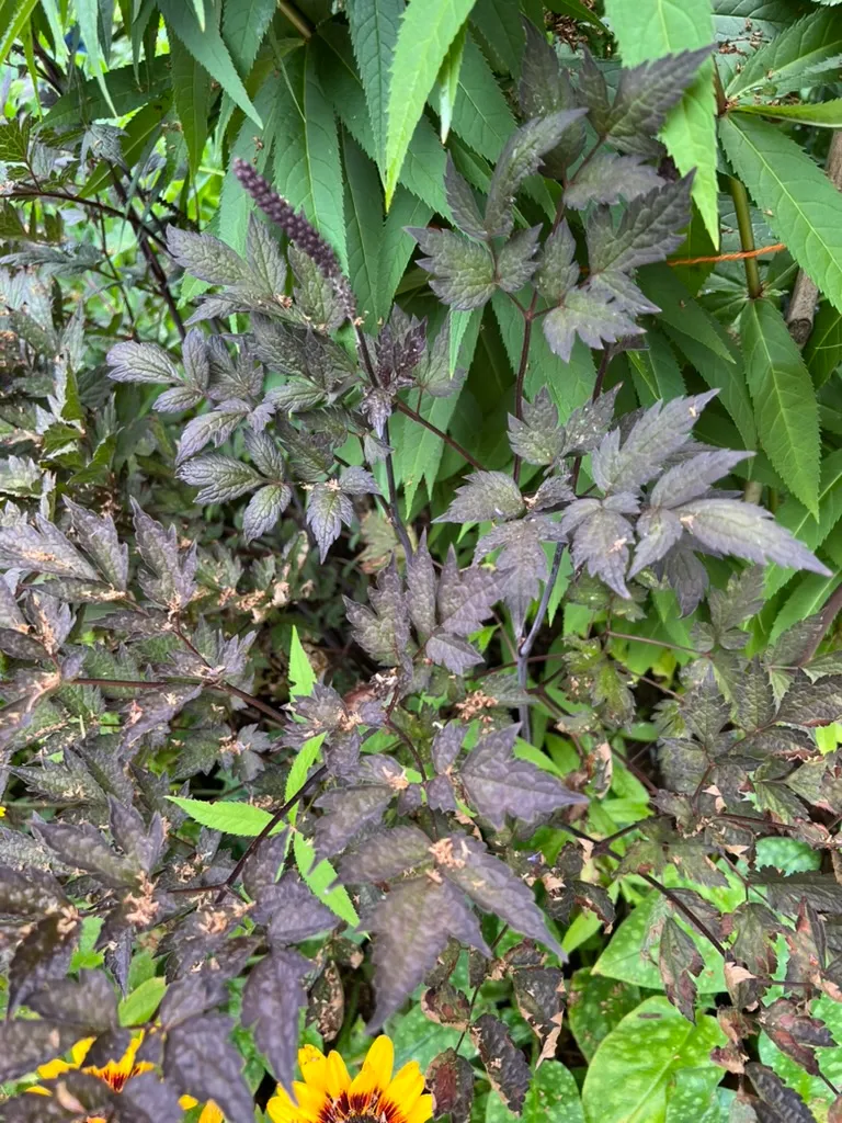 A clump-forming perennial of eastern North America in the family Ranunculaceae. Plants form basal mounds of large, compound leaves 24–36 inches (60–90 cm) tall, with leaves 2–3 times ternate and leaflets 2–4 inches (5–10 cm) long, coarsely toothed, dark green. In midsummer, tall, unbranched to lightly branched flowering scapes rise 4–8 feet (120–240 cm), bearing slender racemes 12–24 inches (30–60 cm) long of small, white flowers without petals; the white color comes from numerous stamens. Flowers have a musky, slightly unpleasant odor. Flowering stems may require staking in exposed positions. After bloom, green fruit capsules develop and ripen to black in fall — the source of the common name black cohosh. Spreads slowly by rhizomes; does not self-seed aggressively. Grows best in consistently moist, woodland conditions; declines in hot, dry summers.