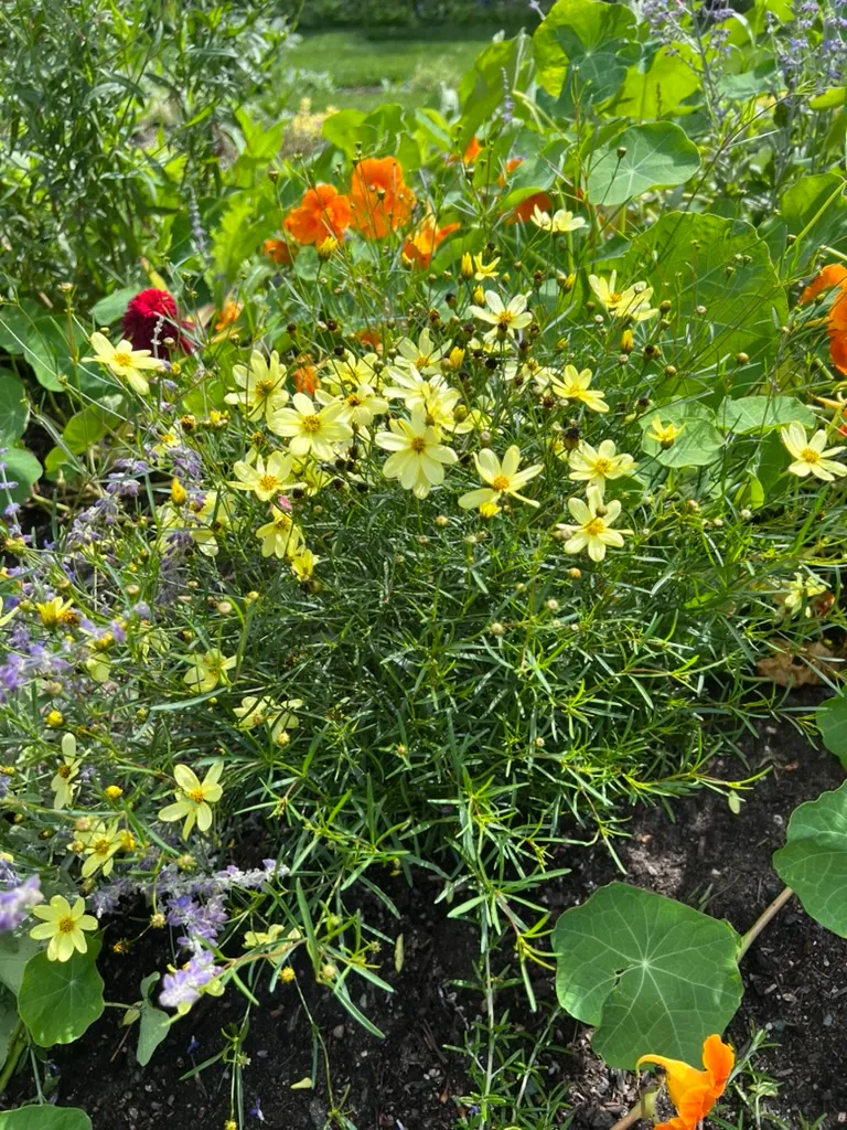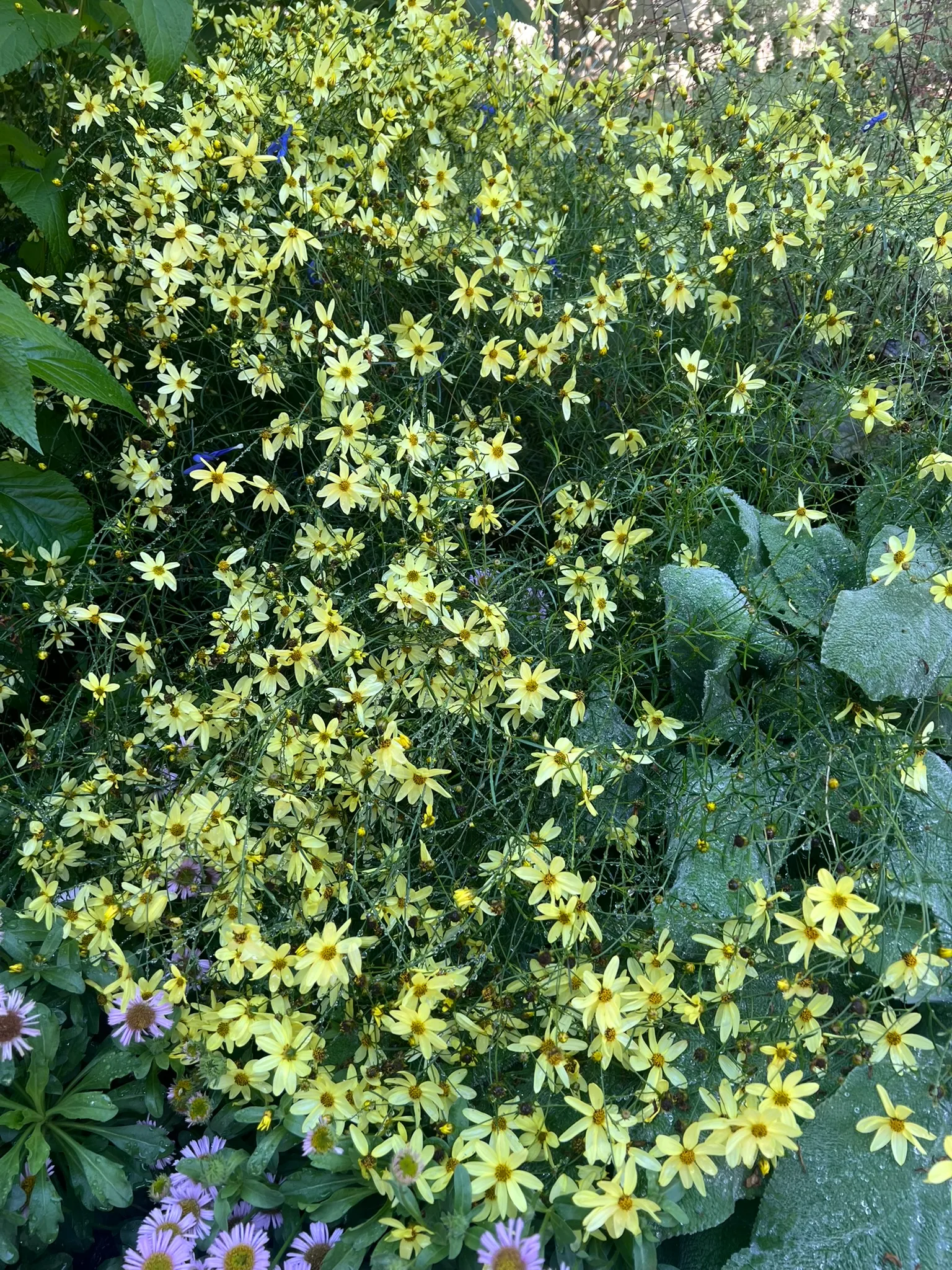 A clump-forming perennial cultivar of Coreopsis verticillata (threadleaf coreopsis), reaching 18–24 inches (45–60 cm) tall with a spread of 18–24 inches (45–60 cm). Stems are wiry and branching, clothed in very fine, thread-like leaves arranged in whorls of 3, giving the foliage a delicate, fern-like texture. 'Moonbeam' produces flower heads 1–1.5 inches (2.5–4 cm) across with pale, soft yellow ray florets — distinctly lighter than the golden yellow of the species — surrounding small yellow disc florets. Bloom is prolific and continuous from June through September with deadheading or shearing. The pale yellow flower color is the primary characteristic distinguishing 'Moonbeam' from other C. verticillata cultivars such as 'Zagreb' (golden yellow) and 'Grandiflora' (deep gold). Plants spread by short rhizomes, forming gradually widening clumps. Performs better in lean soils; rich soils cause floppy stems and reduced flower production. Hardy to zone 3.