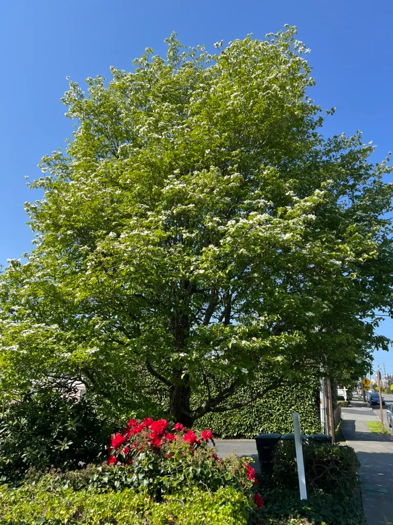 Cornus nuttallii (Pacific dogwood, western dogwood) is a large deciduous tree native to the Pacific Coast from southern British Columbia south to southern California, reaching 20–50 feet (6–15 m) tall and 15–30 feet (4.5–9 m) wide in the wild, typically smaller in cultivation. It is the Washington State floral emblem and one of the most magnificent native flowering trees of the Pacific Northwest. In April through May, before or as the leaves emerge, 4–6 large white bracts 1–3 inches (2.5–7.5 cm) long surround a central cluster of 30–40 tiny true flowers — the overall flower head can reach 4–6 inches (10–15 cm) across, larger than any other dogwood species in common cultivation. A second, lighter bloom often occurs in August through September. The horizontal tiered branching pattern creates exceptional four-season architectural structure. Clusters of tightly packed red to orange-red berries 0.25 inch (6 mm) develop in fall, attracting birds. Fall foliage turns red to reddish-purple. Critical limitation in cultivation: like Cornus florida, Pacific dogwood is highly susceptible to dogwood anthracnose (Discula destructiva). Wild populations in PNW forests have suffered severe declines since the 1980s. In garden cultivation, the tree is more successful than in forest settings when given open, sunny, well-drained conditions with excellent air circulation — replicating the woodland edge habitat where it grows best naturally. It resents transplanting and disturbance around the root zone; nursery-grown plants establish better than collected specimens.
