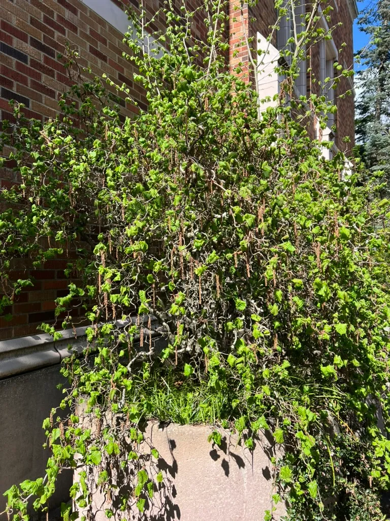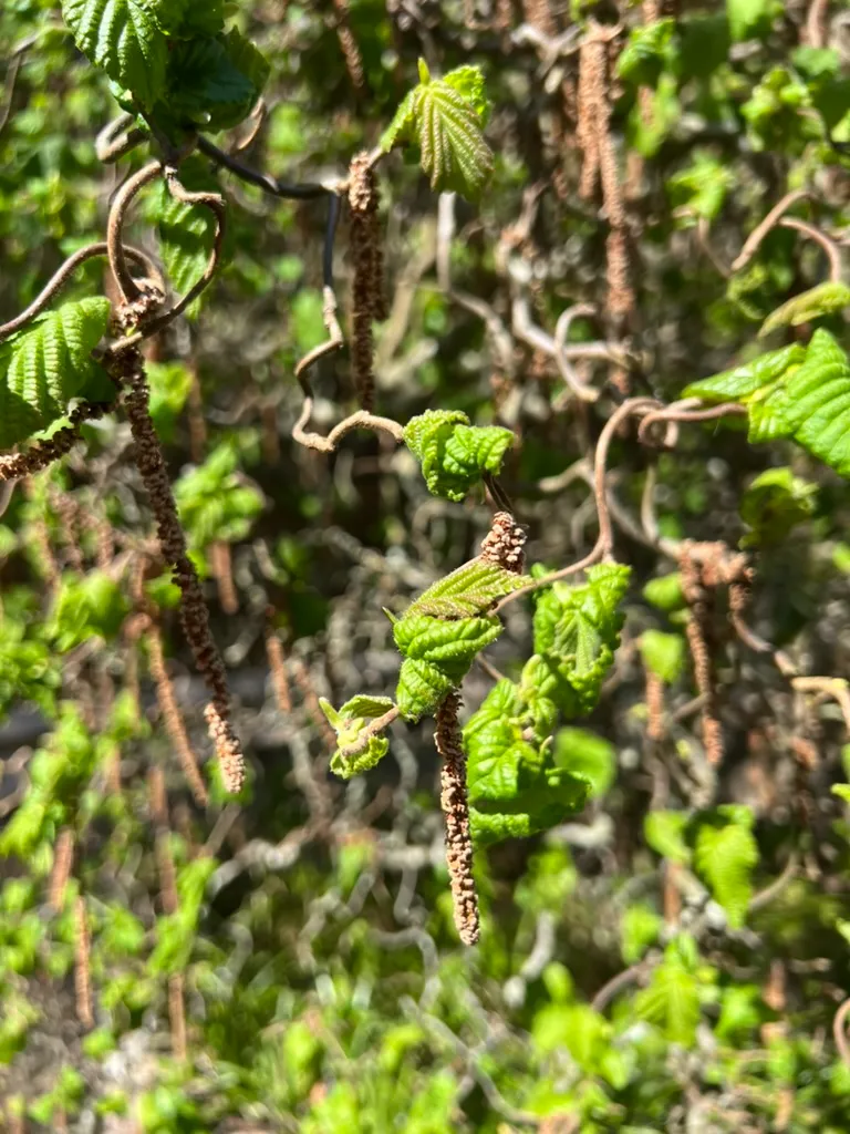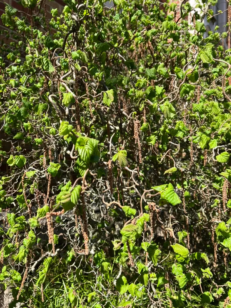 Corylus avellana 'Contorta' (Harry Lauder's walking stick, corkscrew hazel, contorted filbert) is a deciduous shrub grown entirely for its bizarre and spectacular winter architecture — every stem, branch, and twig twists, spirals, corkscrews, and zigzags in random directions, creating a living sculpture of extraordinary character. It reaches 8–10 feet (2.4–3 m) tall and 8–10 feet (2.4–3 m) wide over many decades, growing slowly. The contorted form is a natural mutation of the common European hazel (Corylus avellana) discovered in England around 1863. In January through February, long pendulous yellow male catkins 1.5–3 inches (4–8 cm) drape from every twisted twig — a striking effect as they hang and sway from the contorted framework in late winter. The leaves are also somewhat crinkled and contorted but are not the primary attraction and create a rather crowded, cluttered summer appearance. The plant is most impressive in winter when bare, and many gardeners appreciate it most from November through March. Critical cultivation note: commercially sold plants are almost always grafted onto straight Corylus avellana rootstock. Vigorous upright straight suckers from the rootstock must be removed at their point of origin immediately upon appearance — if ignored, the straight rootstock will outgrow and eventually replace the contorted grafted portion entirely.