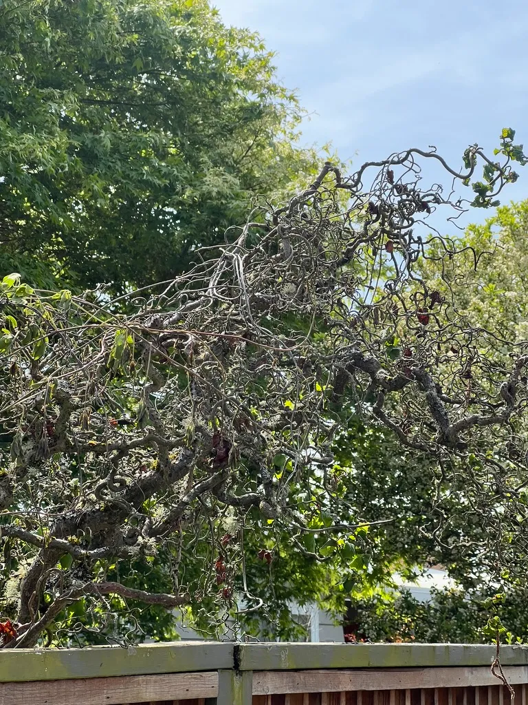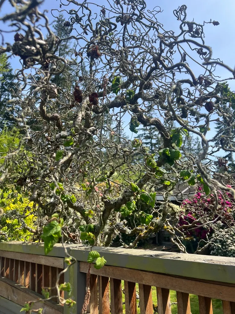 Minimal pruning needed beyond sucker removal. Remove any dead or diseased branches in late winter. The natural contorted form should not be shaped or thinned — the complex, dense tangle of twisted branches is the entire point. If eastern filbert blight cankers appear, prune 6–8 inches (15–20 cm) below the discolored area with sterilized tools. Remove rootstock suckers throughout the growing season at their point of origin.Pruning Schedule