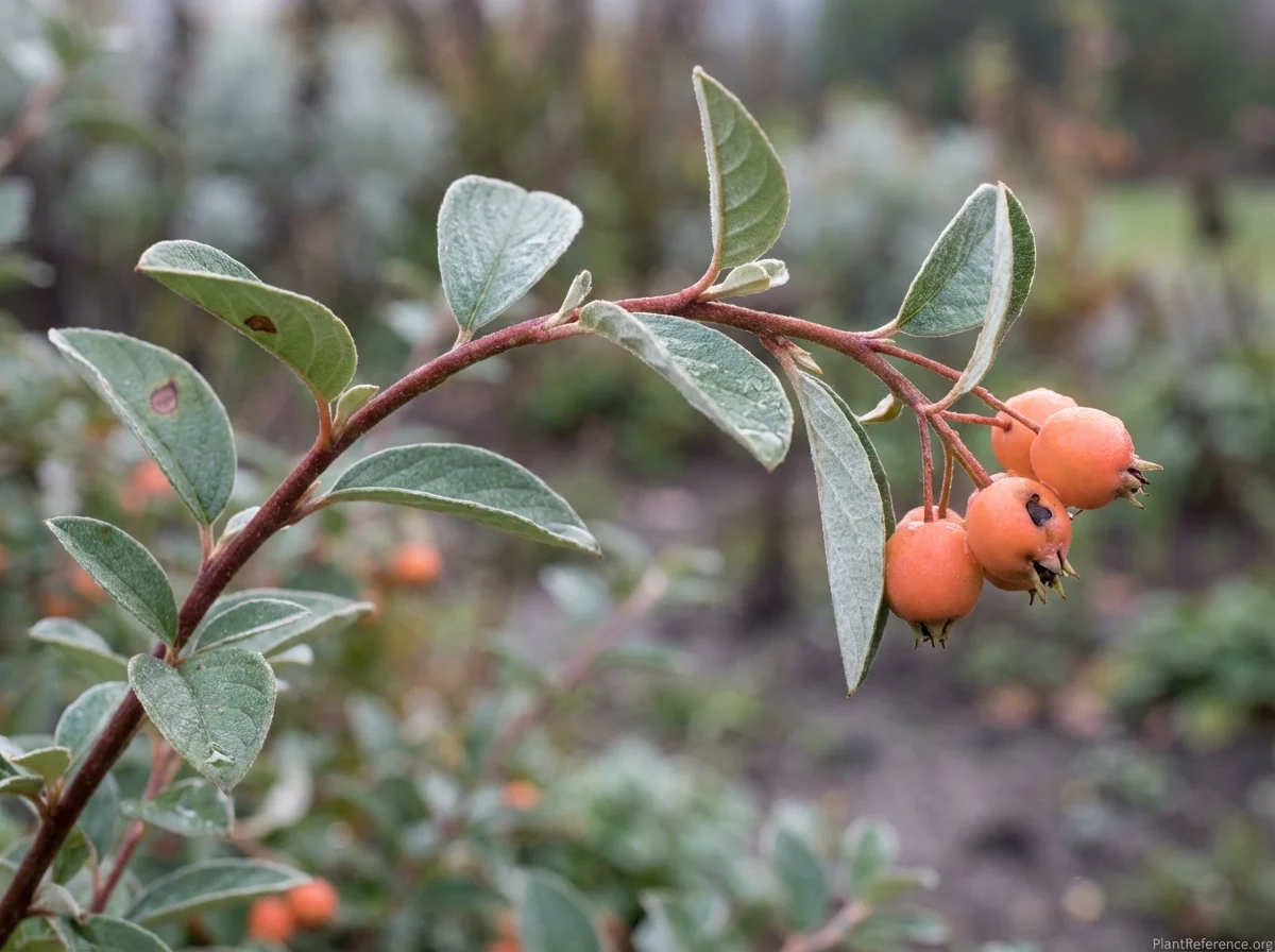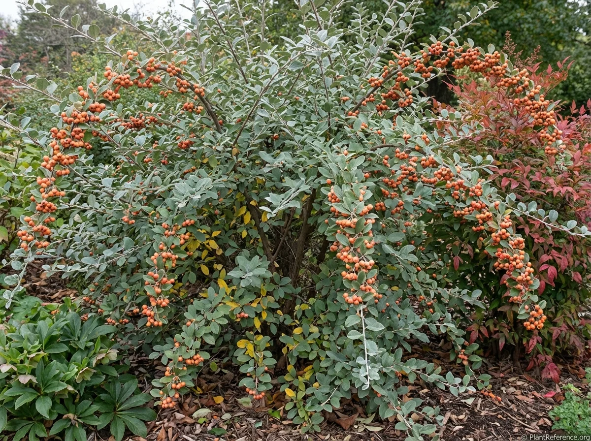 Cotoneaster franchetii is a semi-evergreen to evergreen shrub reaching 5–7 feet (1.5–2.1 m) tall with a spread of 5–8 feet (1.5–2.4 m). Branches arch outward and upward in a fountain-like form. Leaves are oval, 1/2–1 inch (1.3–2.5 cm) long, with a dull grayish-green upper surface and a densely white-tomentose underside; the felted underside is visible when branches move and creates a two-toned effect. Foliage is retained through mild winters but may drop partially in temperatures below 10°F (−12°C), making the plant semi-evergreen in colder climates. Small pinkish-white flowers appear in corymbs of 5–15 blooms in late spring. Orange-red to salmon-orange berries, 1/4–3/8 inch (6–9 mm) in diameter, ripen in fall and persist through December into February if not consumed by birds. Growth rate is moderate; plants approach mature dimensions in 5–8 years. The open, arching structure can become leggy without occasional pruning to remove oldest canes.