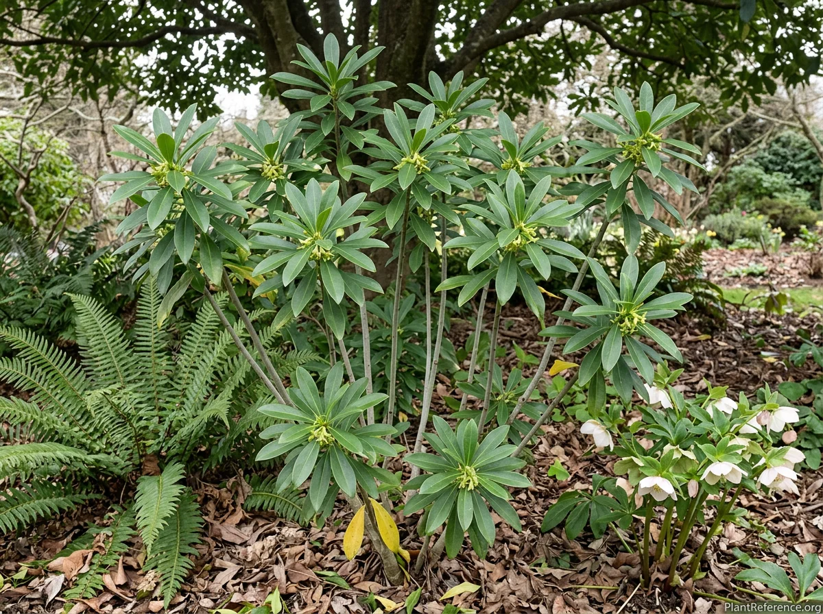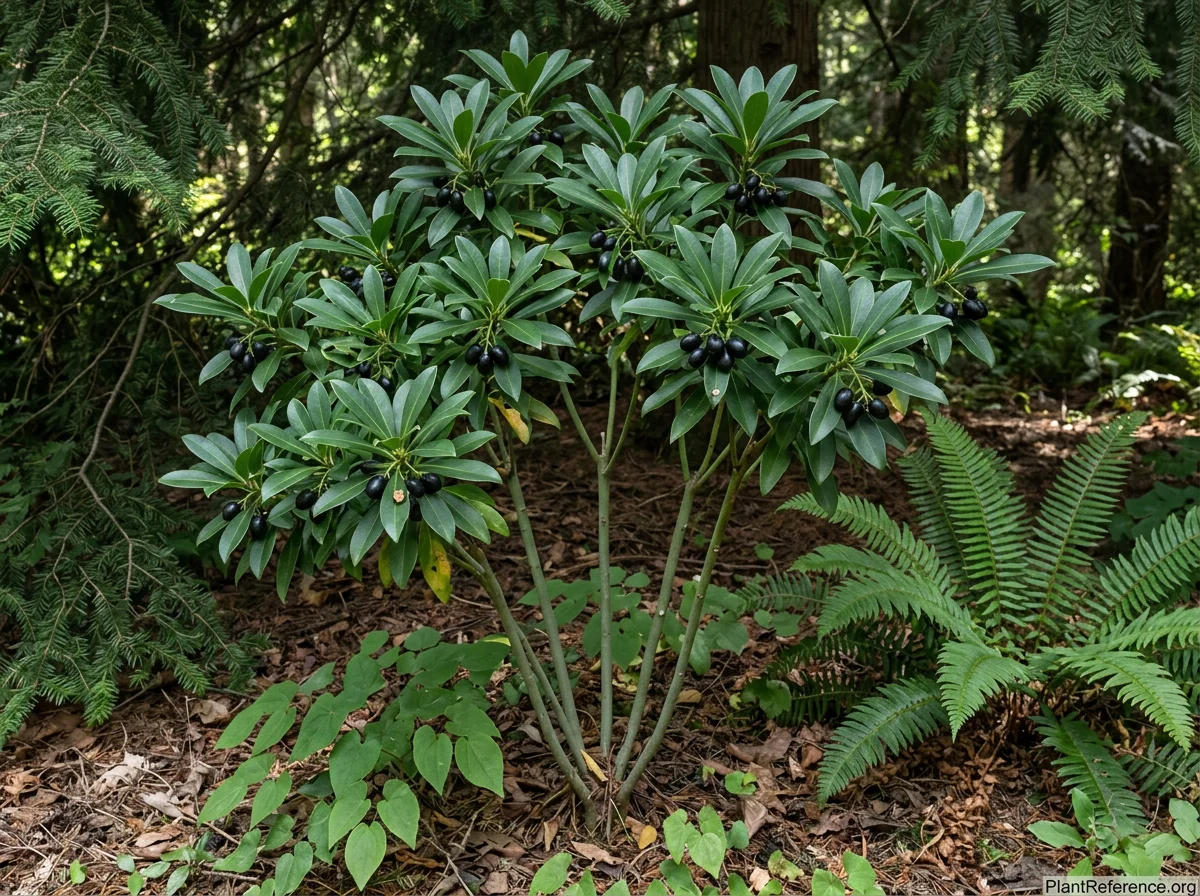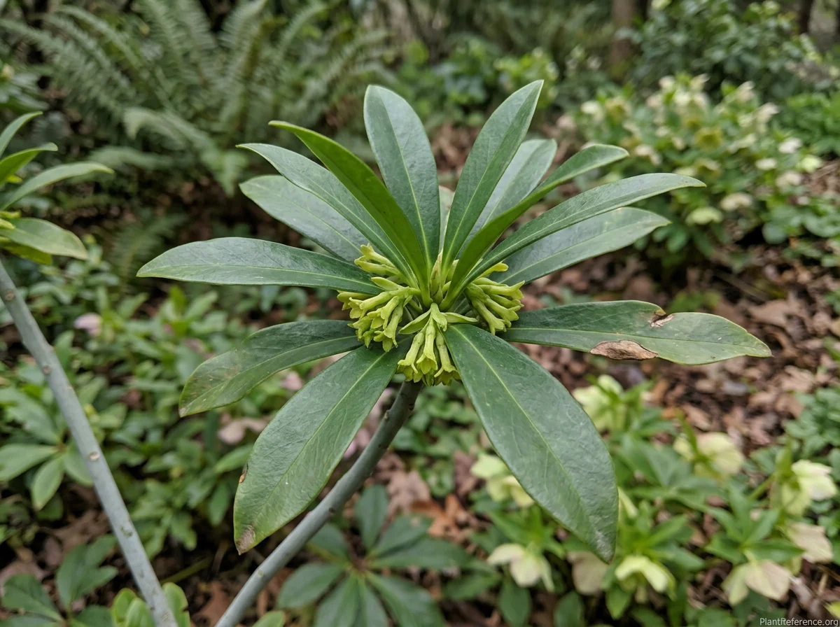 Daphne laureola is an evergreen shrub reaching 3–4 feet (0.9–1.2 m) tall with a spread of 3–4 feet (0.9–1.2 m). Stems are upright and largely unbranched, bearing leaves clustered predominantly near the tips in whorled or sub-whorled arrangements. Leaves are oblong to narrowly oblanceolate, 2–4 inches (5–10 cm) long, with a glossy dark green upper surface and a paler underside; margins are entire. The clustered leaves near stem tips give the plant a distinctive architectural, somewhat palm-like appearance. In late winter to early spring (February–March), clusters of 5–10 small tubular greenish-yellow flowers appear in the leaf axils at branch tips; flowers are not conspicuous but produce a subtle sweet fragrance that is most noticeable in the evening or on warm still days. Small oval black berries, approximately 1/4–3/8 inch (6–9 mm) long, develop in late spring to summer if pollinated; these are highly toxic to humans and animals. The plant is notably tolerant of dry shade — a characteristic that distinguishes it from most other broadleaf evergreen shrubs. Growth rate is slow; plants approach mature dimensions in 6–10 years. D. laureola has naturalized and become invasive in parts of western Washington, western Oregon, and British Columbia; gardeners in the Pacific Northwest should be aware of its potential to spread via bird-dispersed seeds in woodland environments.