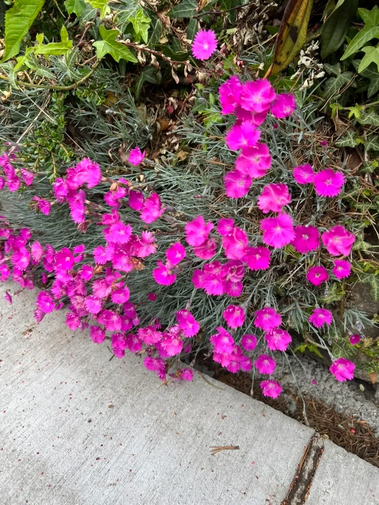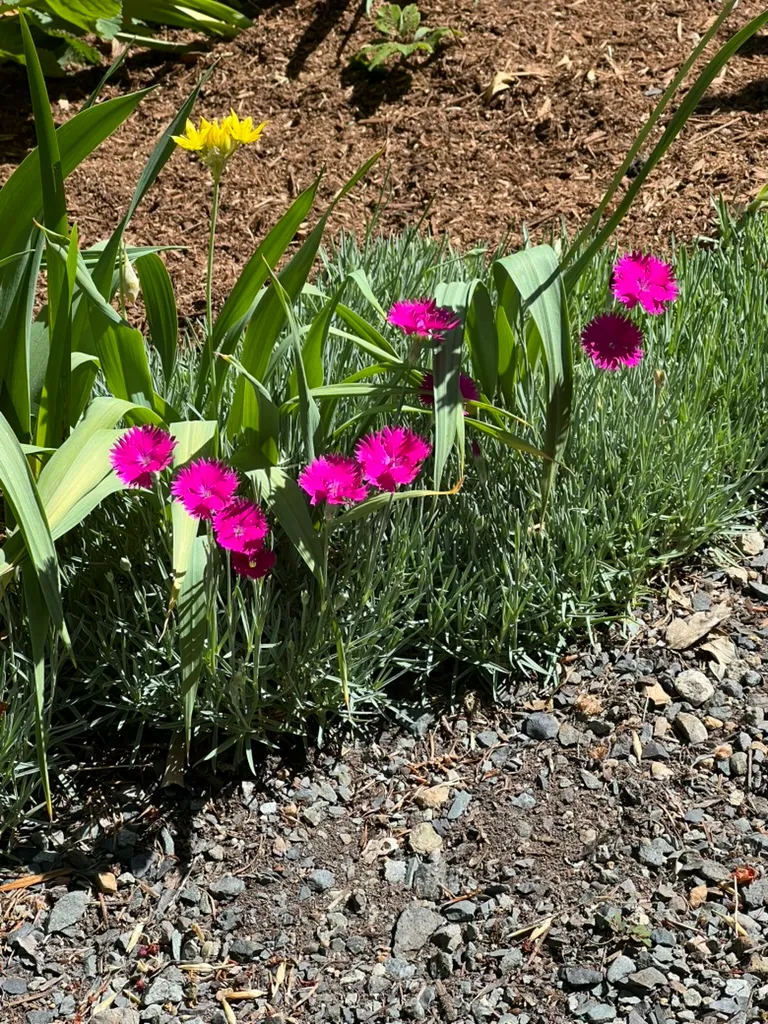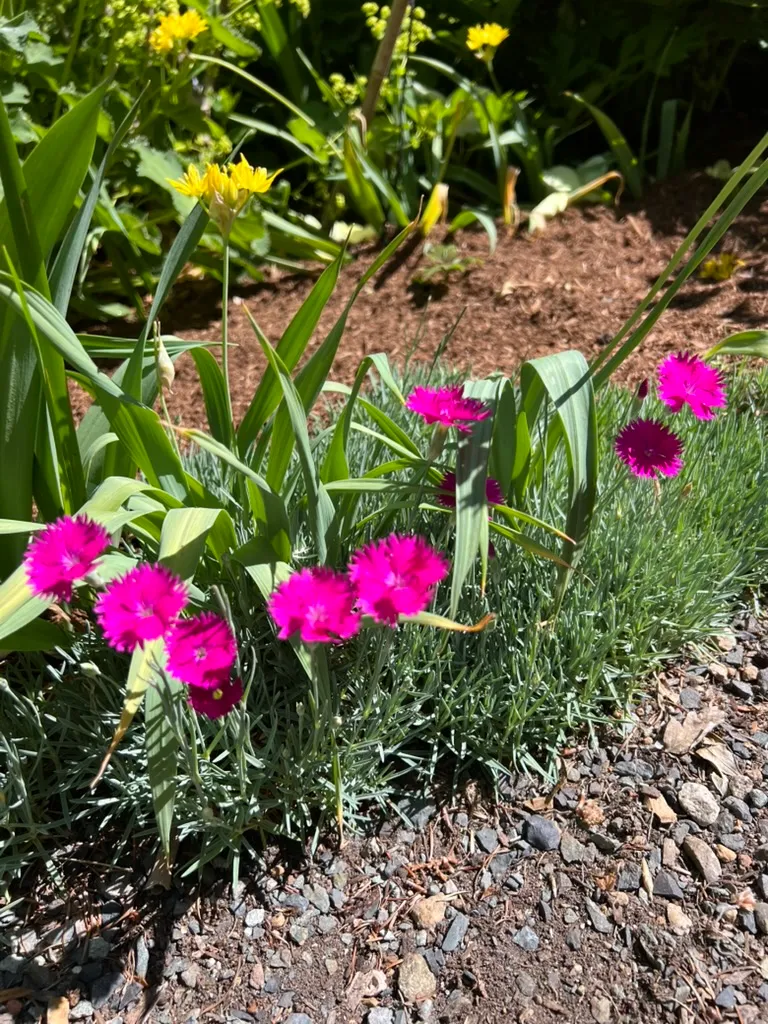 Dianthus barbatus, commonly called sweet William, is a herbaceous biennial or short-lived perennial in the family Caryophyllaceae, native to southern Europe and parts of Asia, from the Pyrenees east through the Balkans to Russia. Plants grow 12–24 inches (30–60 cm) tall with opposite, lance-shaped bright green leaves joined at swollen nodes. In late spring to early summer, dense, flattened clusters (corymbs) of up to 30 flowers, each 0.8–1.2 inches (2–3 cm) across with five fringed-edged petals, are produced at stem tips in white, pink, red, salmon, purple, and bicolored or eyed combinations. Wild plants produce red flowers with a white basal zone; the species has been cultivated since at least the sixteenth century and a vast range of cultivars exists. The flowers carry a light, spicy-sweet clove fragrance. Grown as a biennial in most Pacific Northwest gardens — sown in summer, overwintered as a rosette, and flowering the following year — though perennial strains exist. Mildly toxic; may cause skin irritation in sensitive individuals and mild gastrointestinal upset if ingested in large quantities by pets.