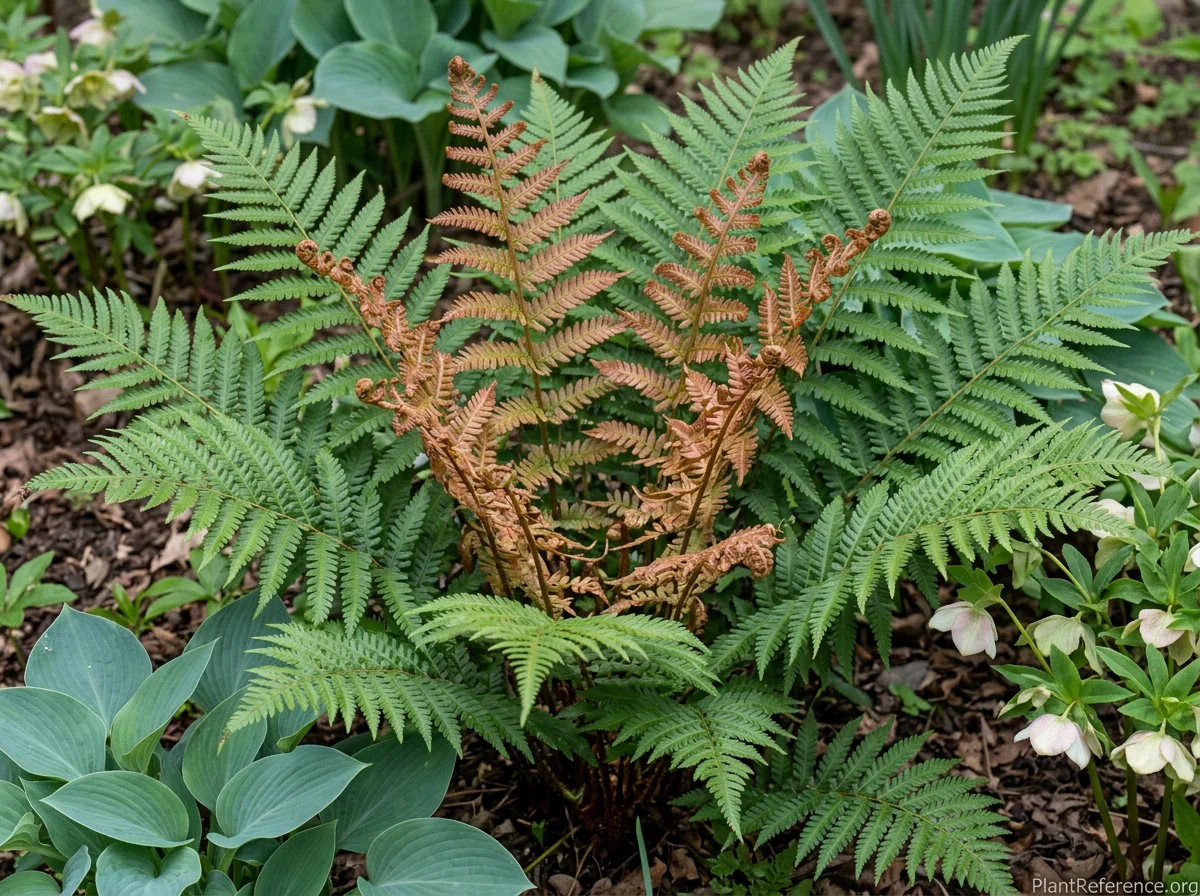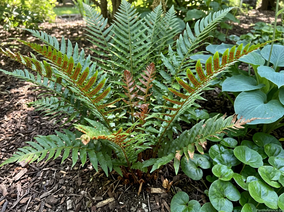Planted in shade gardens as a groundcover or as a specimen providing a long season of color from coppery new growth. Used in woodland gardens alongside spring bulbs and shade perennials. The coppery new growth provides strong contrast against dark-foliaged companions. The evergreen habit in zones 6–9 provides winter structure when most other ferns are dormant. Suitable under deciduous trees or on north-facing slopes where consistent shade is available.How to Identify