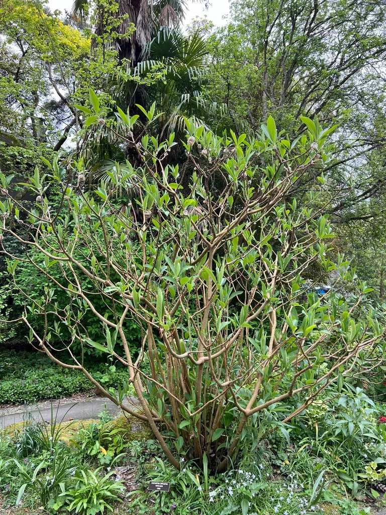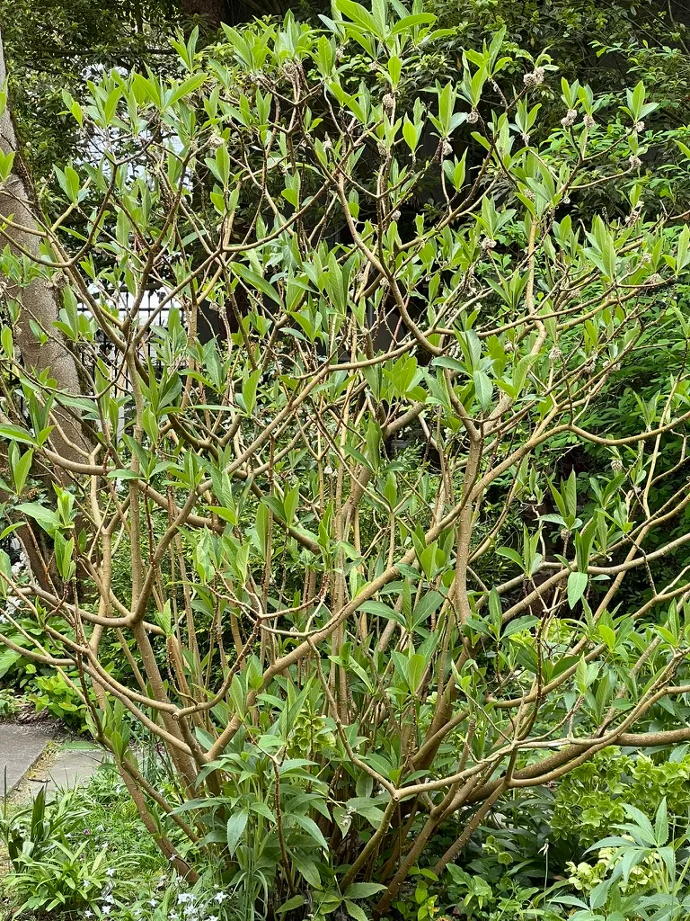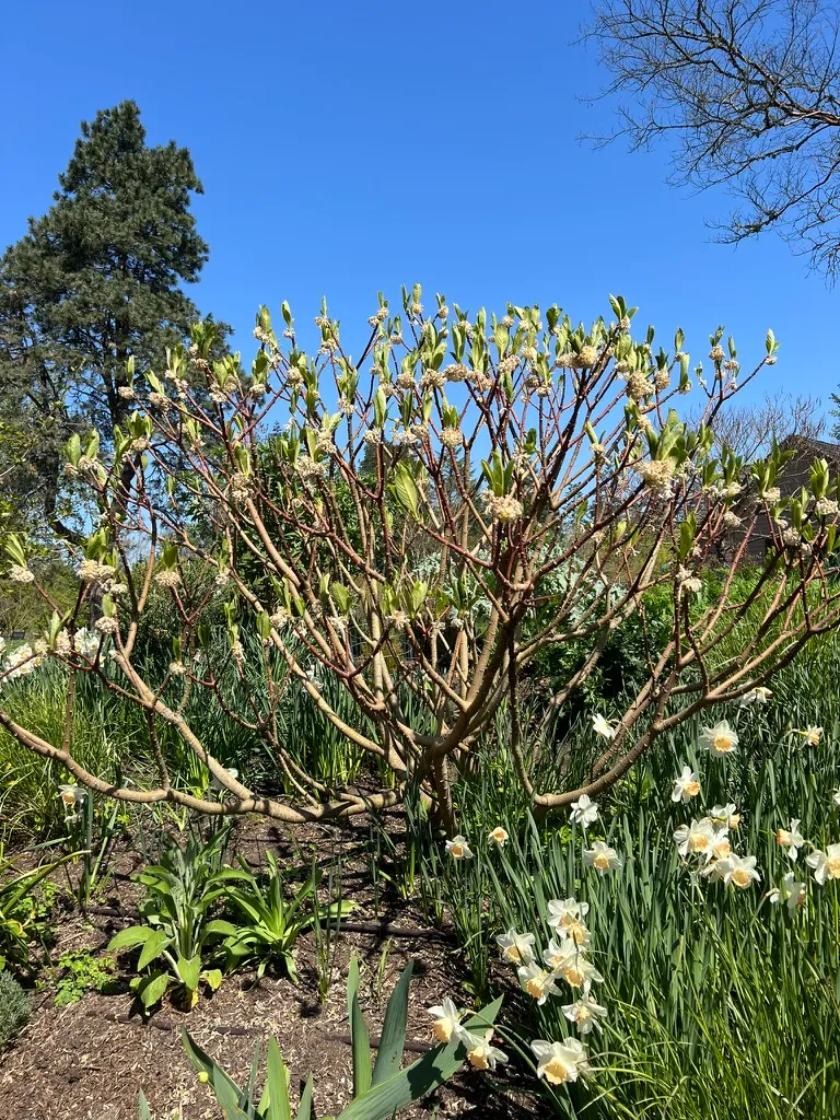 Grown as a specimen shrub for exceptional year-round interest — Great Plant Picks endorsed for PNW gardens. The winter flower bud display (November through February) followed by the intensely fragrant silver-and-gold flowers (February through March) makes this one of the finest choices for winter garden impact. Site near a path or seating area where the February fragrance and the architectural triple-forking branch structure can be appreciated. The PNW's mild maritime winters are ideal — flower buds rarely suffer severe frost damage in the lowland areas. Particularly effective in woodland gardens where it combines with Hellebores, early bulbs, and Hamamelis. The cultural story of mitsumata paper adds an engaging historical dimension to this plant.How to Identify