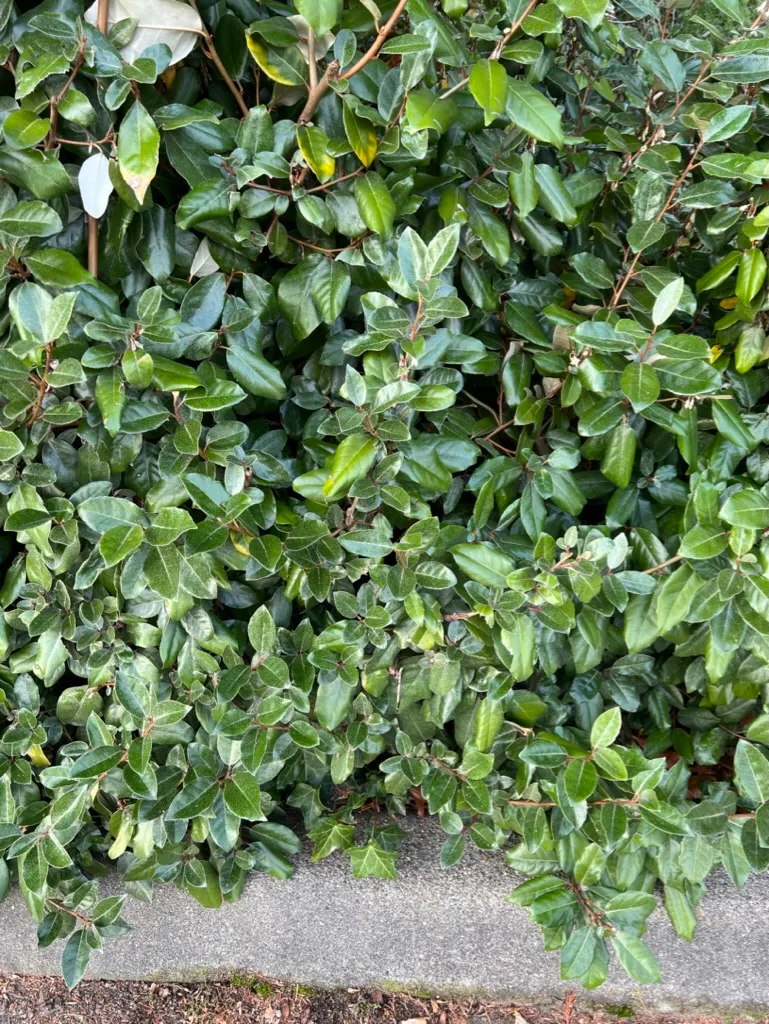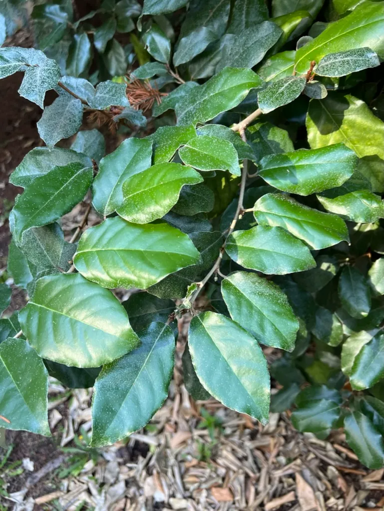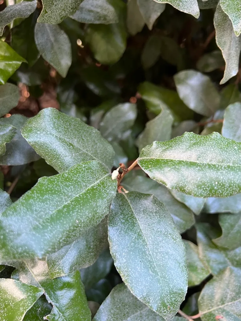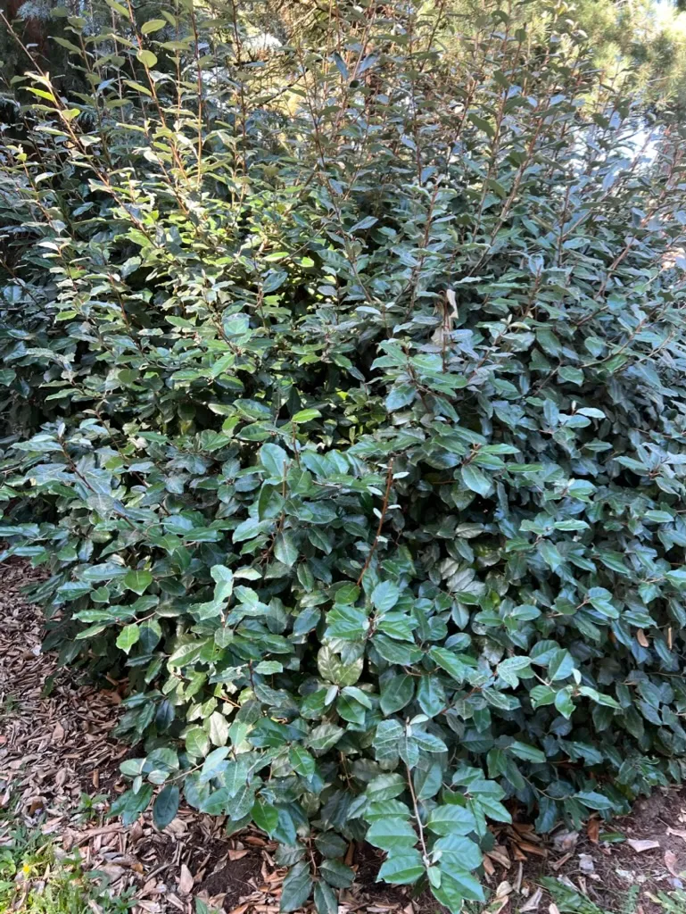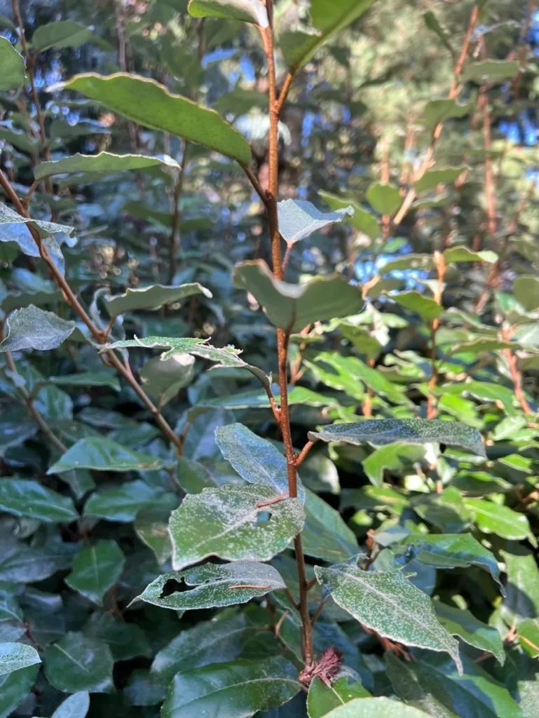 Elaeagnus pungens is an evergreen shrub reaching 8–12 feet (2.4–3.7 m) tall with a spread of 8–12 feet (2.4–3.7 m). Stems are often armed with stiff thorns 1/2–1 1/2 inches (1–4 cm) long; young stems are covered in rust-colored to silvery scales. Leaves are leathery, oval to oblong, 2–4 inches (5–10 cm) long with wavy margins; the upper surface is dark green with a slightly dull sheen, and the underside is densely covered in silvery-white scales giving a bright silver appearance — the two-toned effect is most visible when wind moves the foliage. The plant forms a broad spreading to arching mound, often with long arching shoots. In October through November, small tubular white flowers approximately 1/4 inch (6 mm) long appear in clusters of 3–7 in the leaf axils, largely hidden by foliage; they produce an intensely sweet, honey-like fragrance disproportionate to their size. Fruits are small, oval, initially silver-scaled, ripening to reddish-brown by spring; edible but not palatable. Growth is vigorous; plants reach mature dimensions in 5–8 years and may continue to expand. The species fixes atmospheric nitrogen through root-associated actinomycetes, improving poor soils over time.